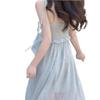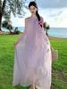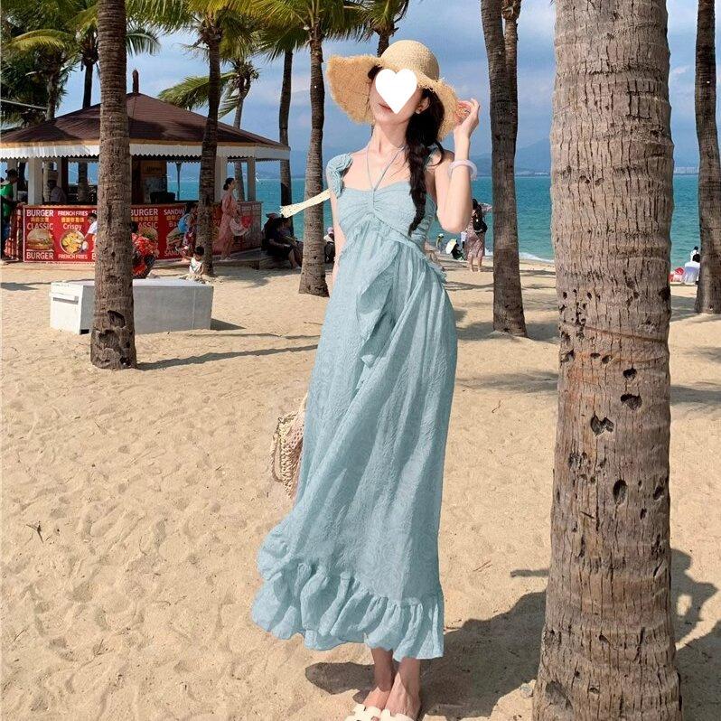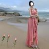 Deseo Puro Cintura Dulce Playa Tirantes Falda Larga Vacaciones Junto al Mar Temperamento Vestido Rosa