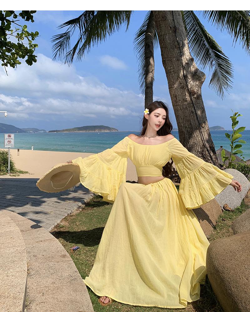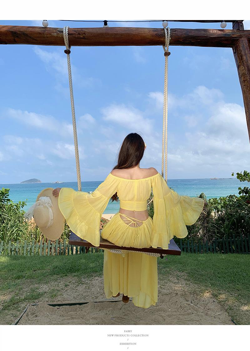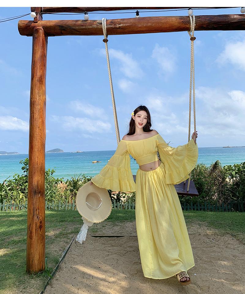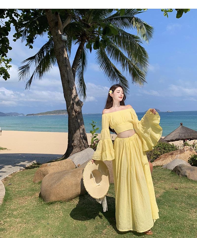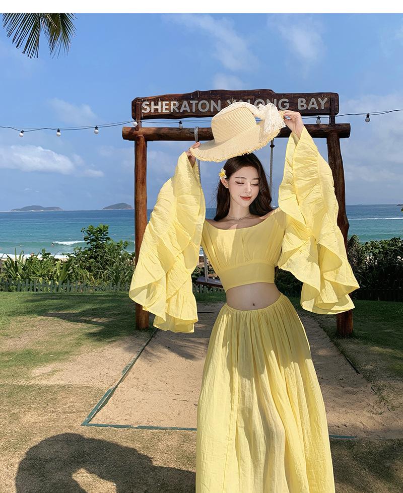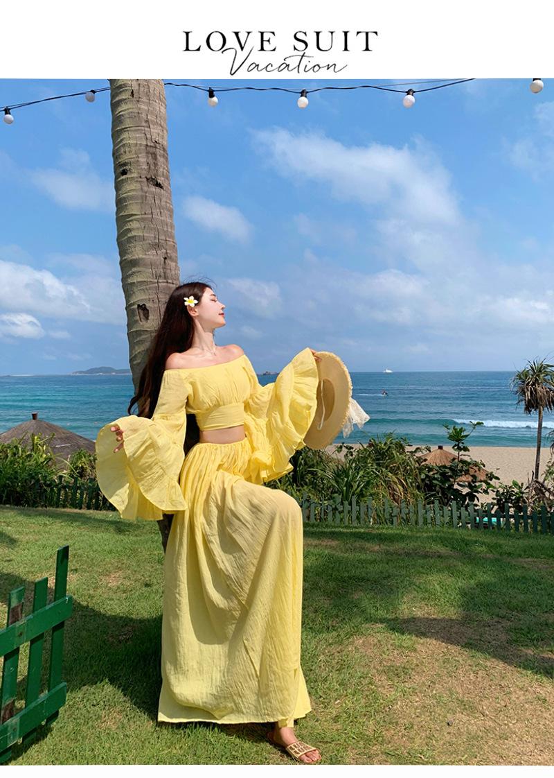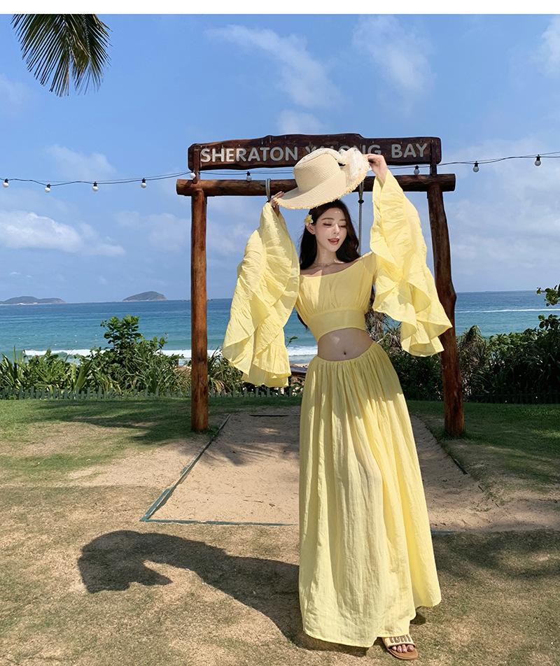 Vacaciones Junto al Mar Top de Un Hombro con Volantes y Manga Campana y Falda Larga Vestido de Dos Piezas para Mujer Traje Dopamina