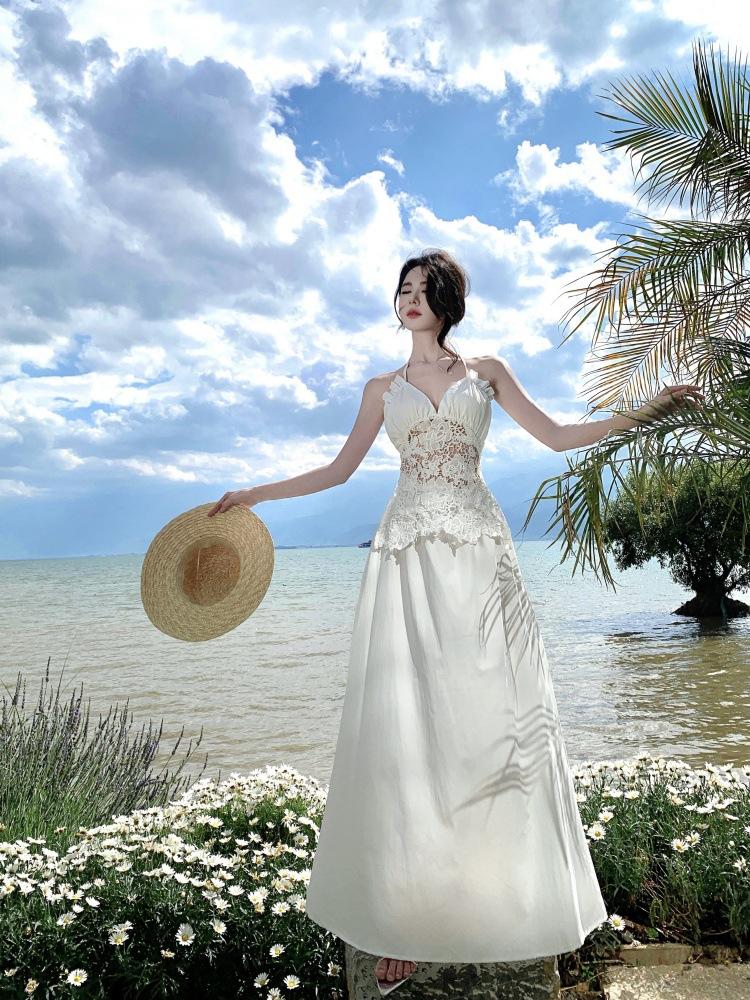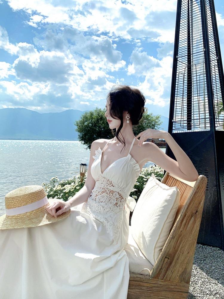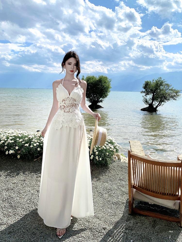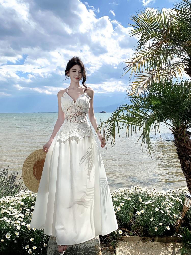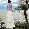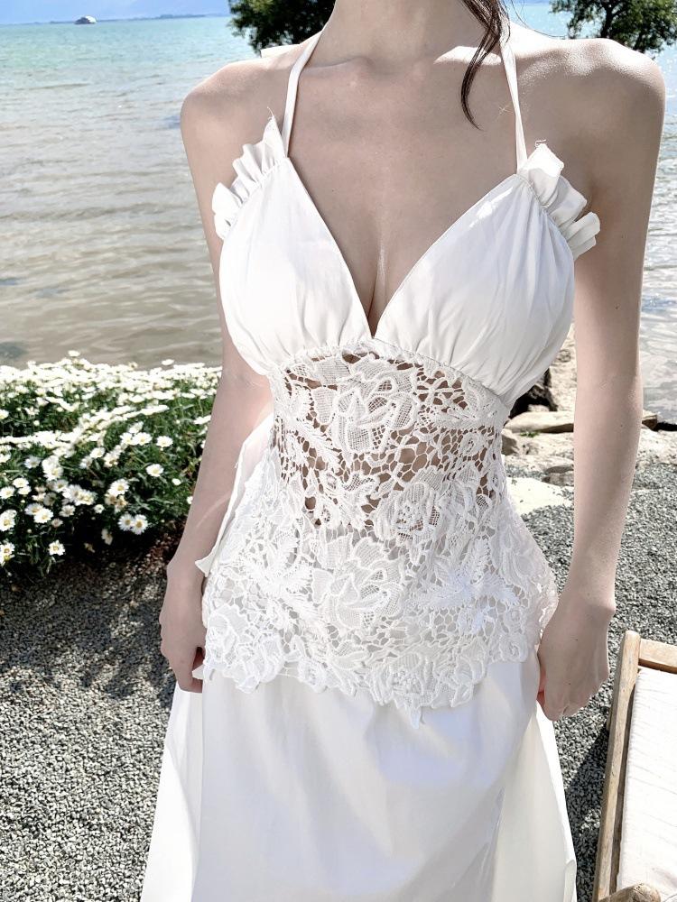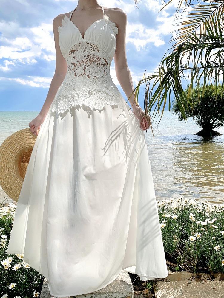 Vestido de verano para mujer, sexy, de encaje blanco, con escote en V, sin mangas, con lazo y espalda descubierta, vestido largo con cintura para vacaciones