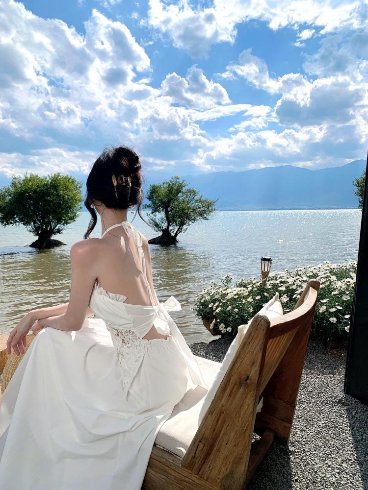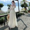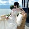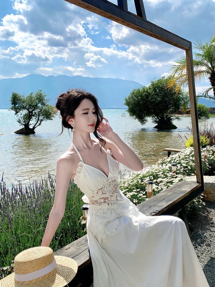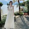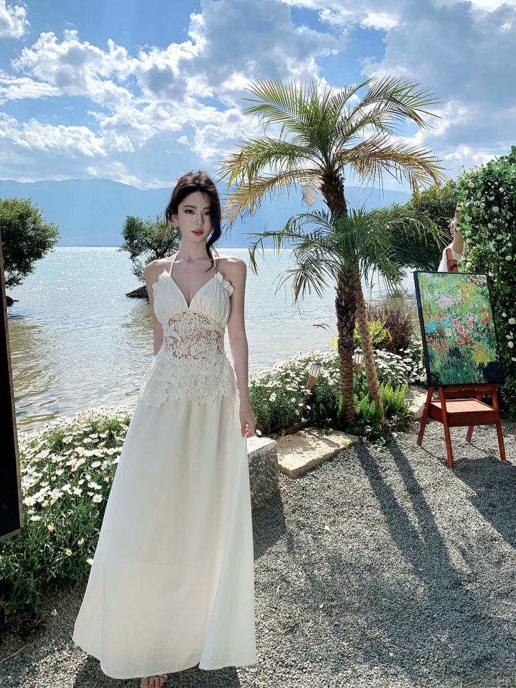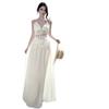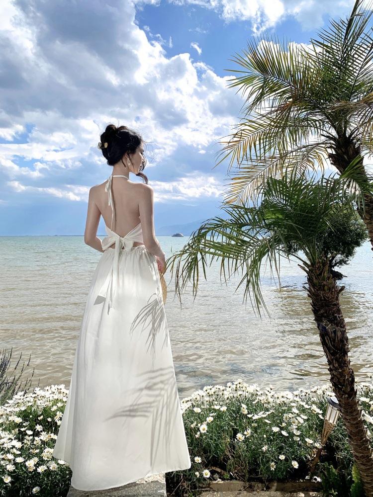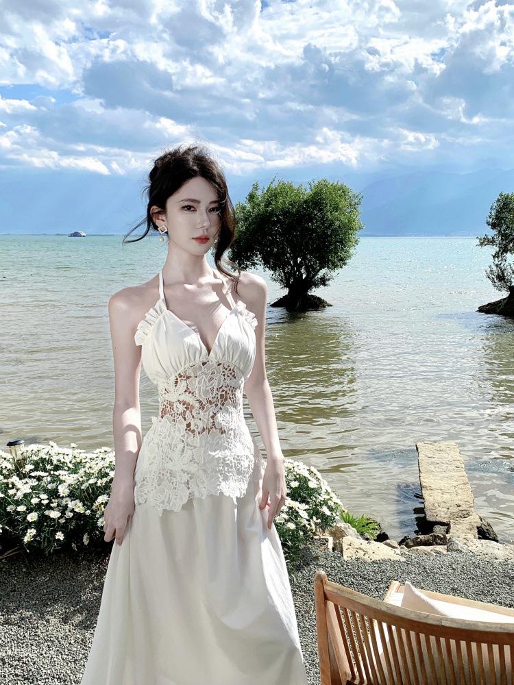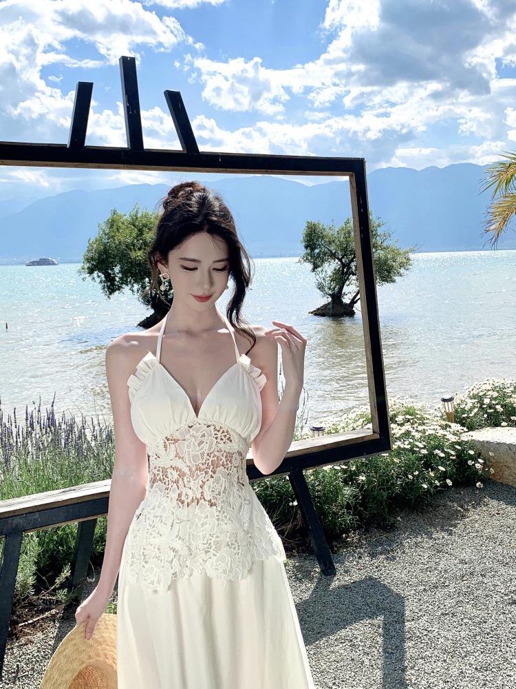 Vestido de verano para mujer, sexy, de encaje blanco, con escote en V, sin mangas, con lazo y espalda descubierta, vestido largo con cintura para vacaciones