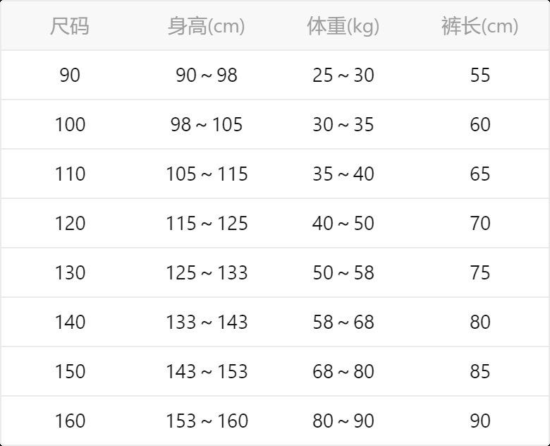 100cm, 110cm, 120cm, 130cm, 140cm, 150cm, 160cm