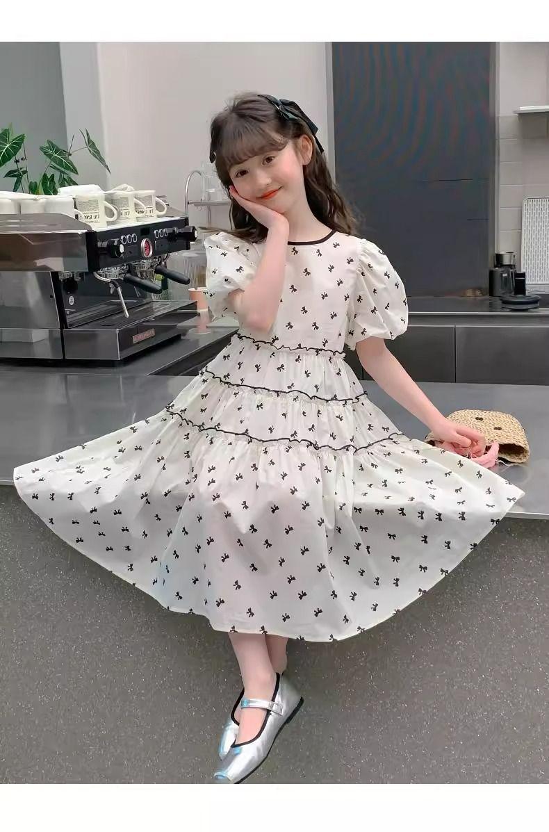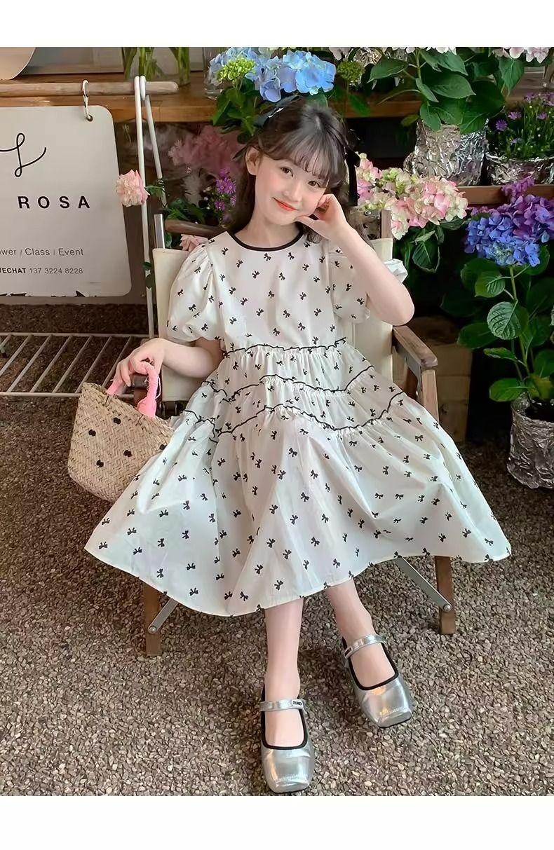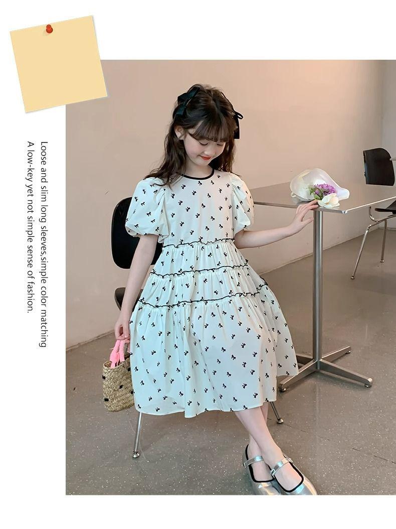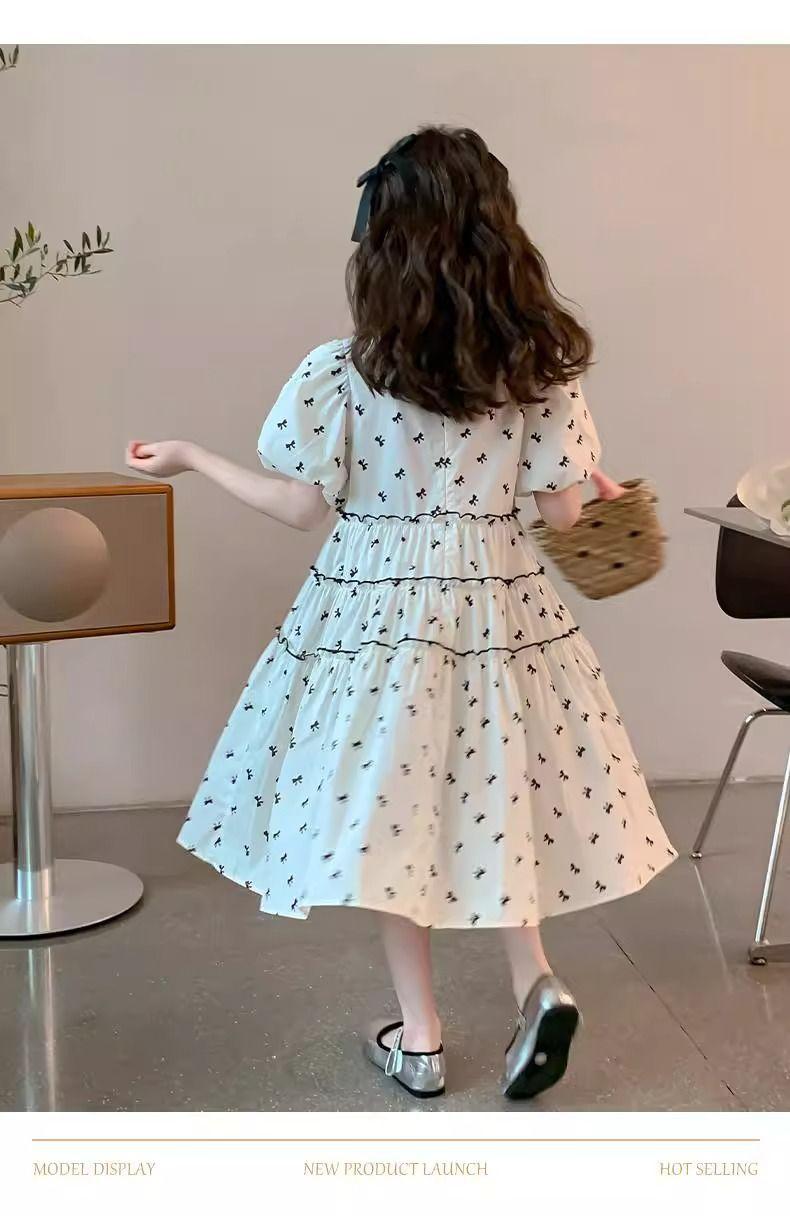 Vestido de Niña Cuello Redondo Francés Diseño de Verano Estampado de Lazo Manga Abullonada Falda Vestido de Princesa para Niños