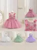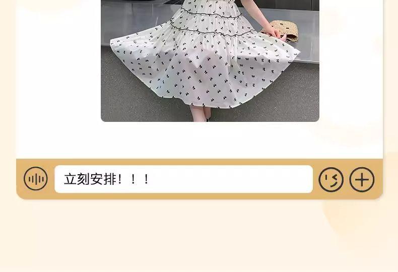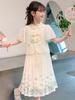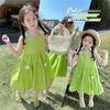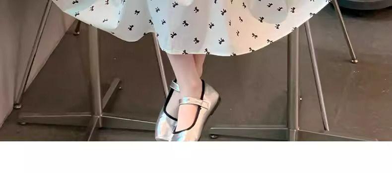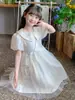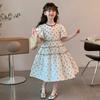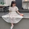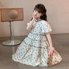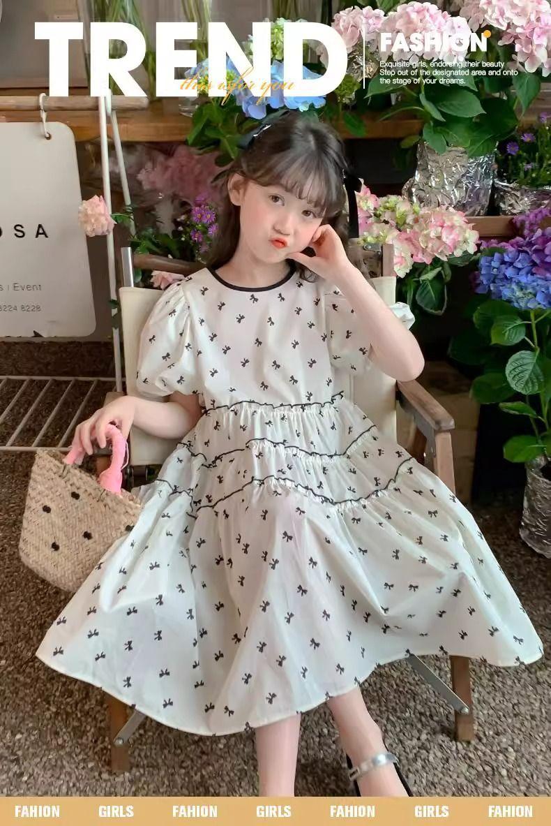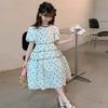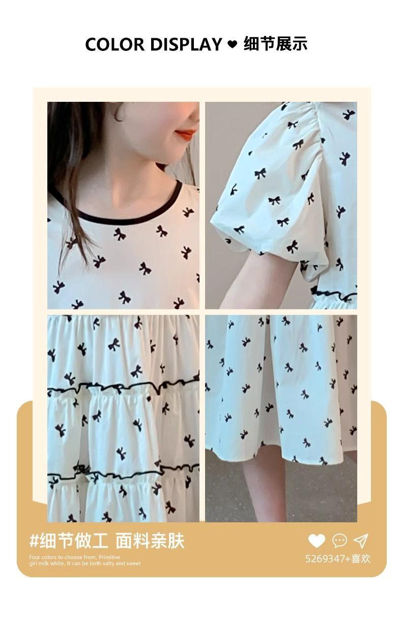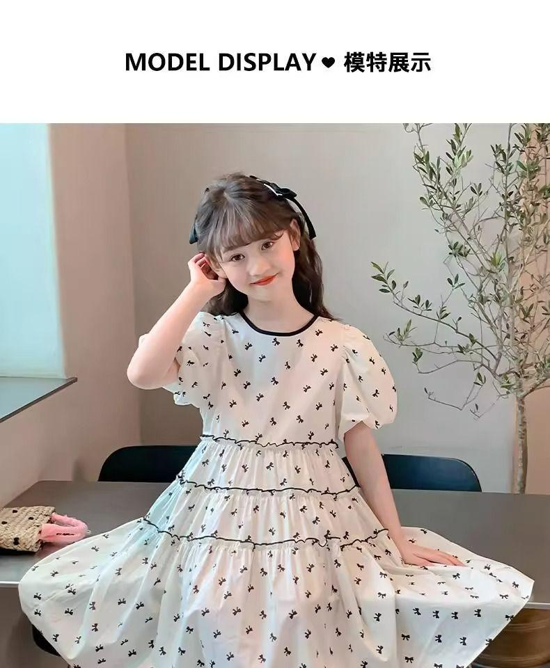 Vestido de Niña Cuello Redondo Francés Diseño de Verano Estampado de Lazo Manga Abullonada Falda Vestido de Princesa para Niños