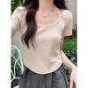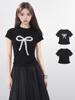 Nueva Camiseta de Verano para Niña con Lazo Bordado de Manga Corta para Mujer con Diseño de Hombro con Sensación de Espina de Pescado Slim Top Corto
