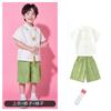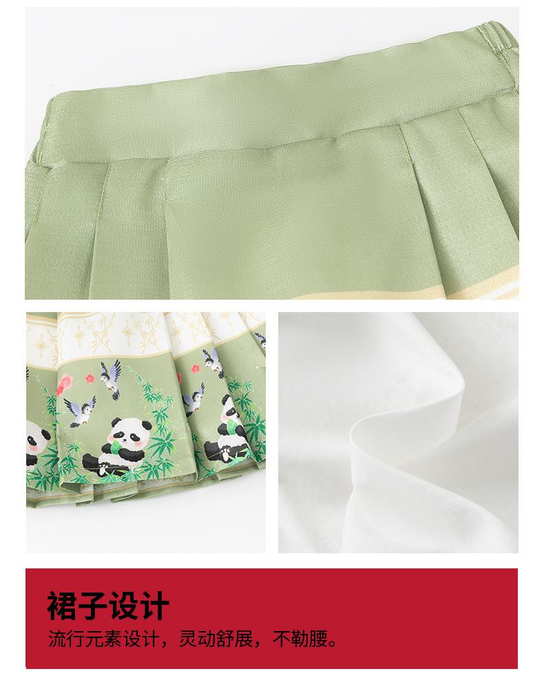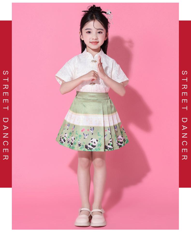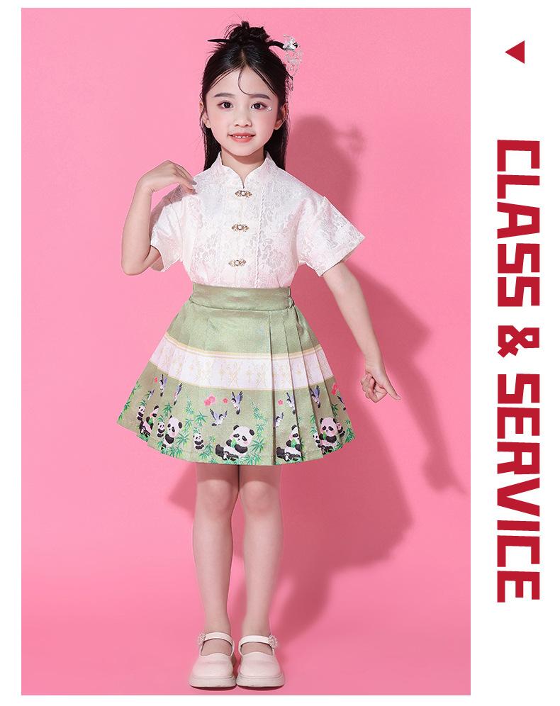 H2028 women's white jacquard short sleeves + h2058 short green panda horse skirt + black white flower hairpin + white ink fan + red striped white socks