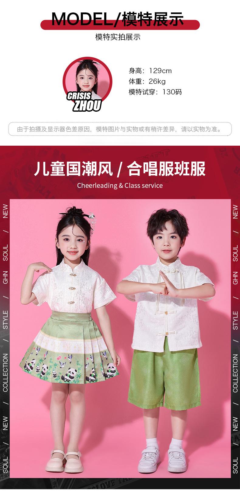 H2028 women's white jacquard short sleeves + h2058 short green panda horse skirt + white ink fan + red striped white socks