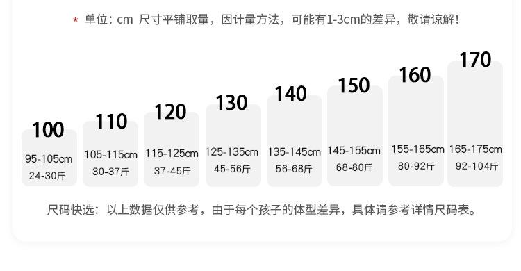 Recommended height for size 100 is 95-105cm, Size 110 recommended height 105-115cm, Size 120 recommended heigh...