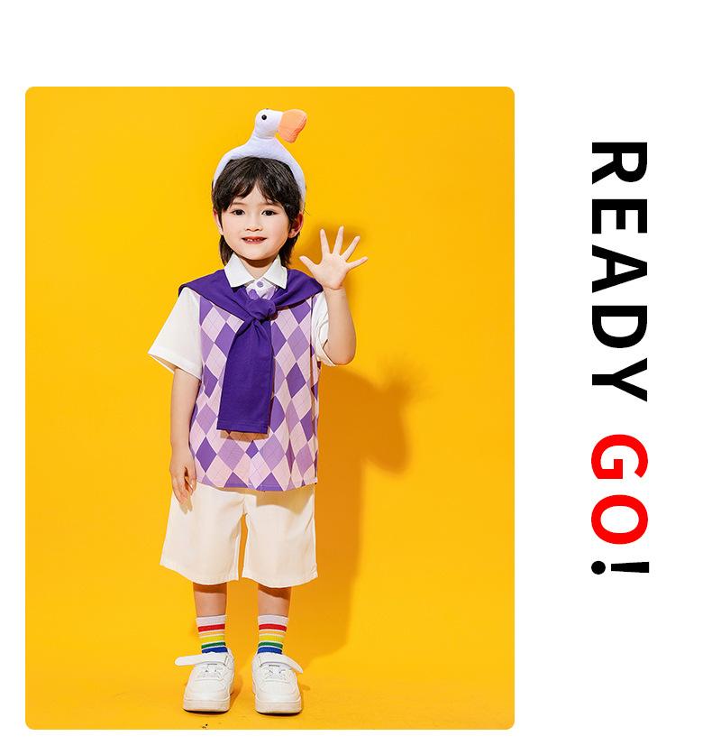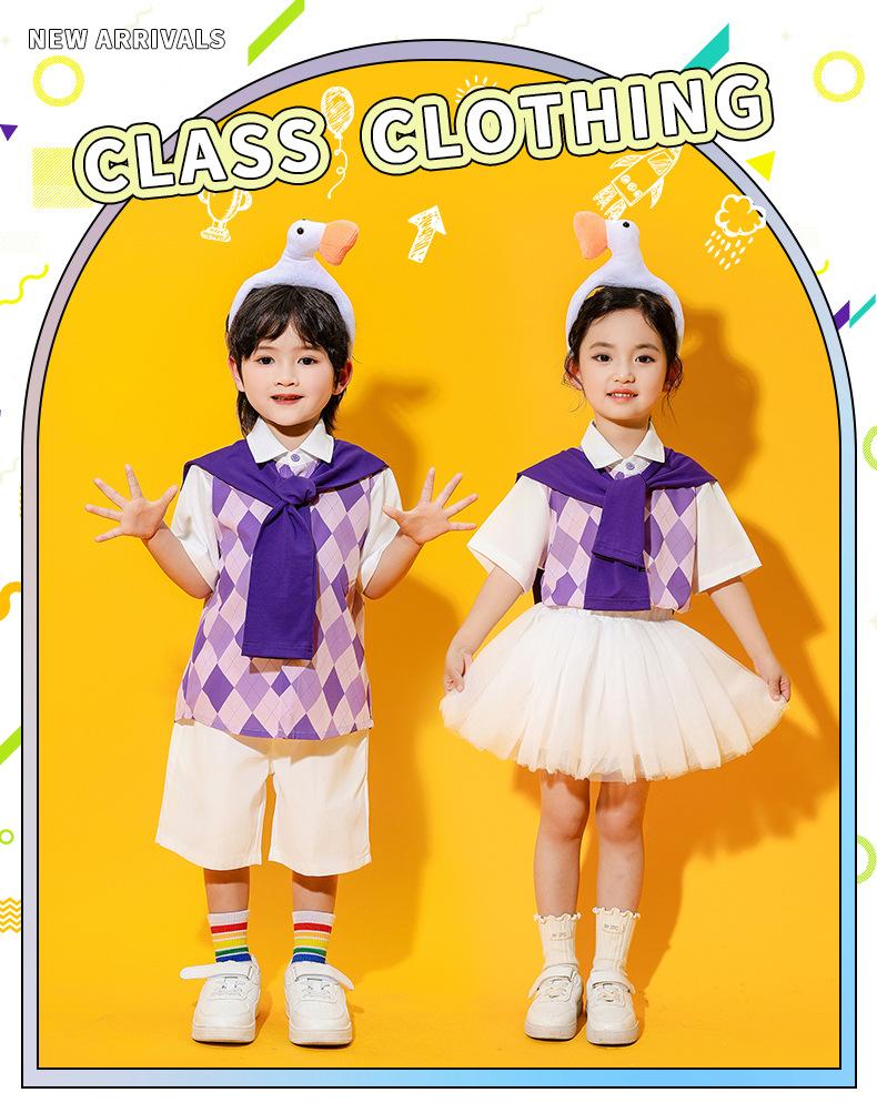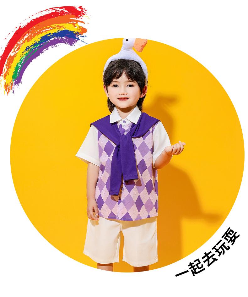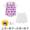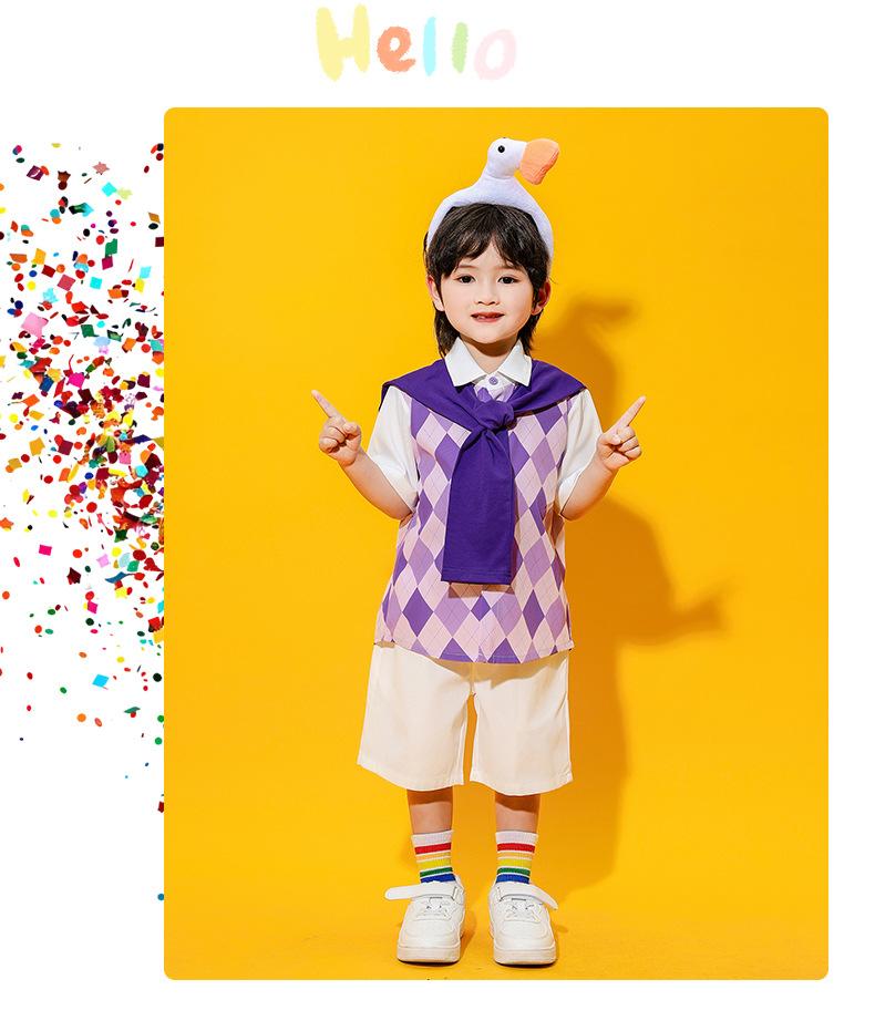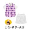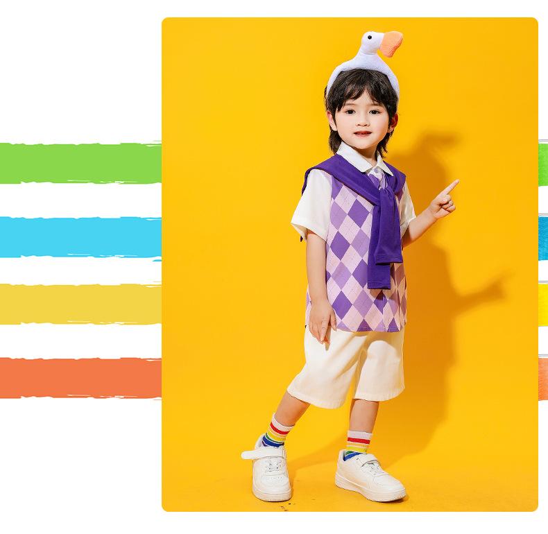 550 purple plaid shirt + 875 white shorts + white duck headwear + rainbow socks