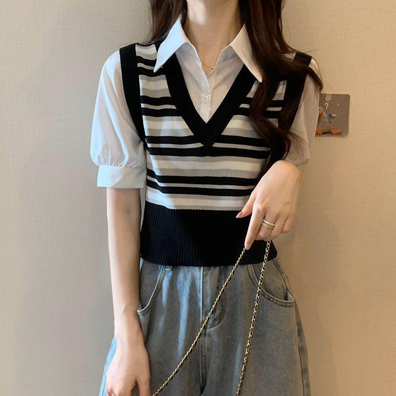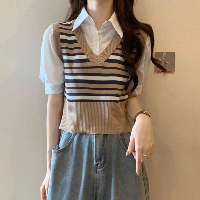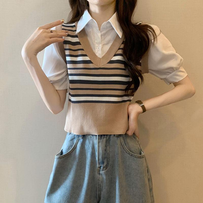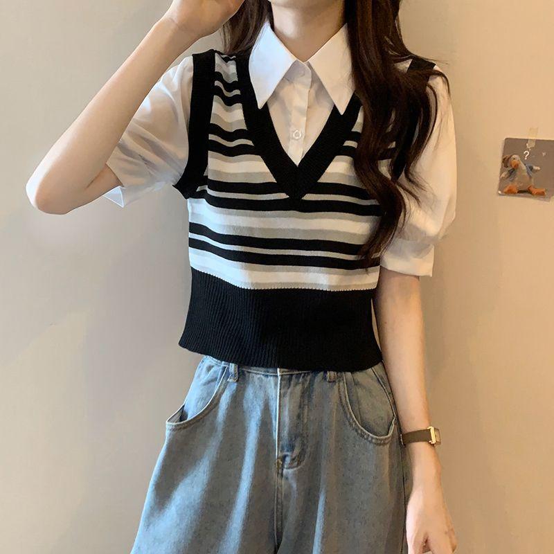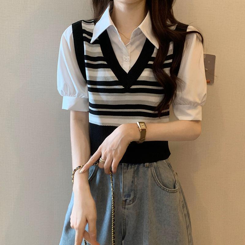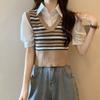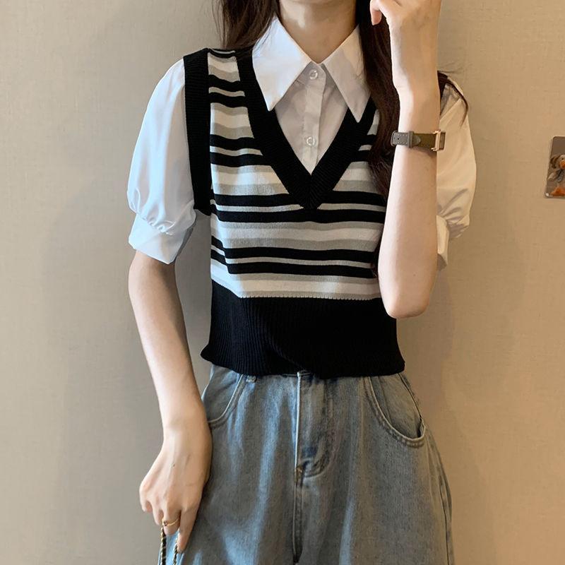 Polo de manga corta a rayas de punto de estilo universitario de dos piezas falsas Camiseta de verano nueva estilo coreano sentido del diseño top de chica hot