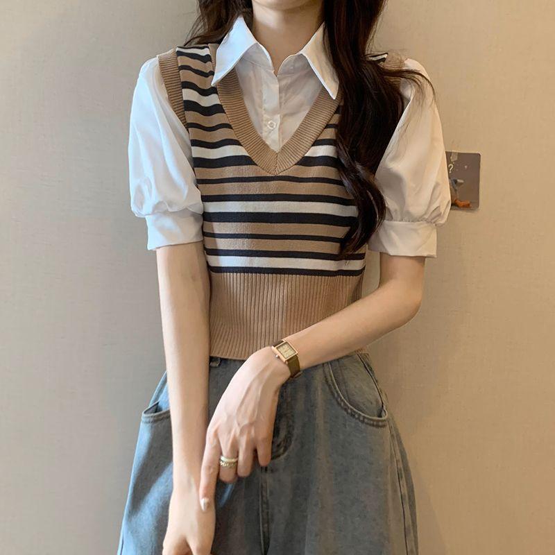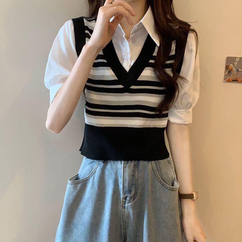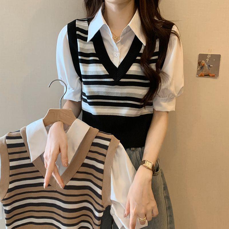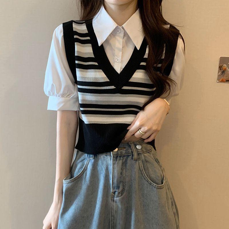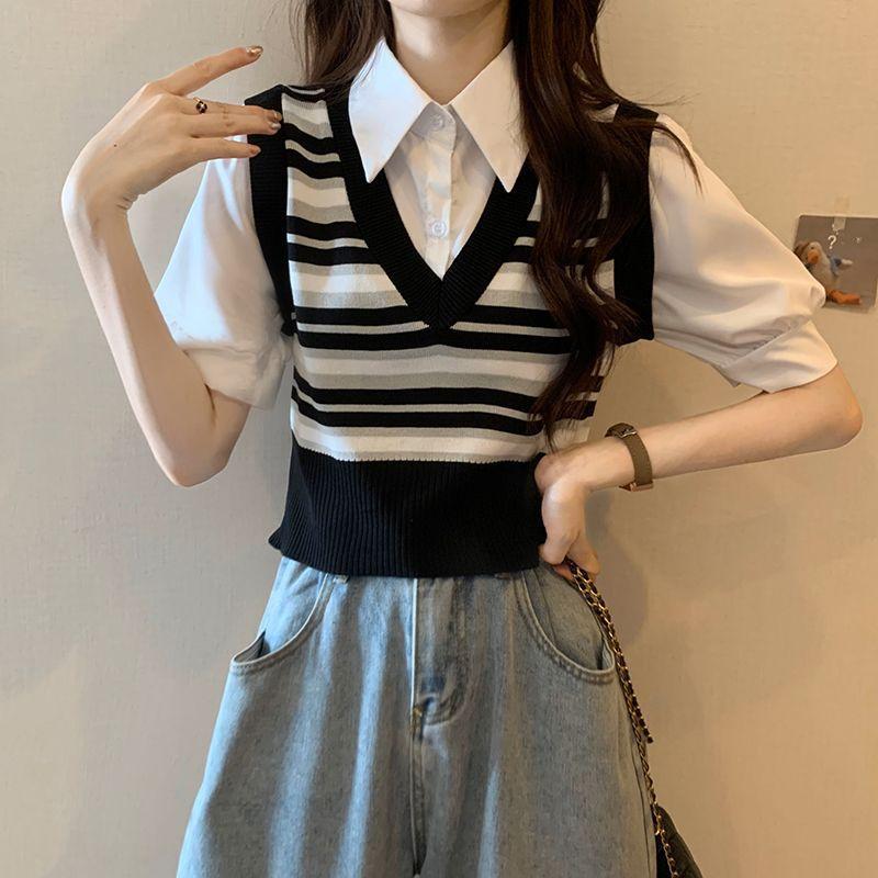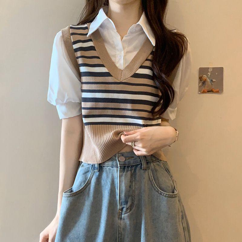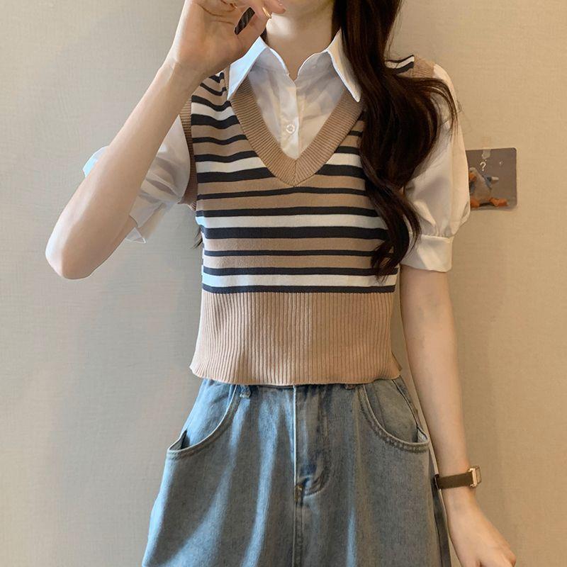 Polo de manga corta a rayas de punto de estilo universitario de dos piezas falsas Camiseta de verano nueva estilo coreano sentido del diseño top de chica hot
