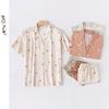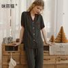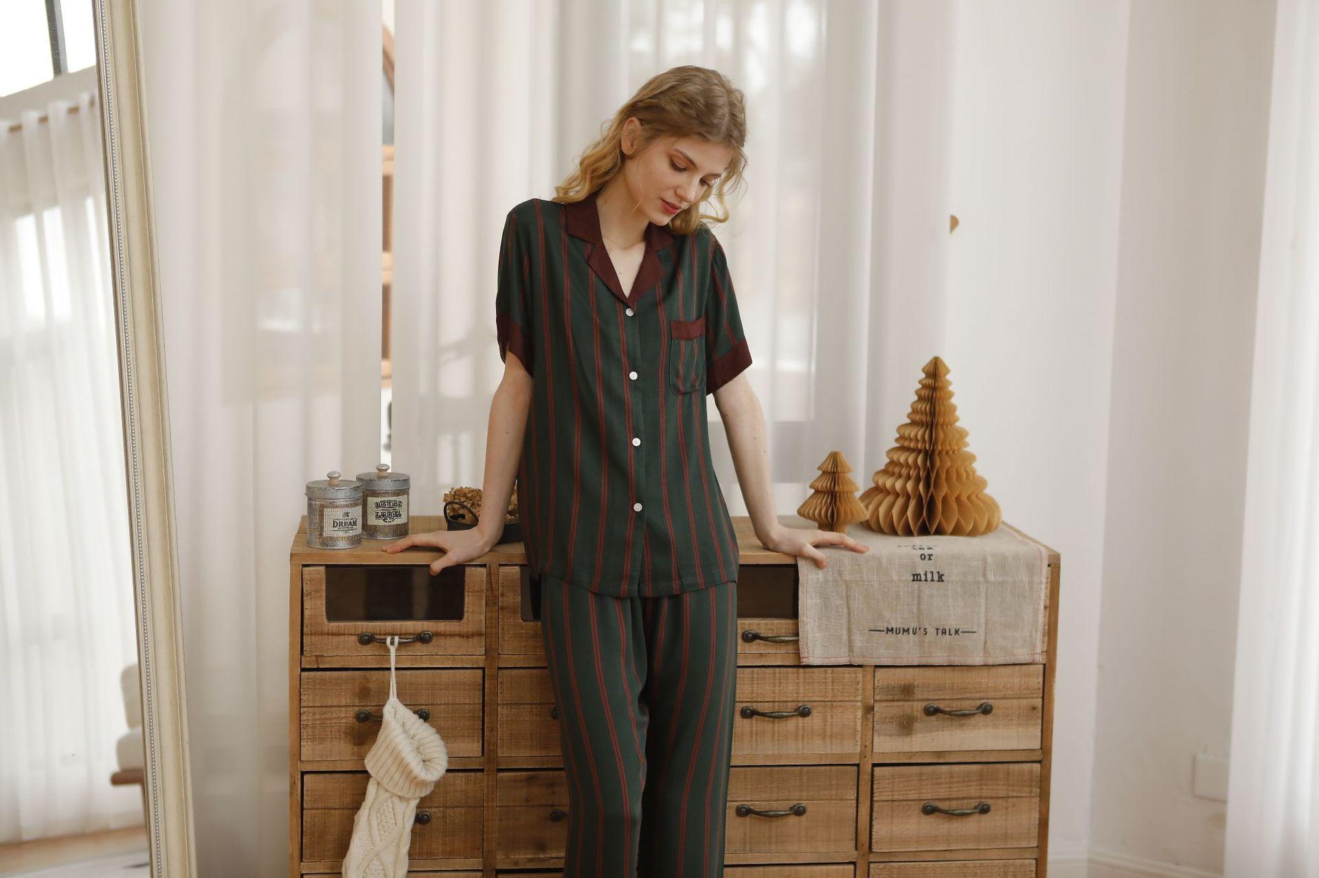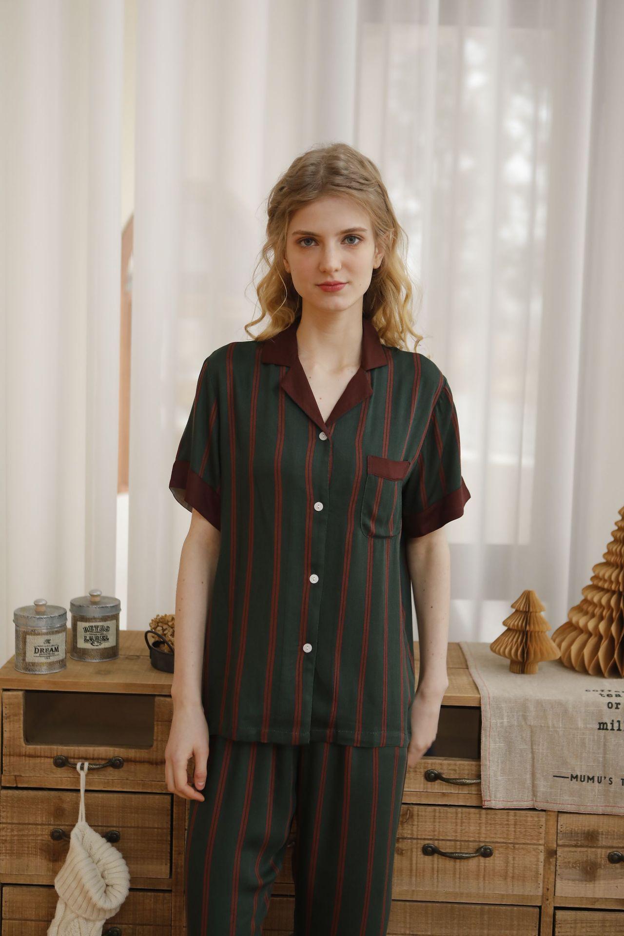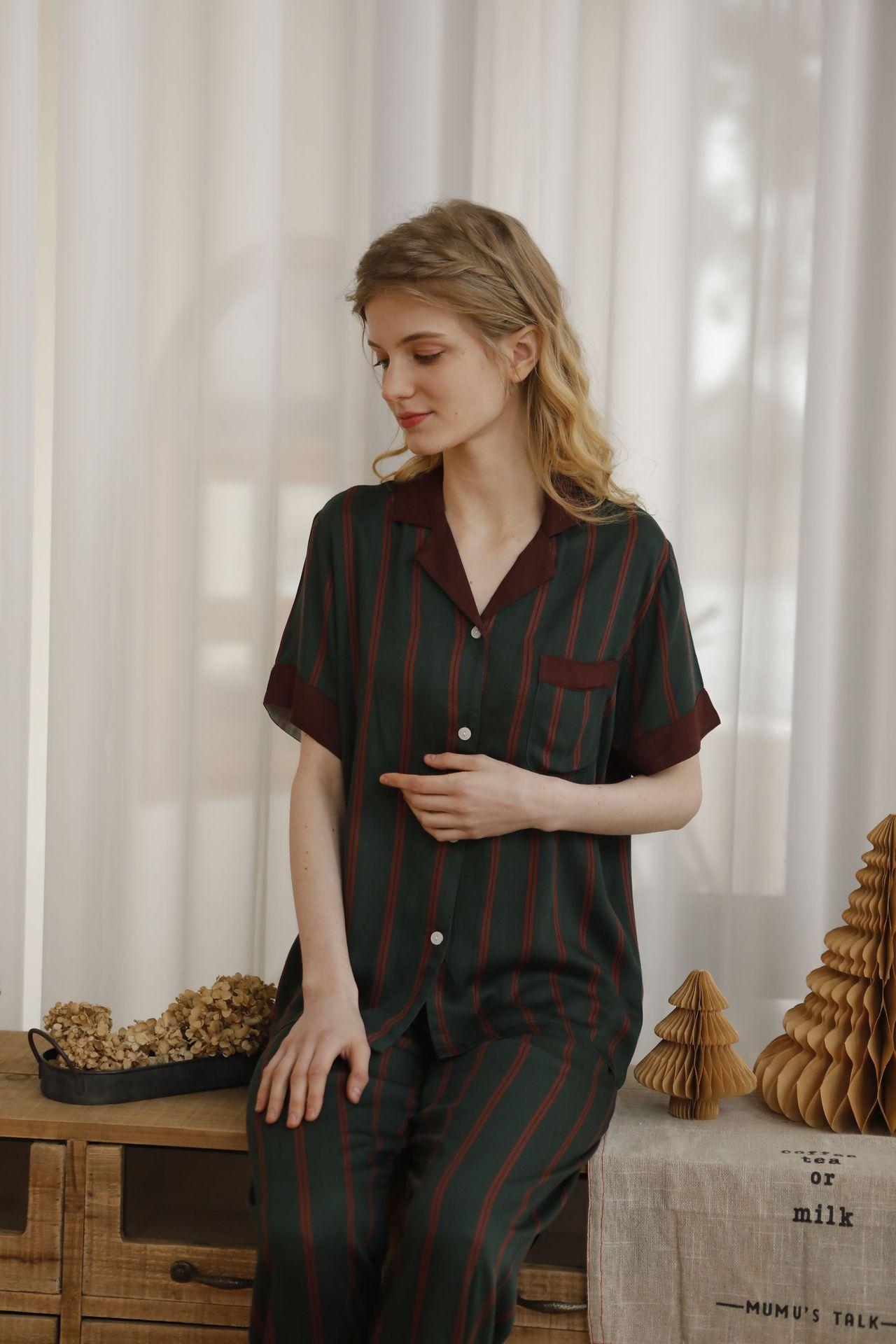 Procesamiento y Personalización de Mixi Cat 2023 Nuevo Estilo de Verano Rayas Verdes Oscuras Versátil Look Adelgazante Pantalones de Manga Corta Pijamas de Mujer