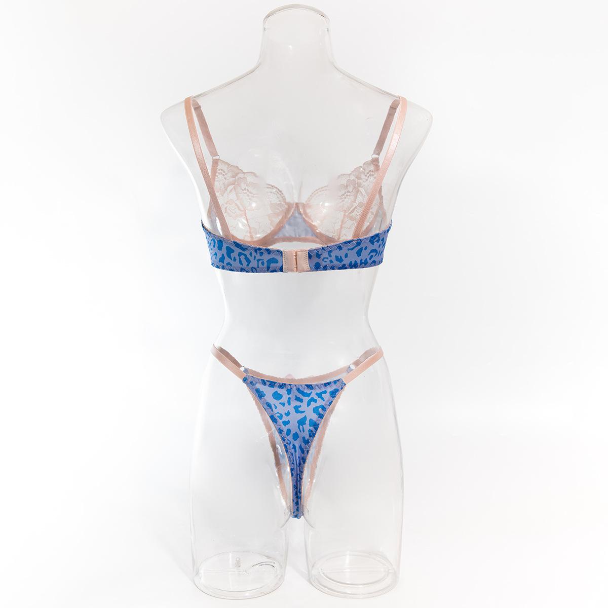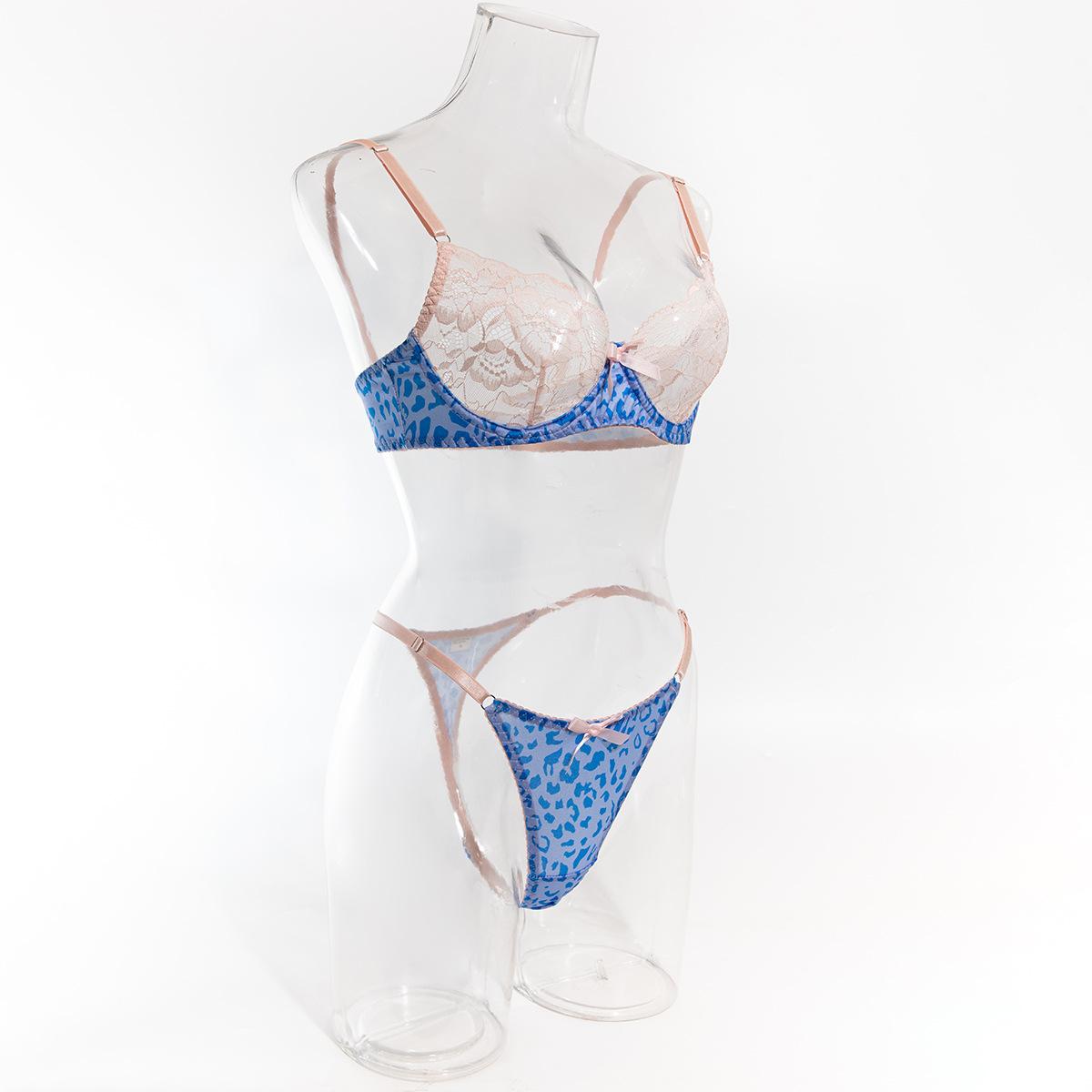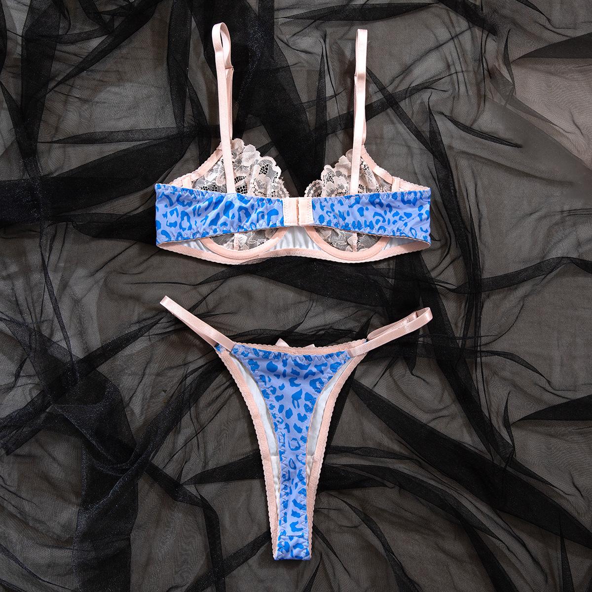 Saiya nuevo conjunto de ropa interior sexy ultrafino de encaje rosa claro con estampado de leopardo azul y aro de acero de gran venta