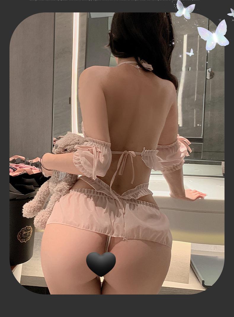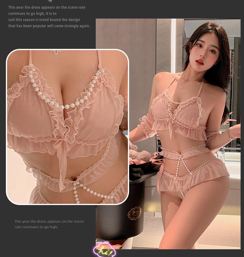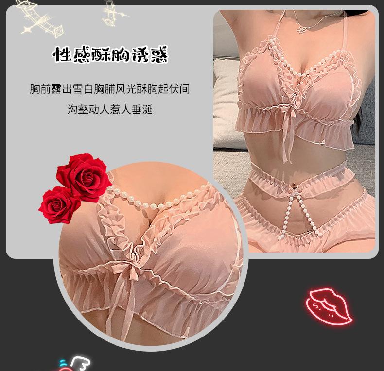 Lencería Sexy Traje de Tentación Rosa Sexy de Tres Puntos para Mujer Caliente con Abertura Sujetador y Panties de Perlas 6406