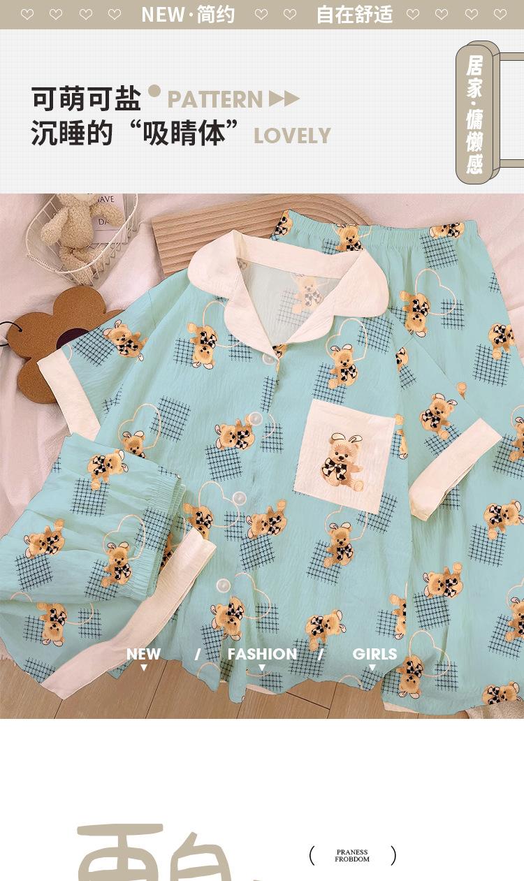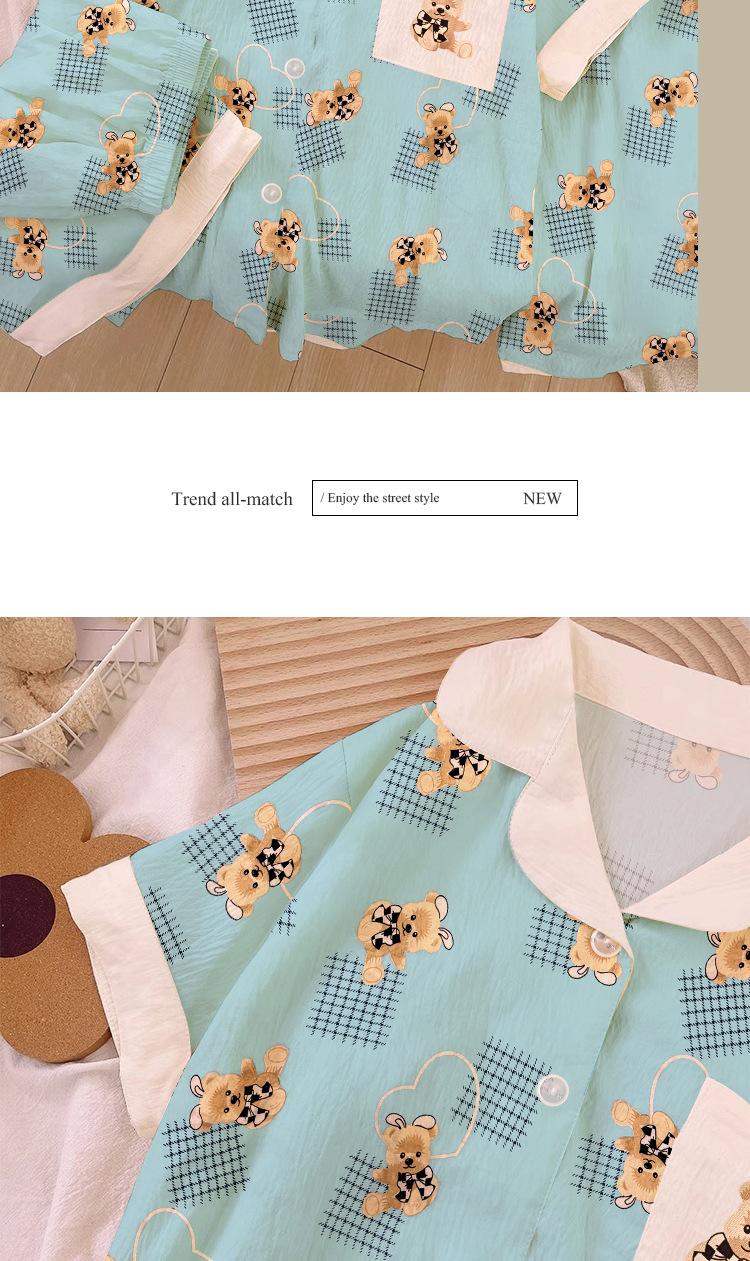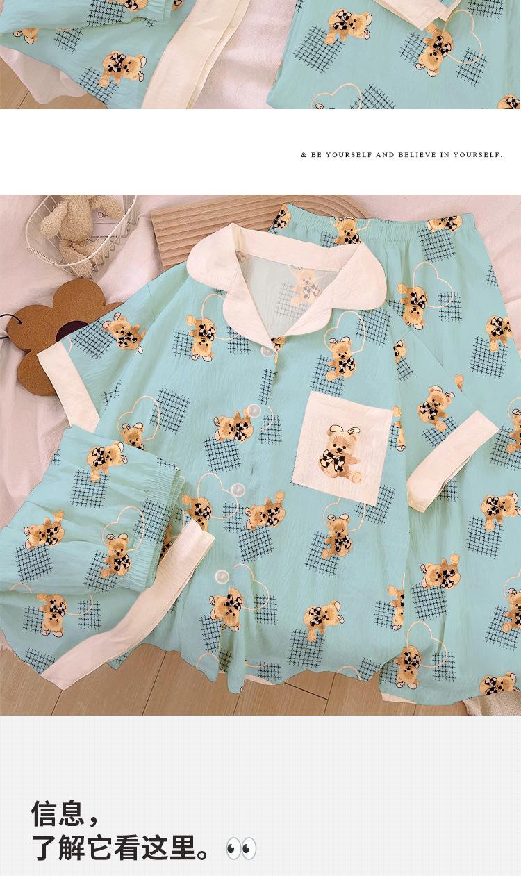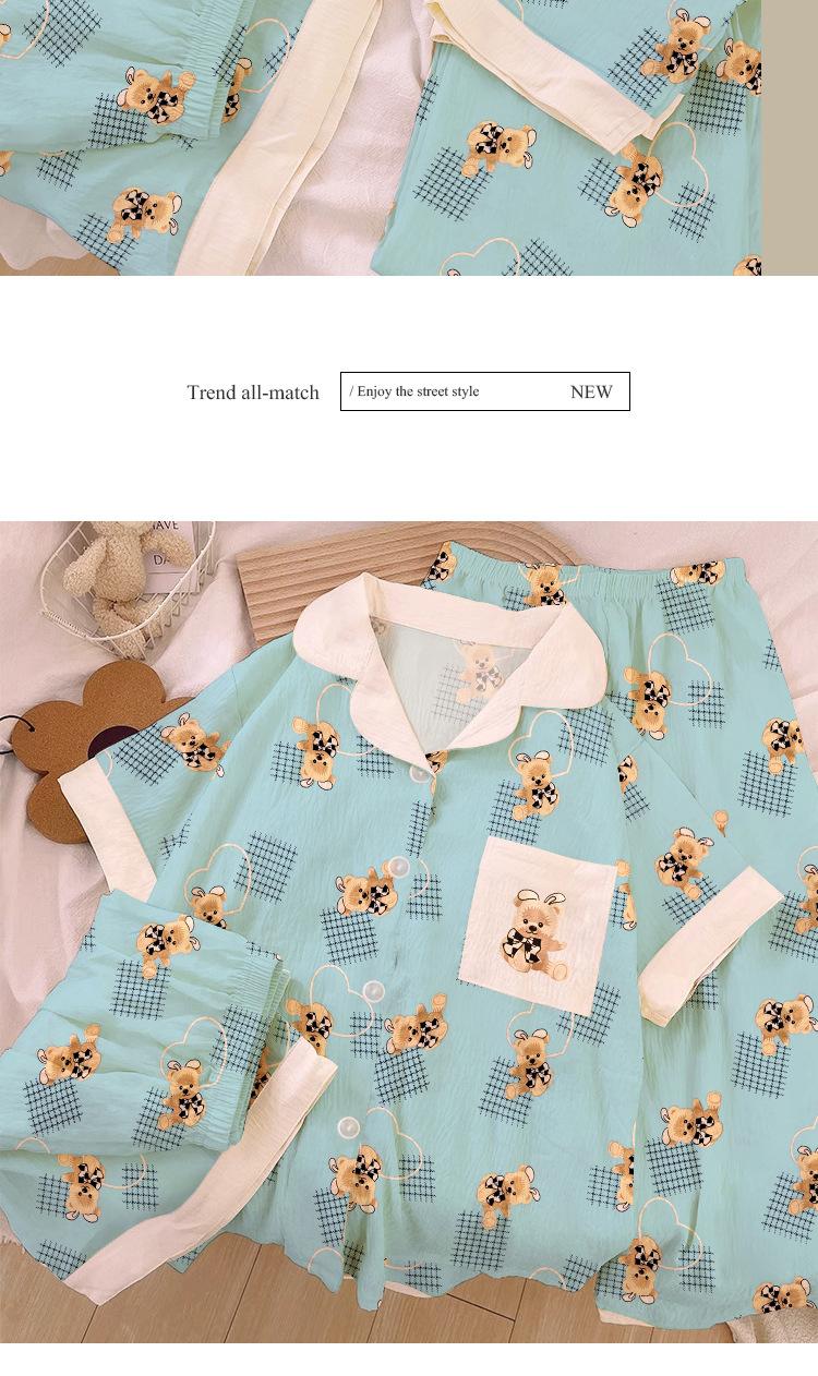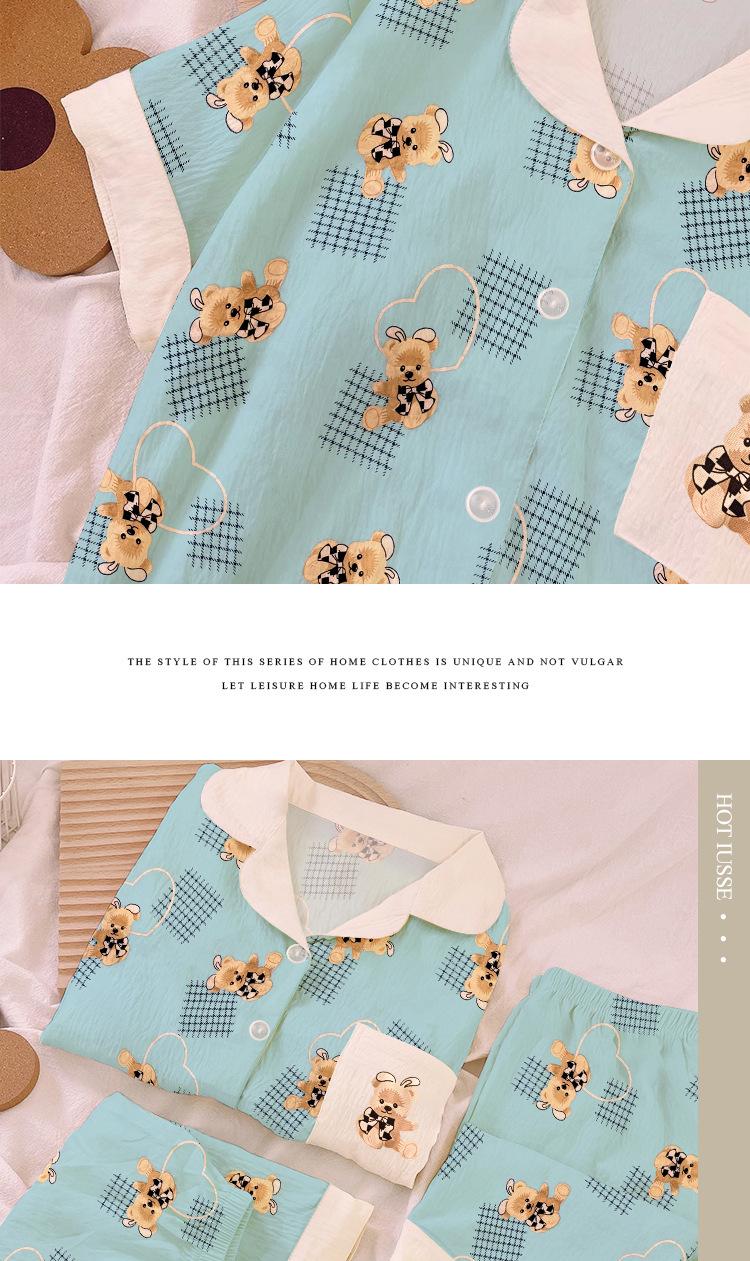 Compra Pijama de algodón de verano fresco de oso de dibujos animados para mujer, ropa de casa de manga corta, dulce conjunto de tres piezas ins, foto real al por mayor al por mayor en Joom.pro