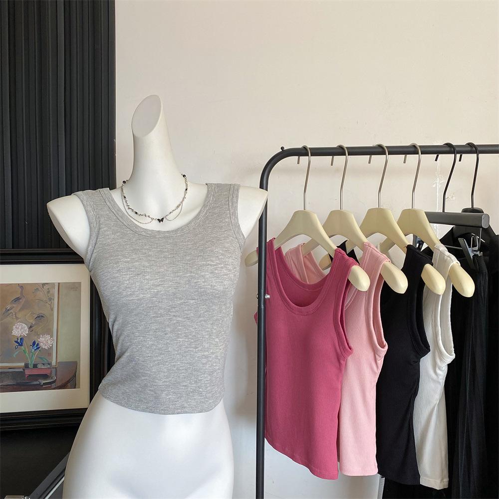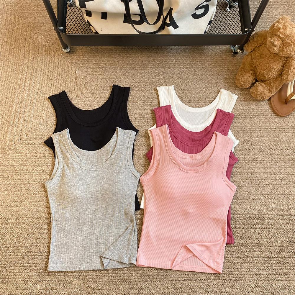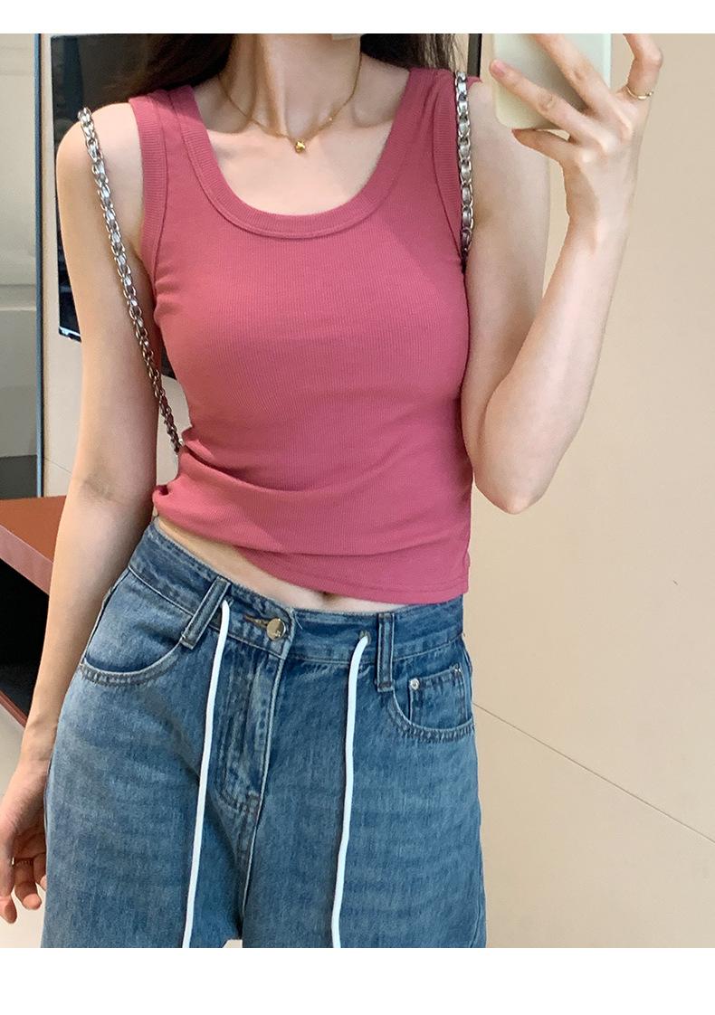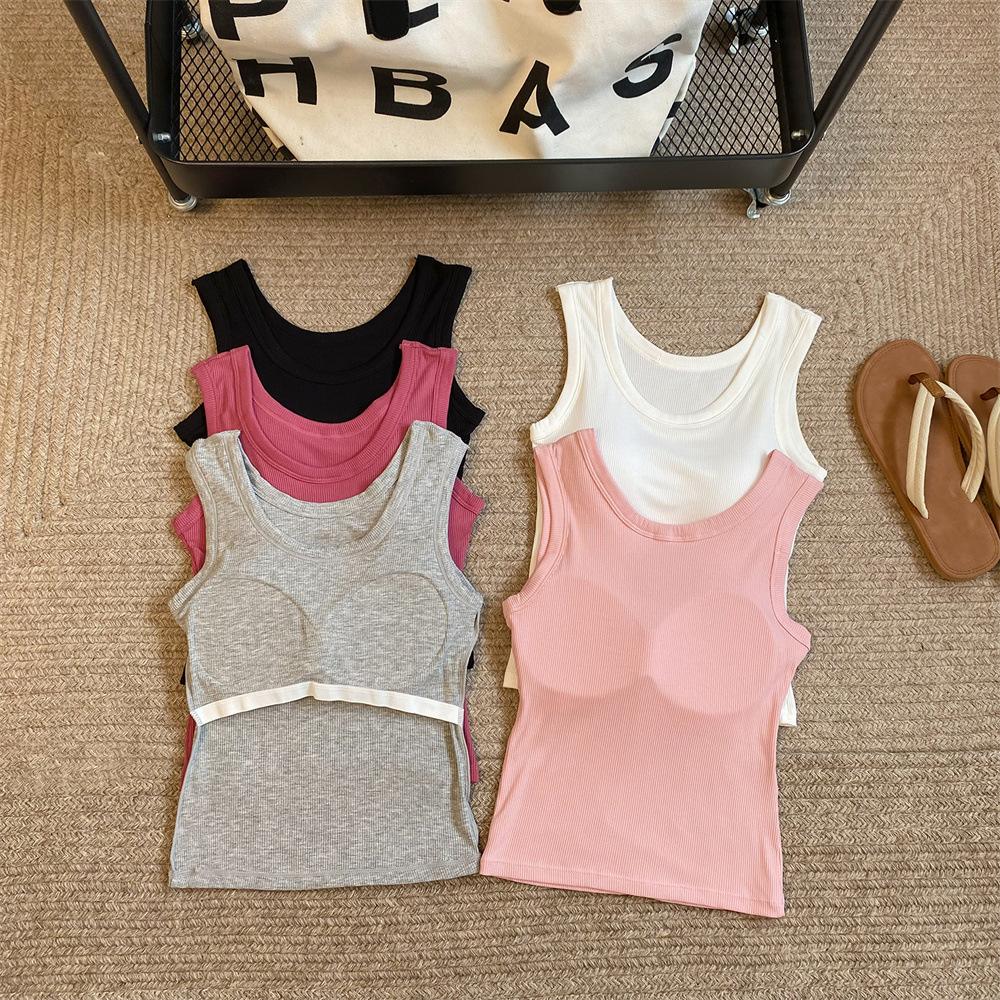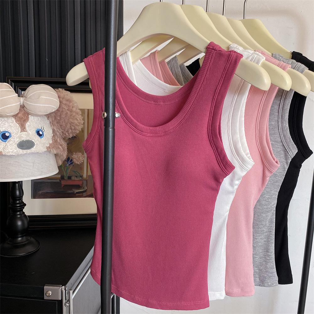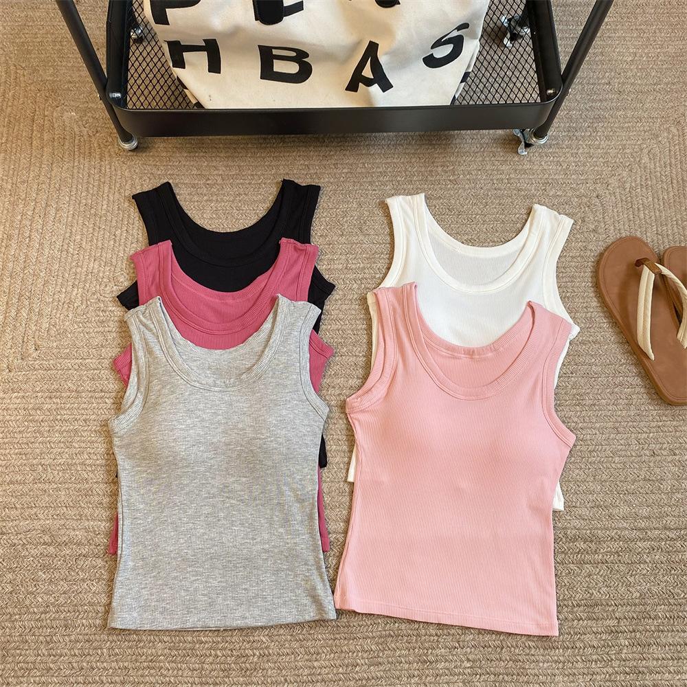 Nuevo Cuello Redondo Color Sólido Chica Caliente Tirantes Anchos Acanalados Hermosa Espalda con Almohadilla de Pecho Incorporada Cómodo Transpirable Dulce Versátil Chaleco para Mujer