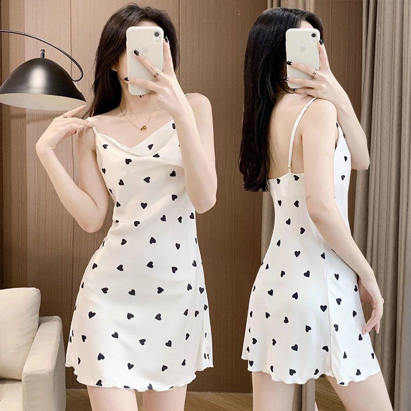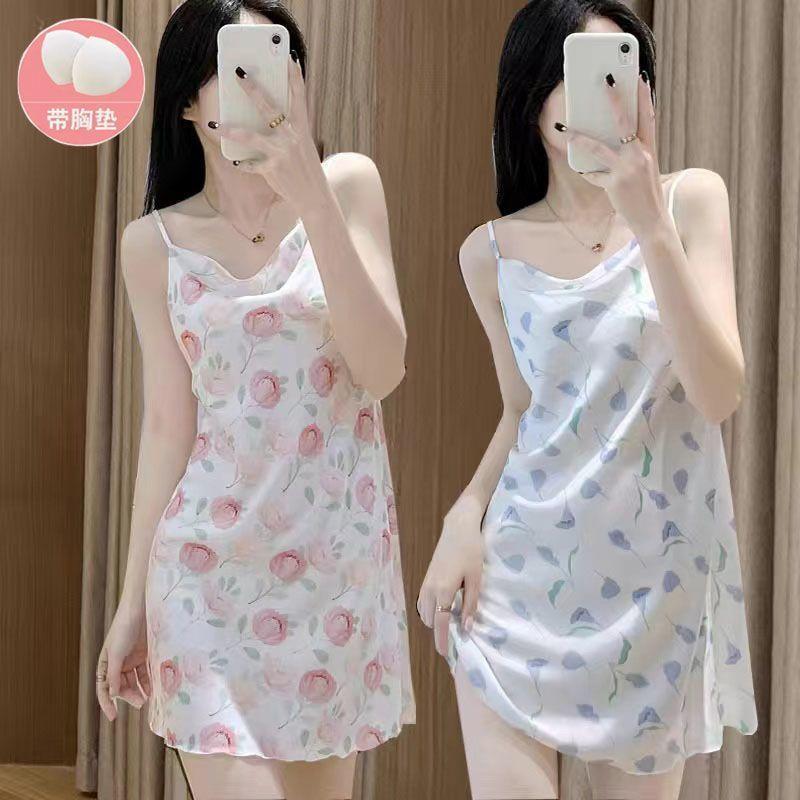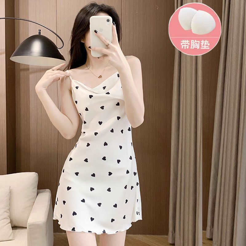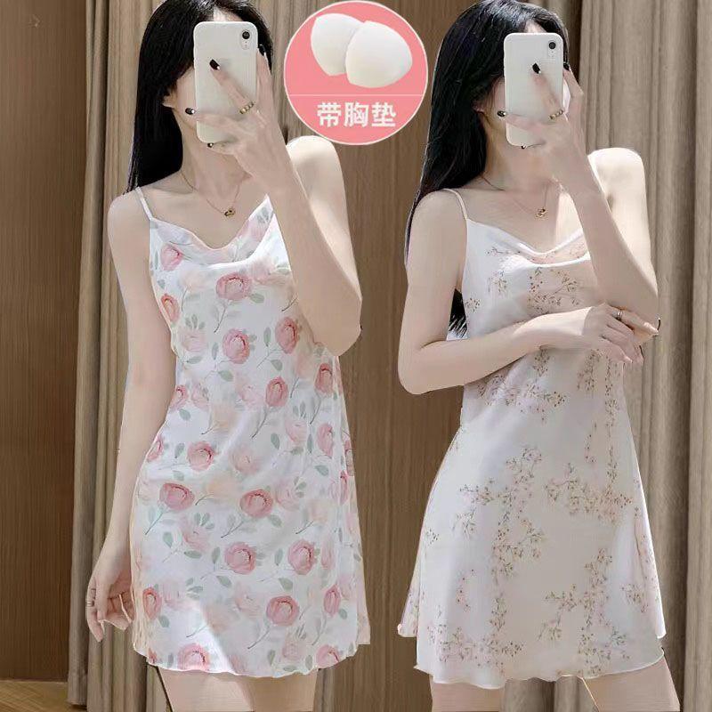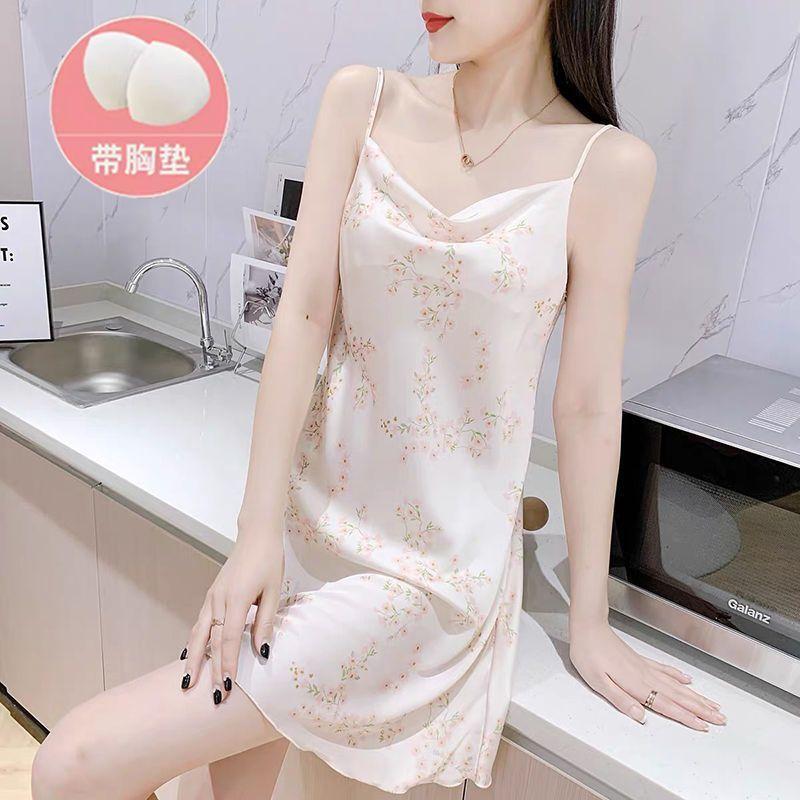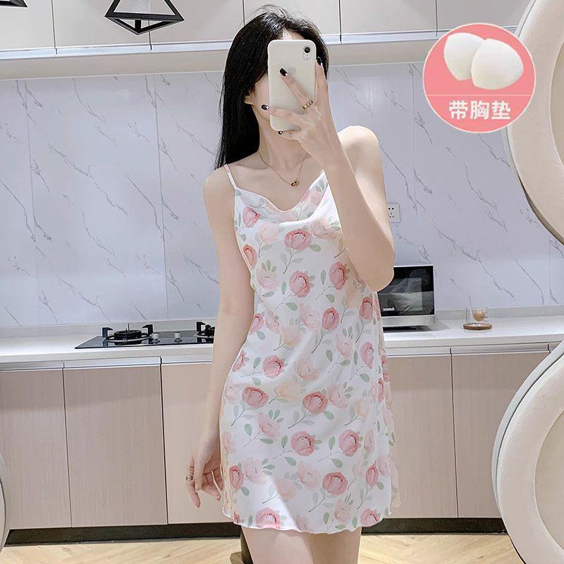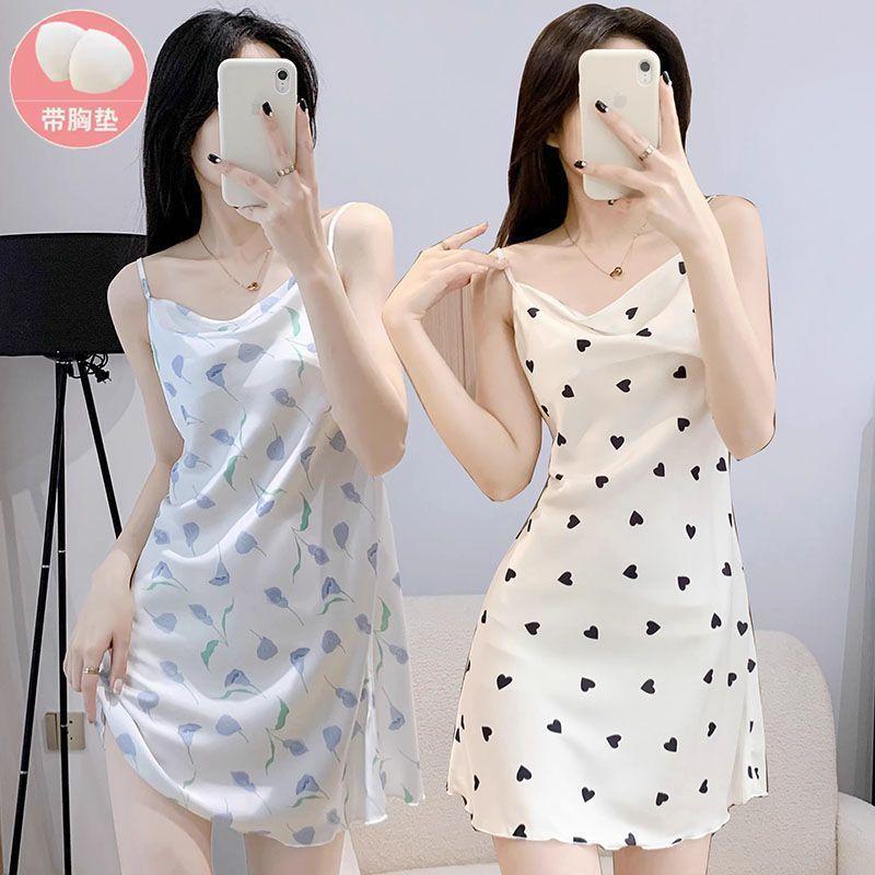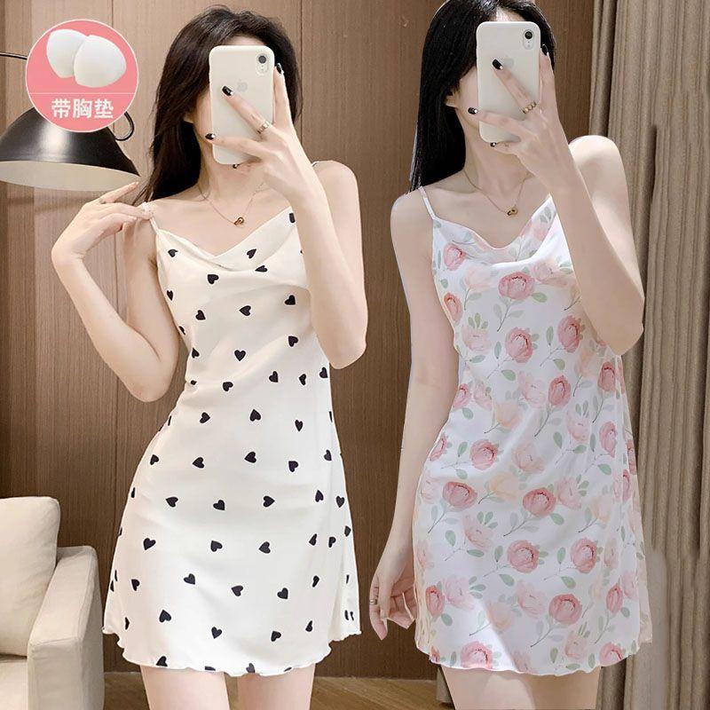 Pijama Sexy de Seda de Hielo de Verano con Almohadillas para el Busto, Estilo Caliente de Celebridad de Internet, Tirantes para Mujer, Camisón para el Hogar, Dulce Falda de Tirantes de Verano