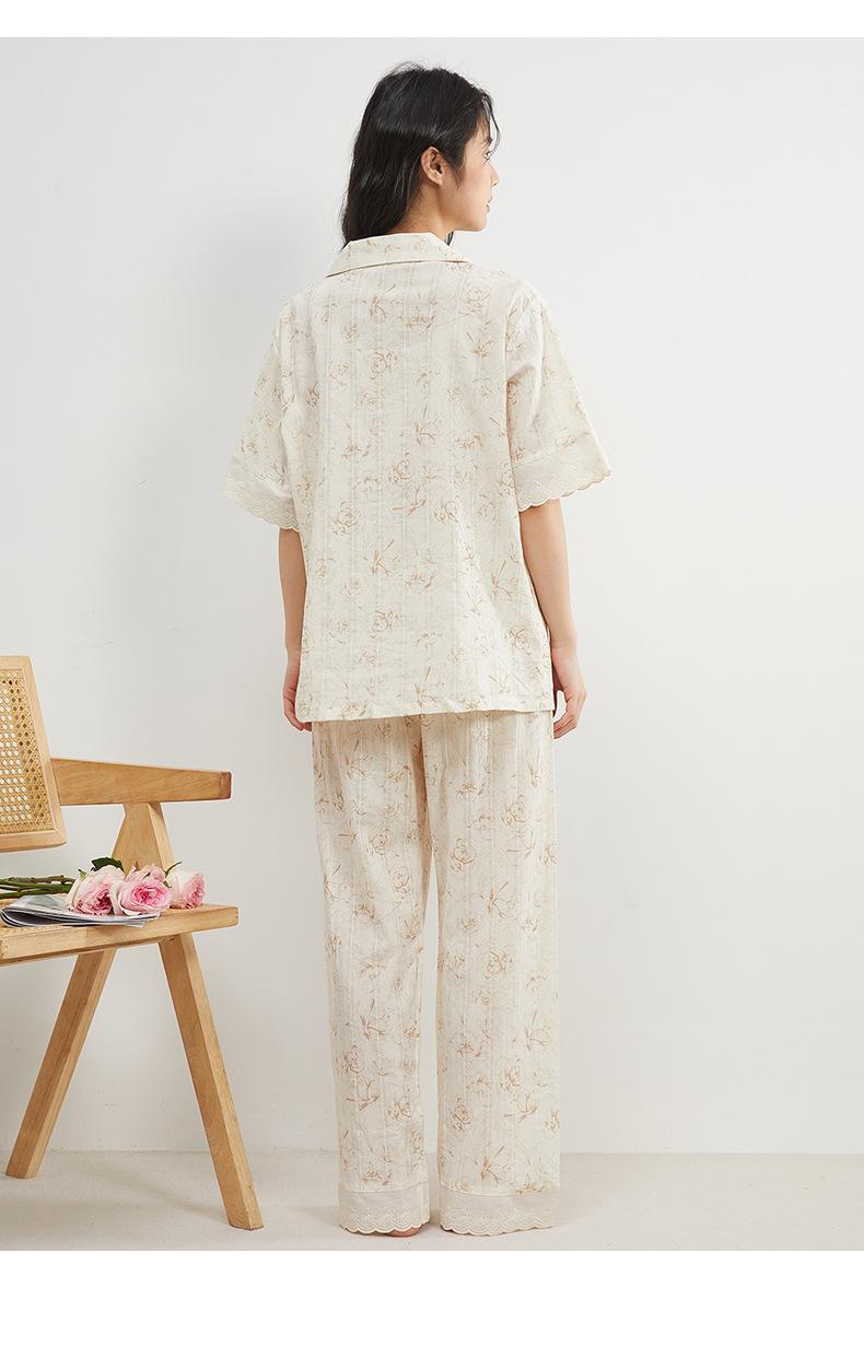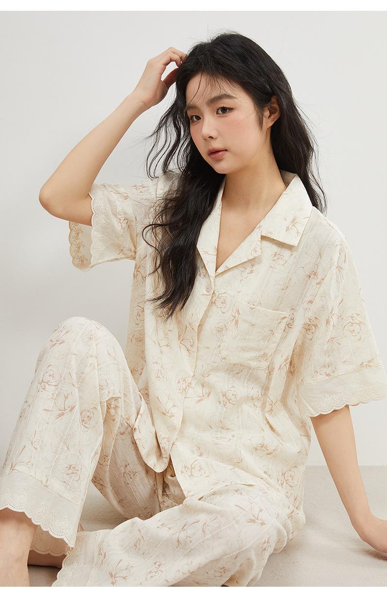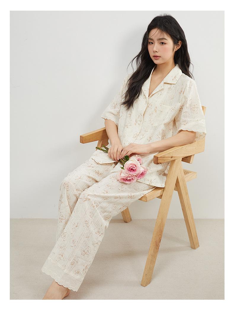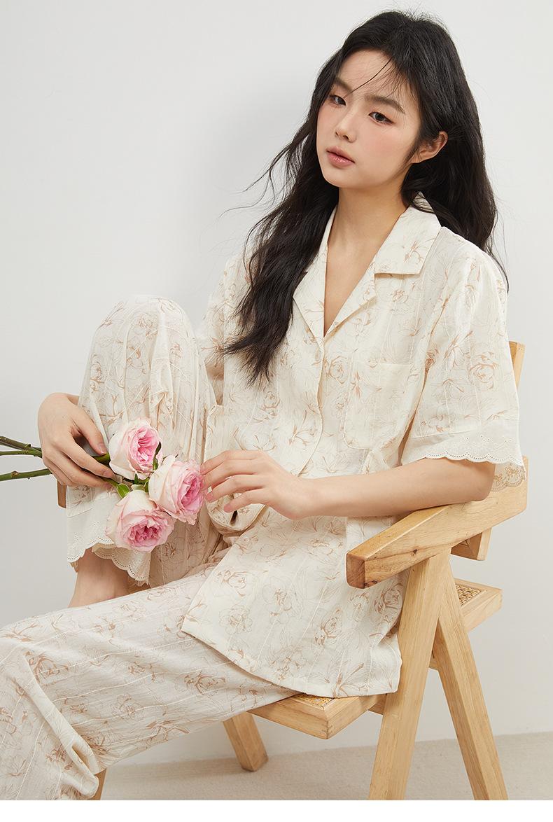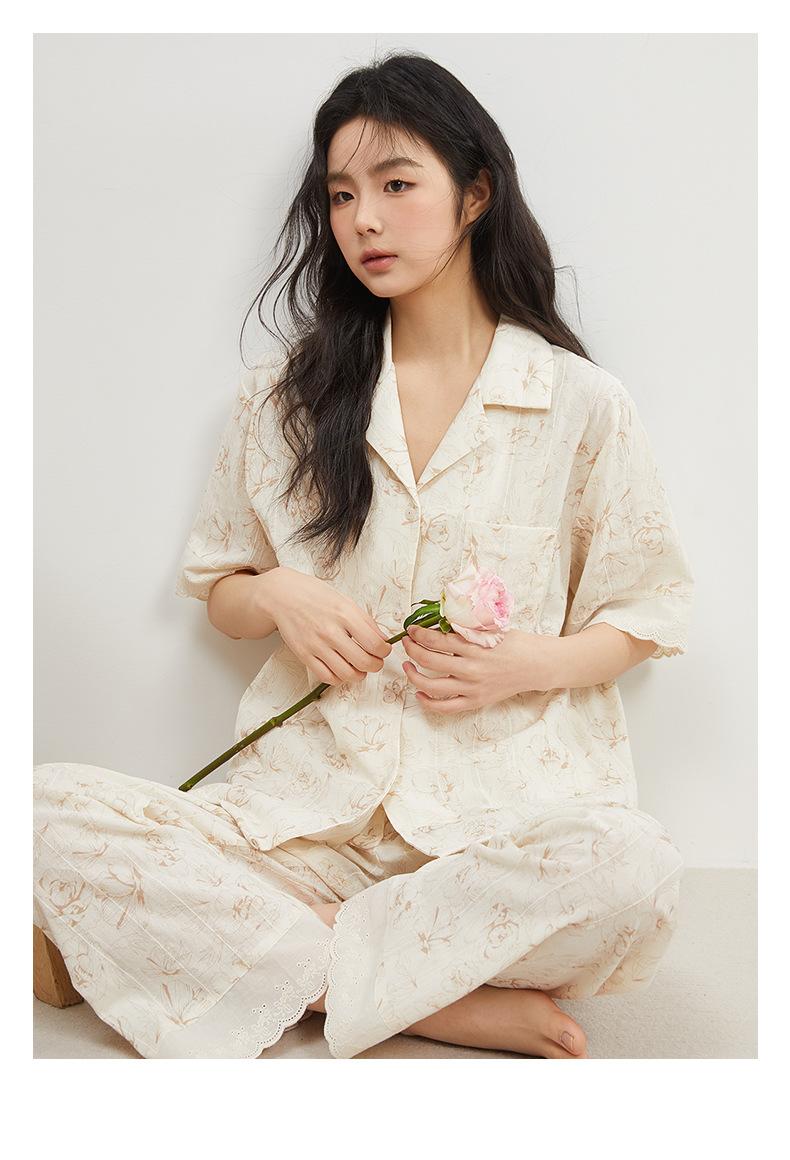 25 Pijamas de Primavera y Verano para Mujer Nuevos Pantalones de Manga Corta Algodón Encaje Pijamas de Alta Gama Set de Ropa para el Hogar de Algodón Puro