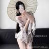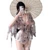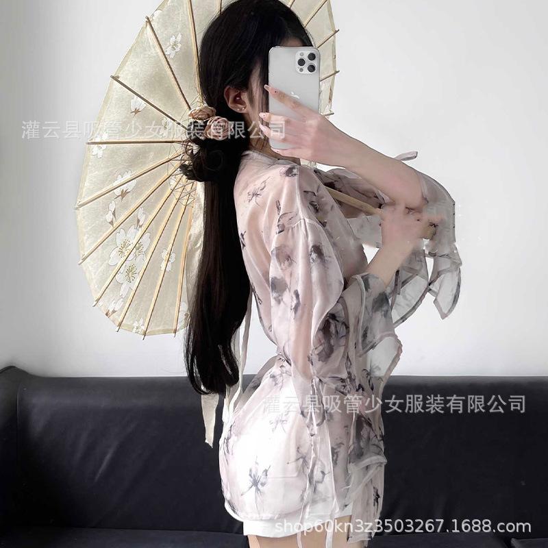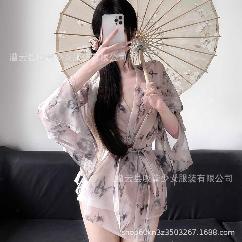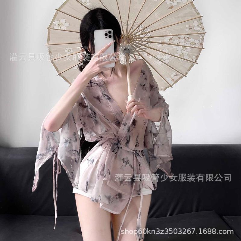 Kimono Mariposa Estampado Chica de Paja Transparente Sexy Escote en V Profundo con Cordones Camisón Ropa Interior Sexy Mangas Campana 2436