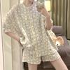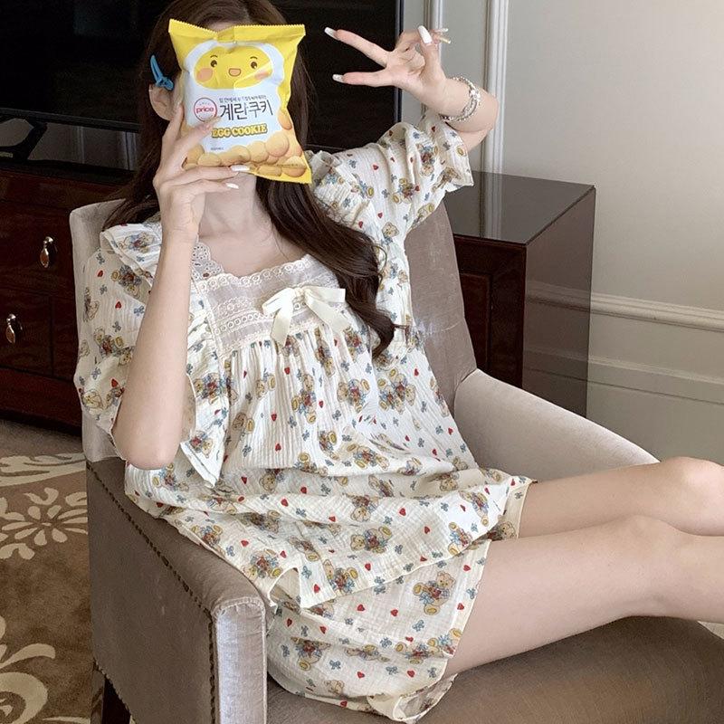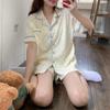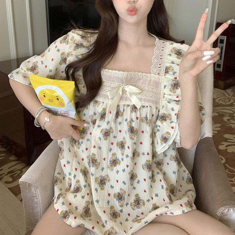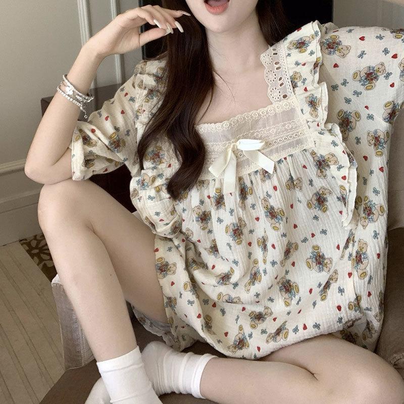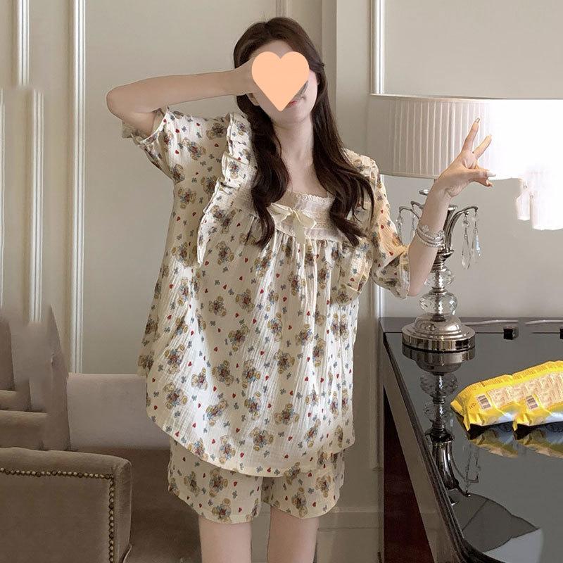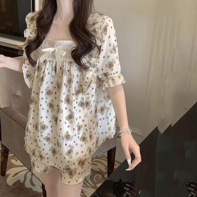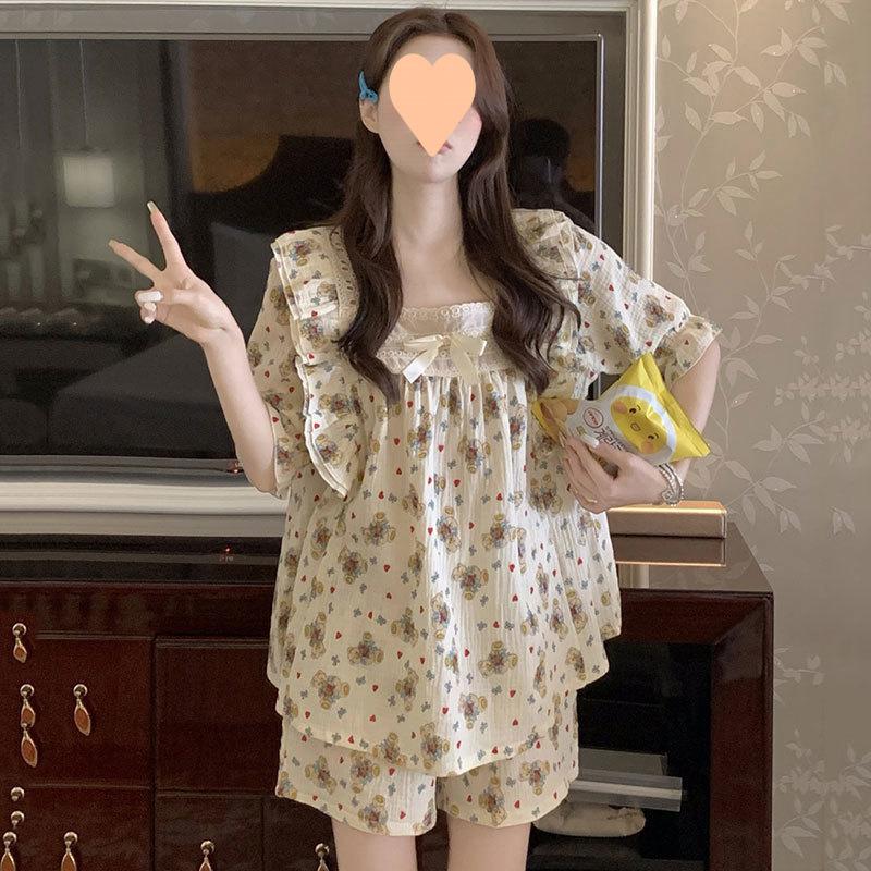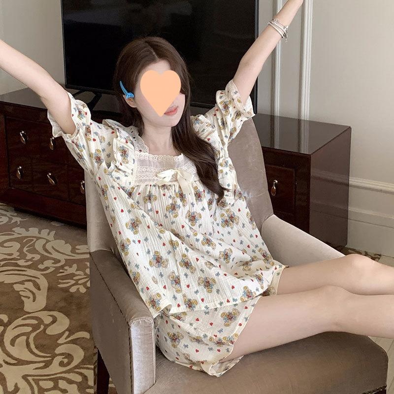 Pijama nuevo de encaje Ins para mujer Verano Manga corta Shorts Estilo coreano Dulce y lindo Oso Conjunto de ropa para el hogar