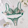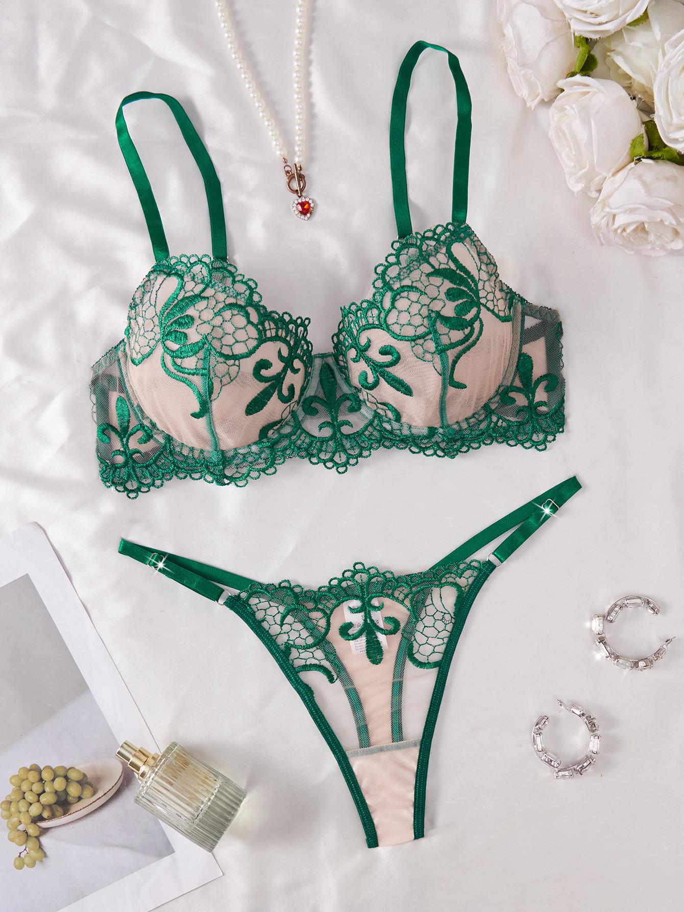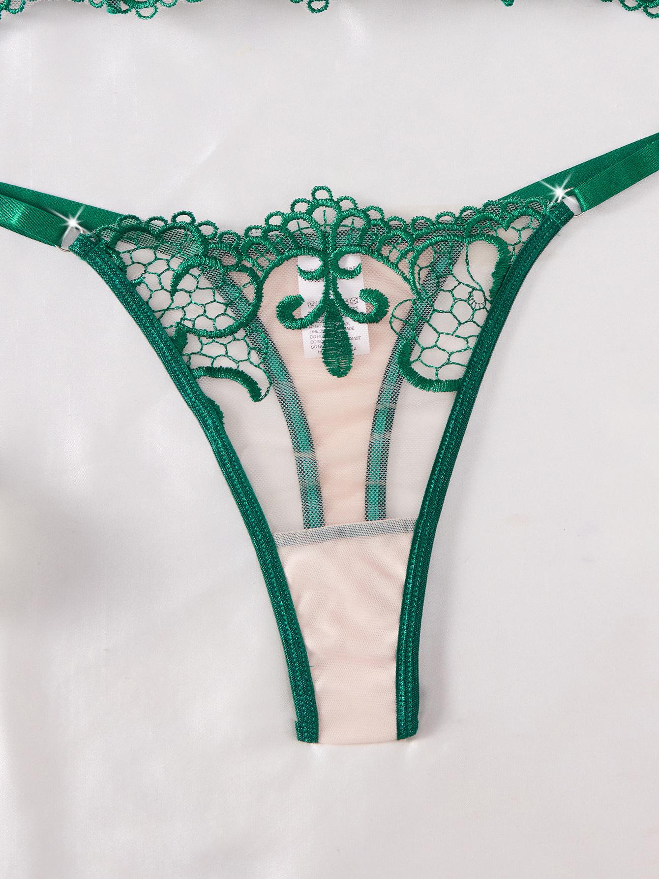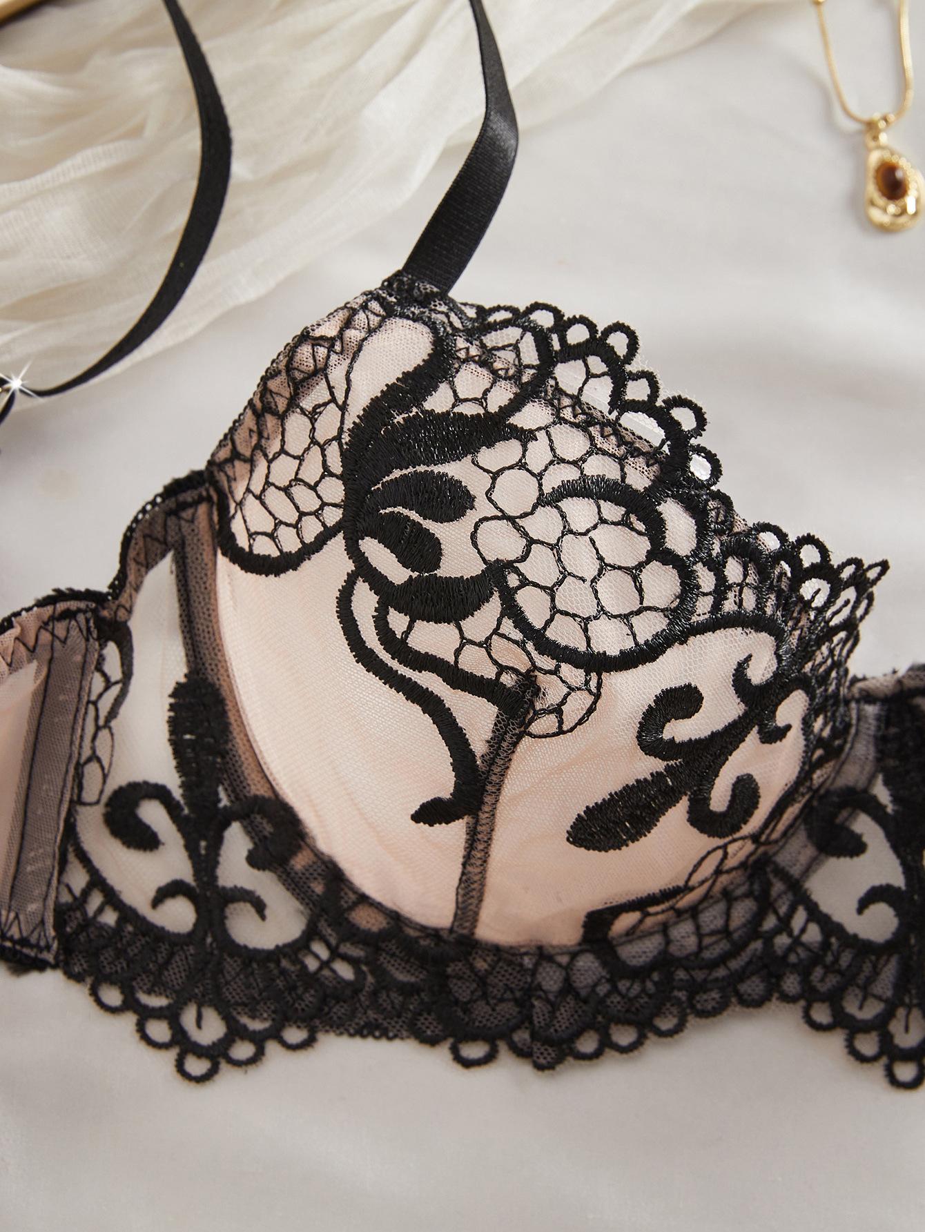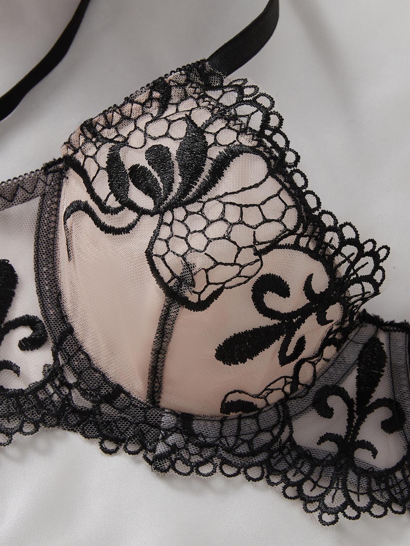 Conjunto de Ropa Interior Sexy de Moda de Tres Puntos de Malla Transparente con Bordado Europeo y Americano Transfronterizo, Copa Doble con Efecto Push-Up para Mujer