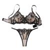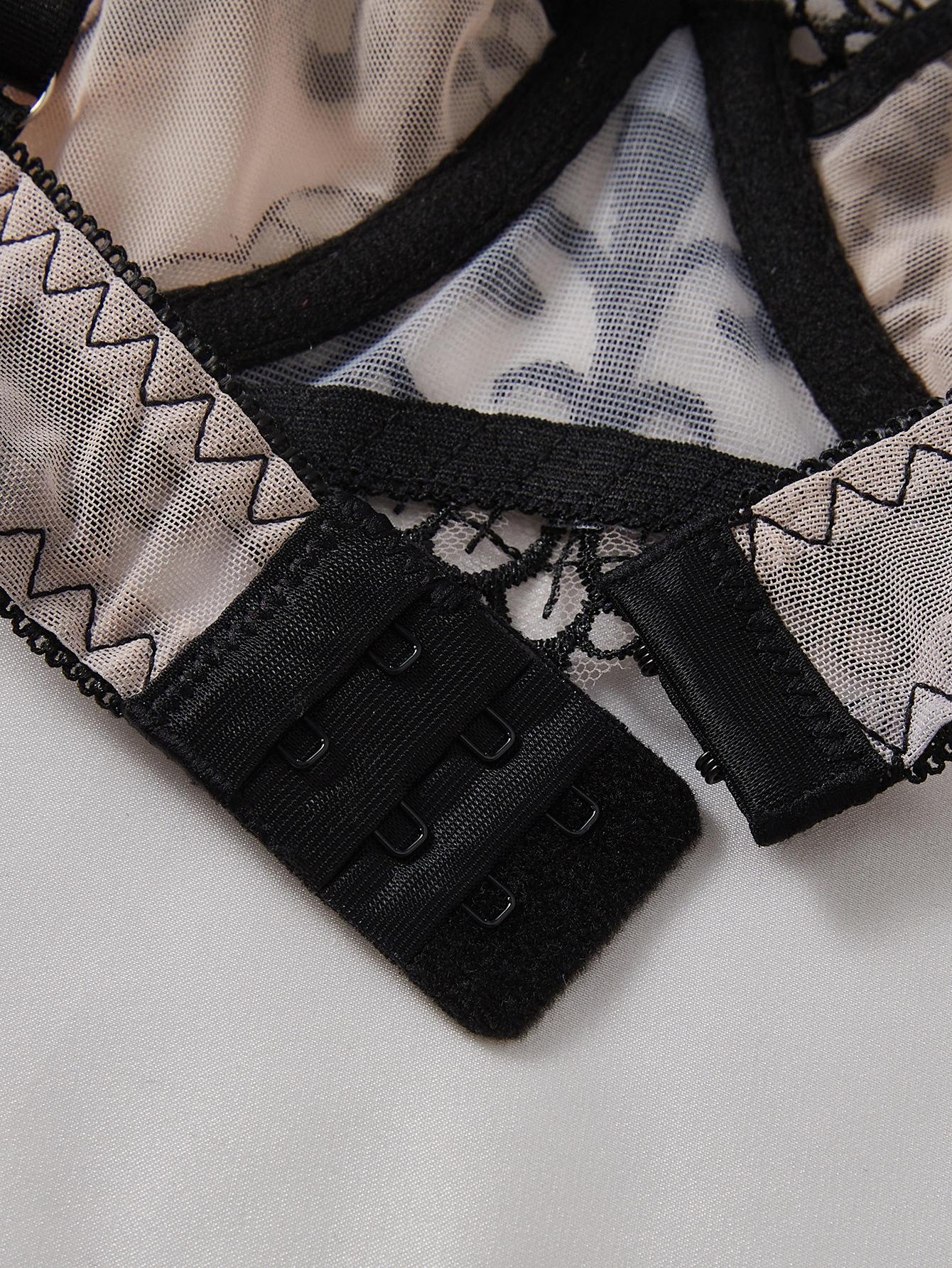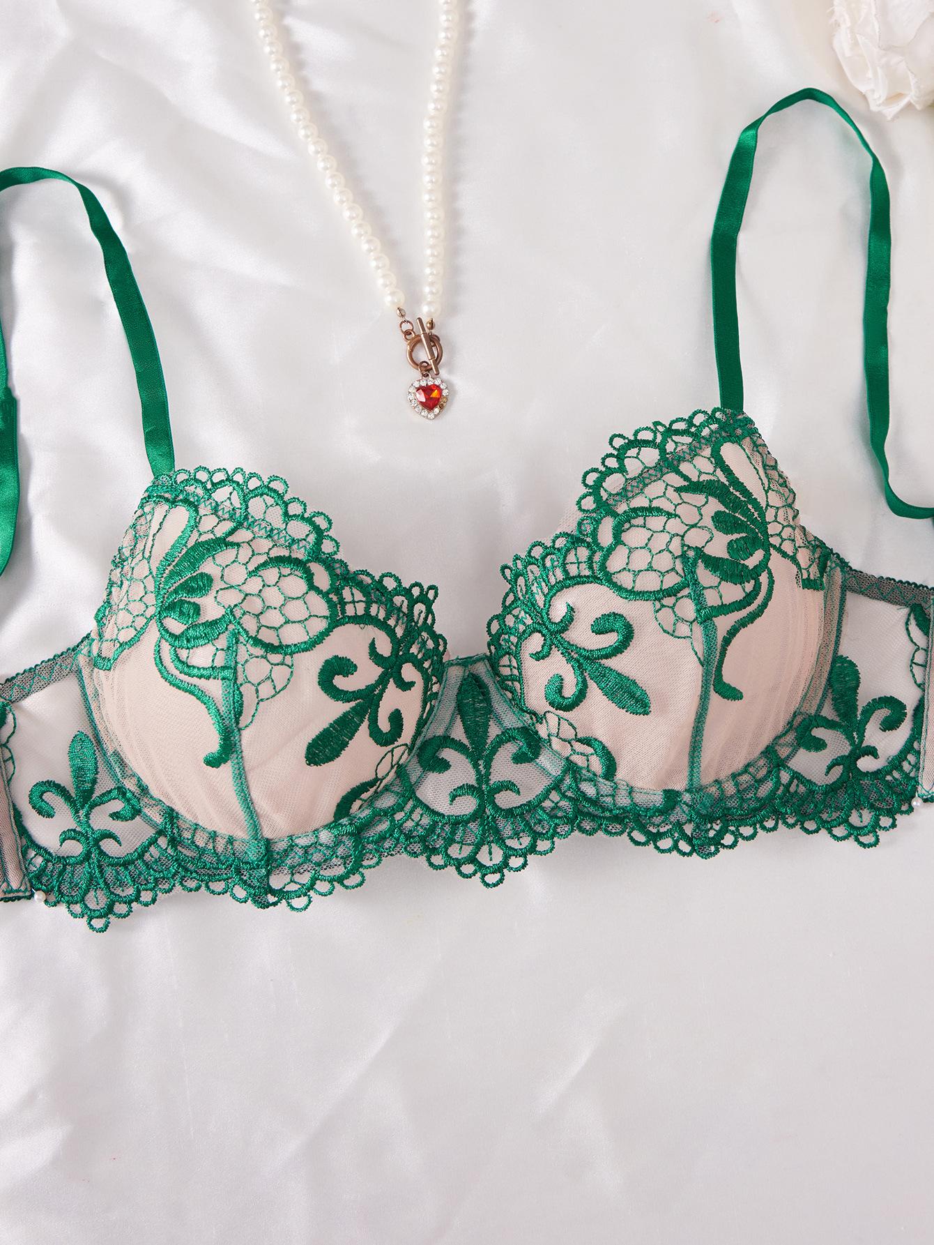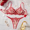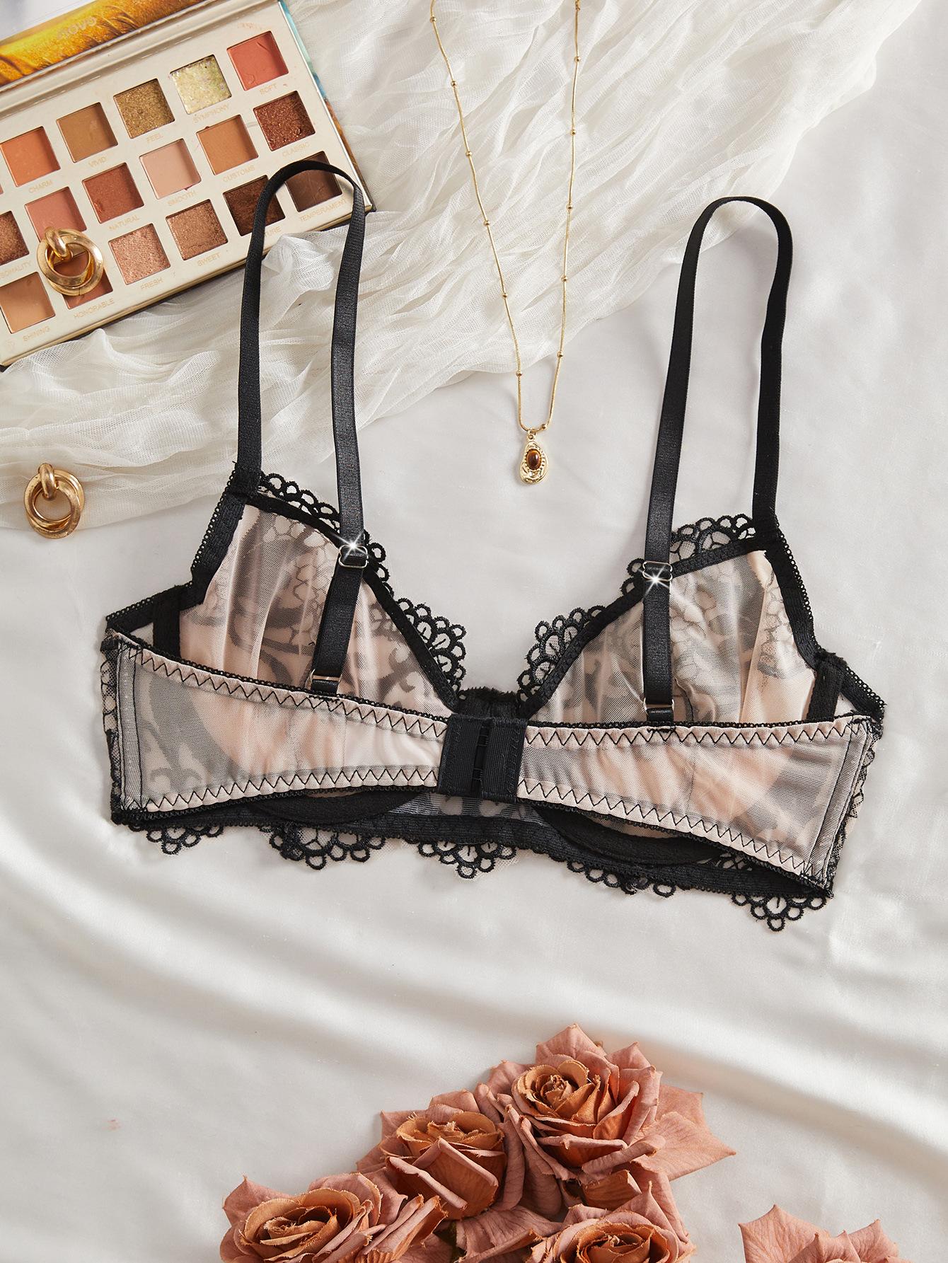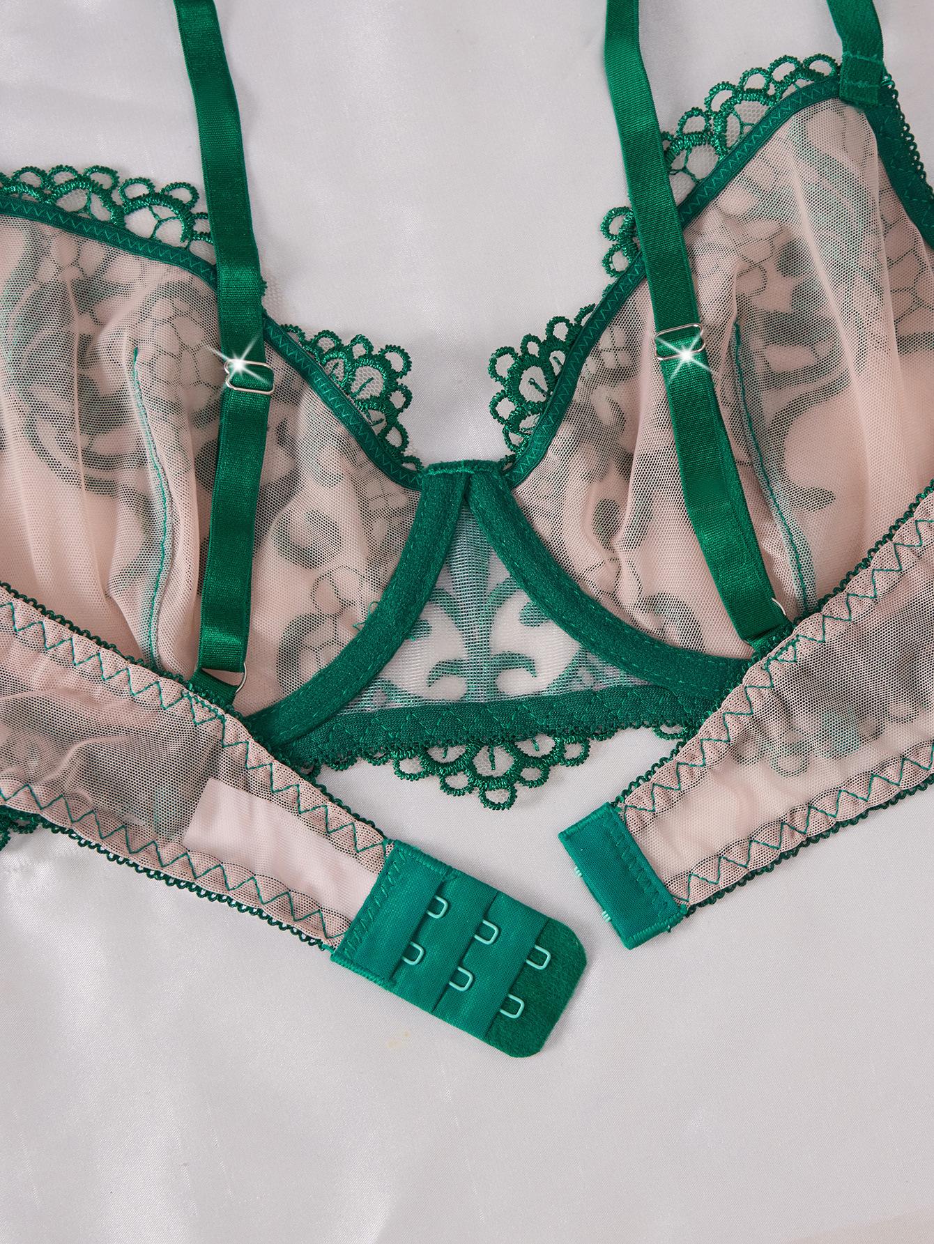 Conjunto de Ropa Interior Sexy de Moda de Tres Puntos de Malla Transparente con Bordado Europeo y Americano Transfronterizo, Copa Doble con Efecto Push-Up para Mujer