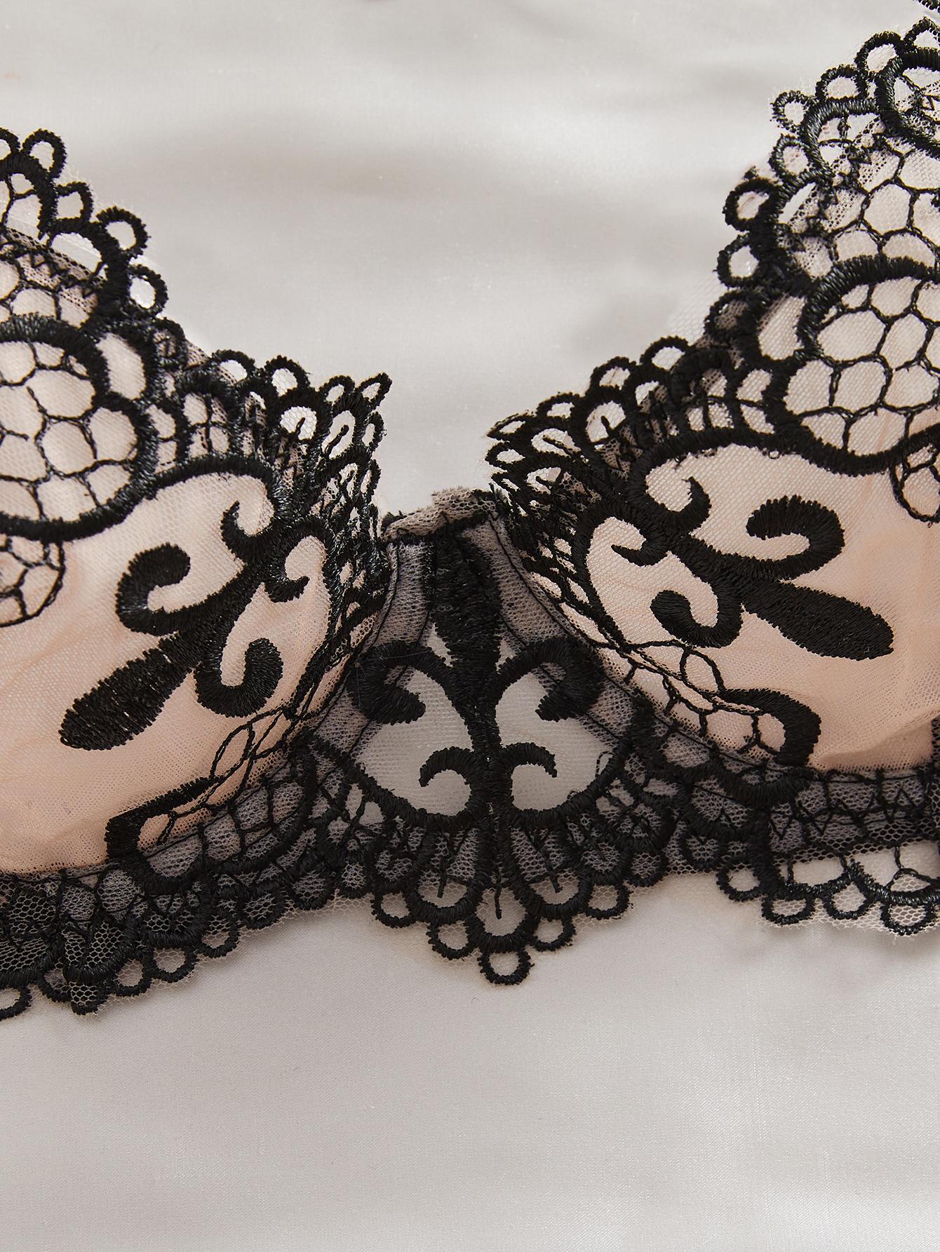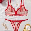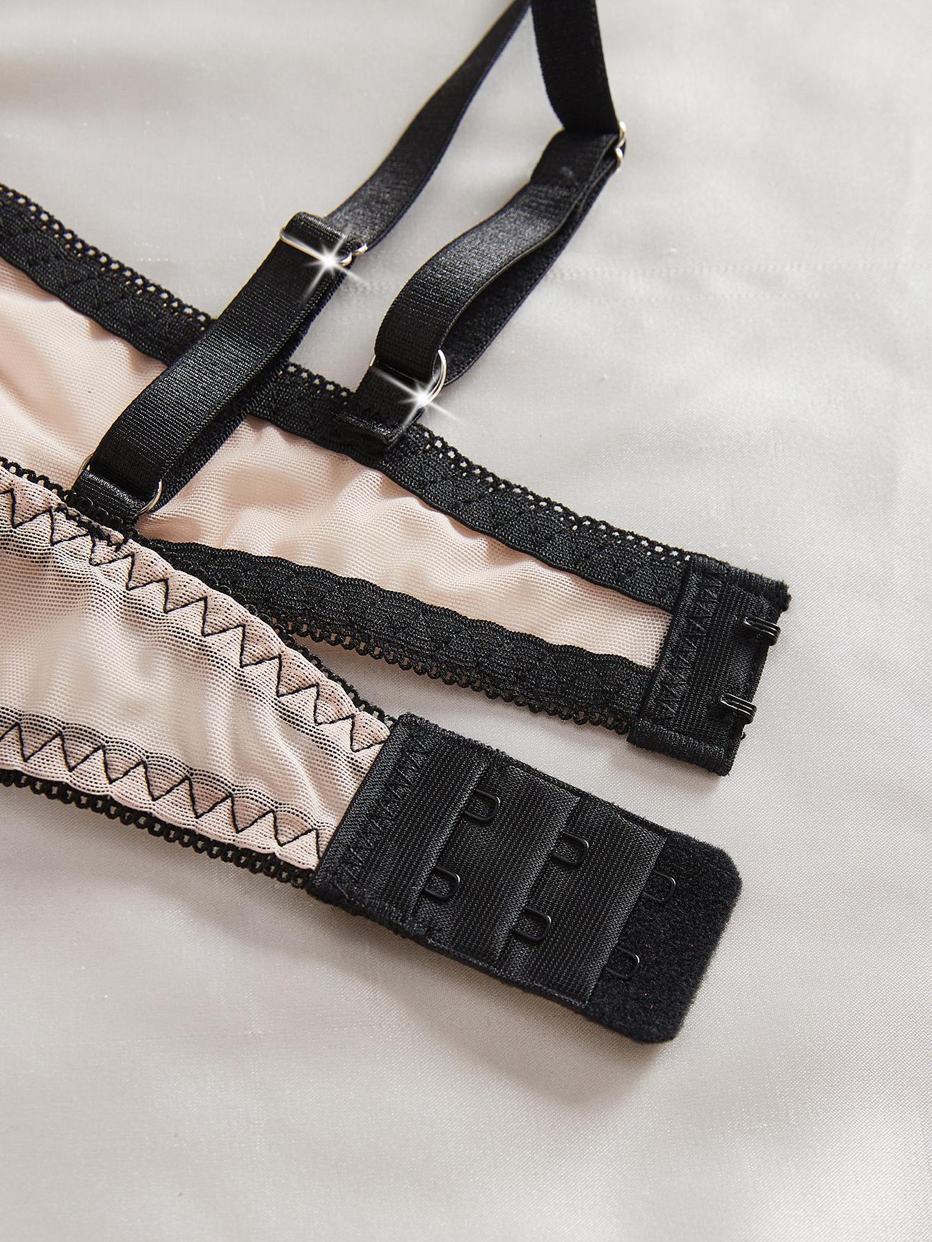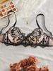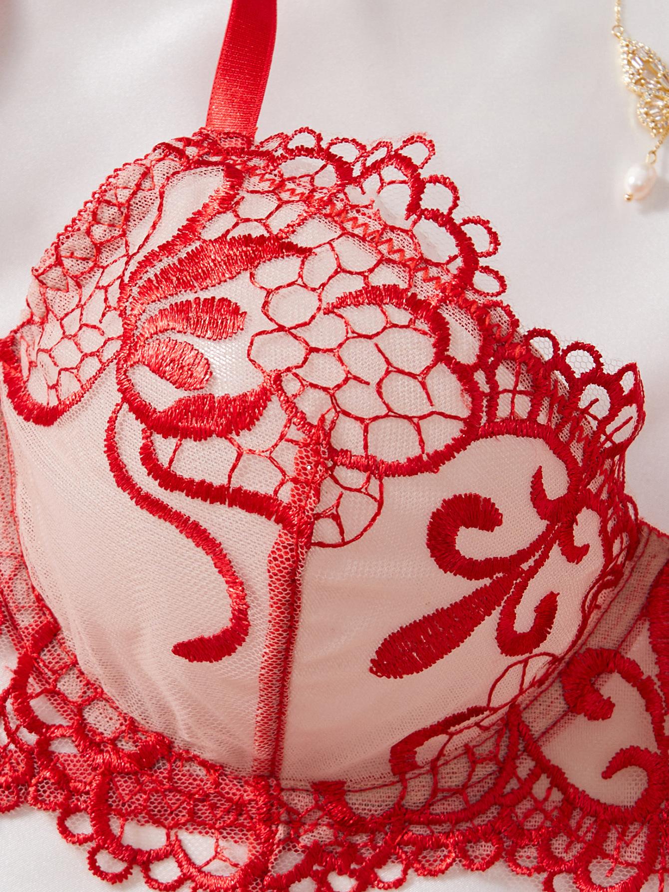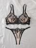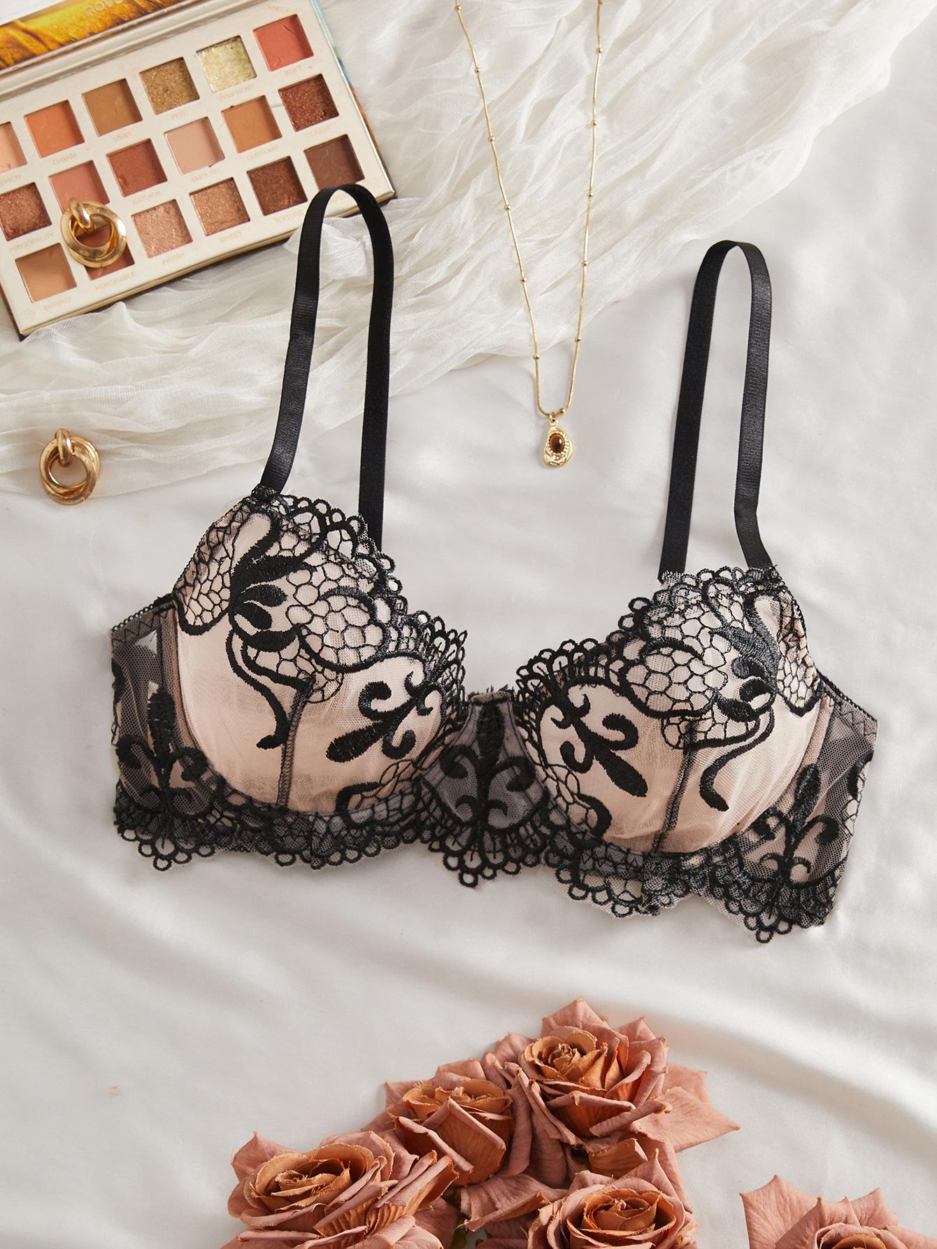 Conjunto de Ropa Interior Sexy de Moda de Tres Puntos de Malla Transparente con Bordado Europeo y Americano Transfronterizo, Copa Doble con Efecto Push-Up para Mujer