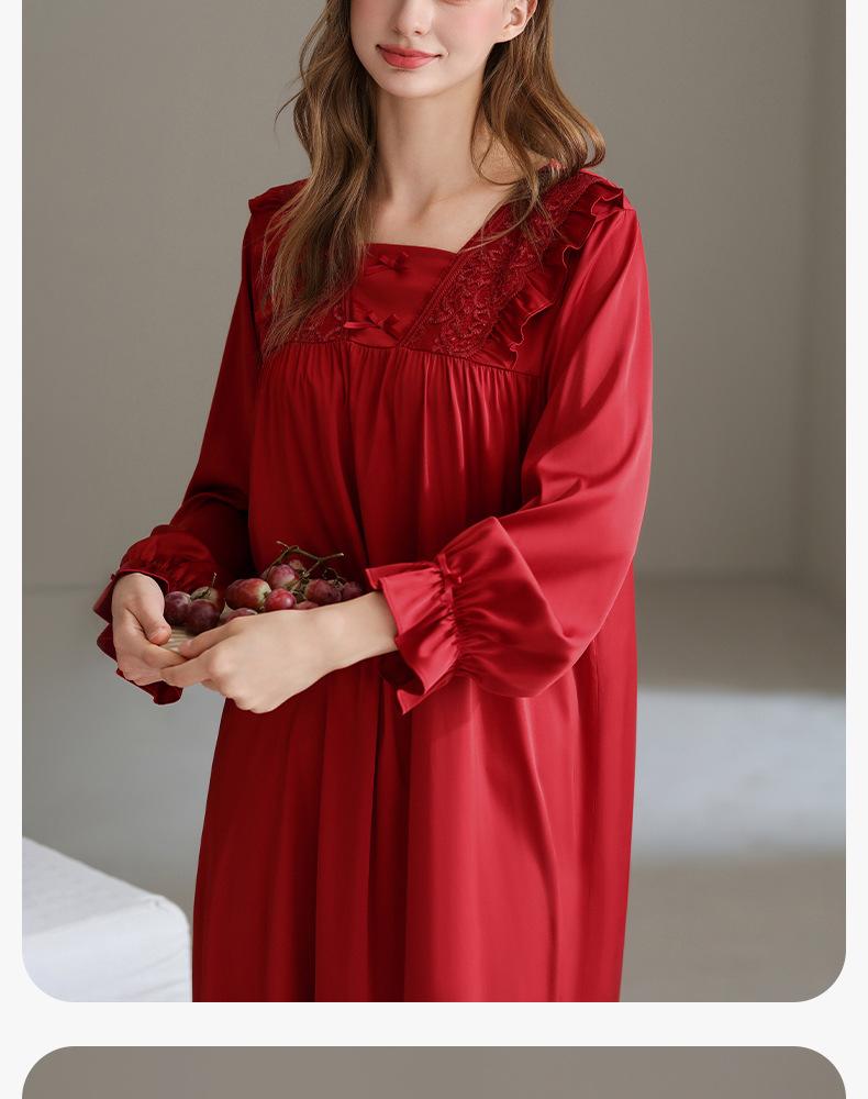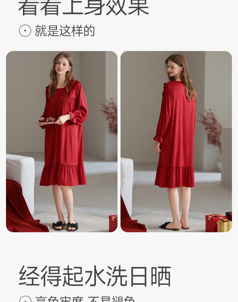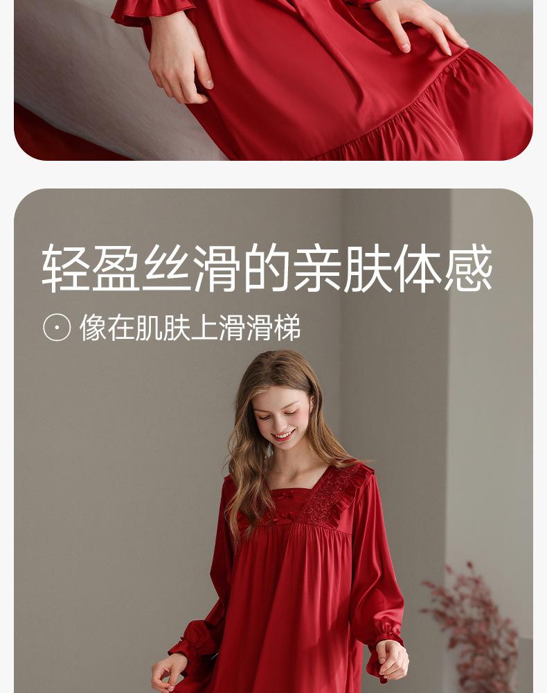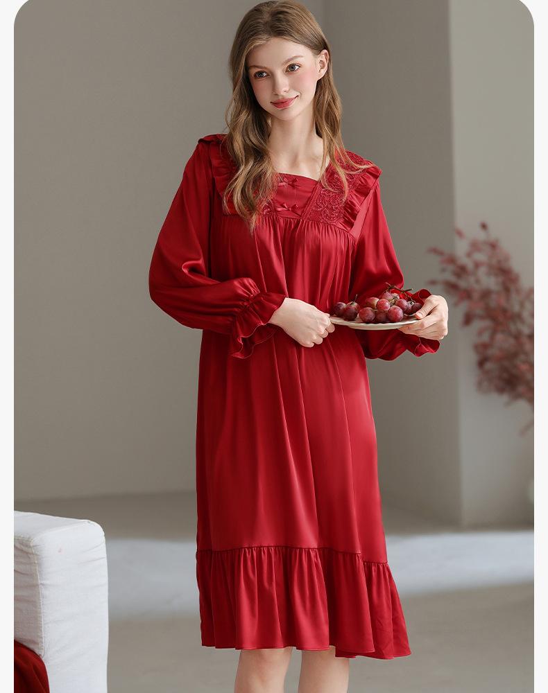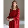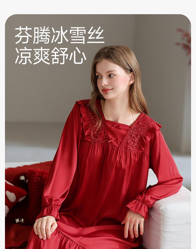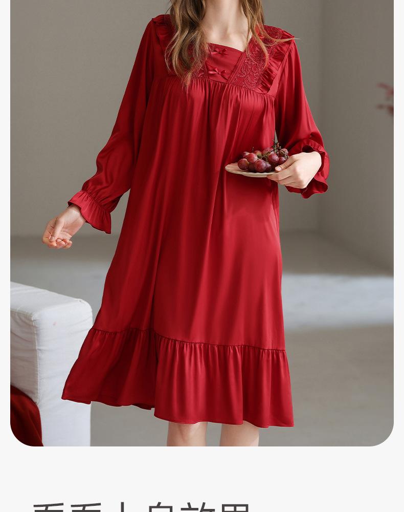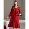 [Seda de Hielo Antibacteriana 5A] Camisón de Mujer Primavera y Otoño Manga Larga Pijama Rojo Boda Año Suelto Falda Media