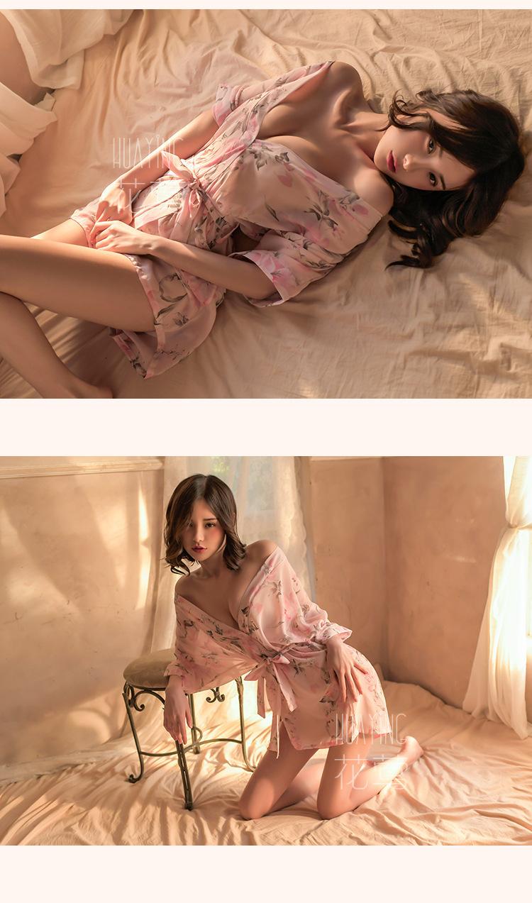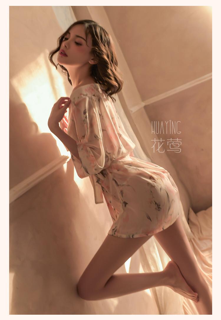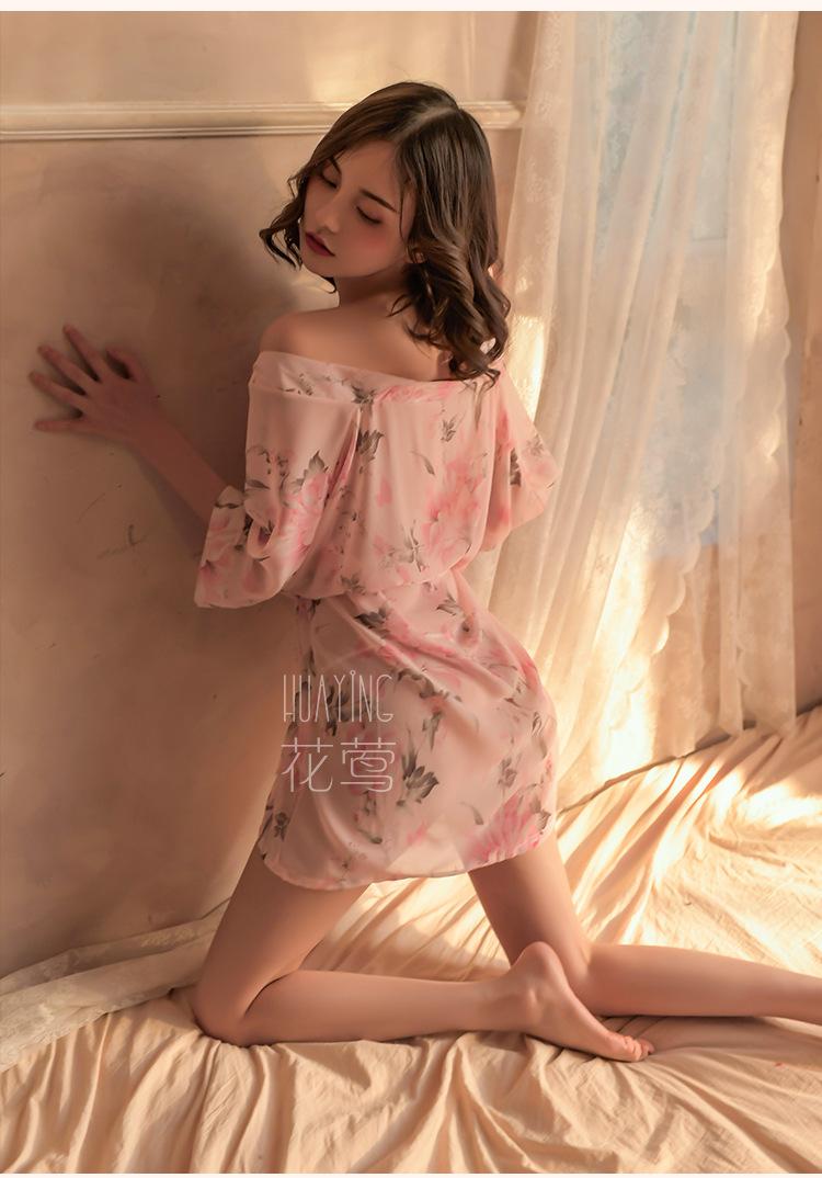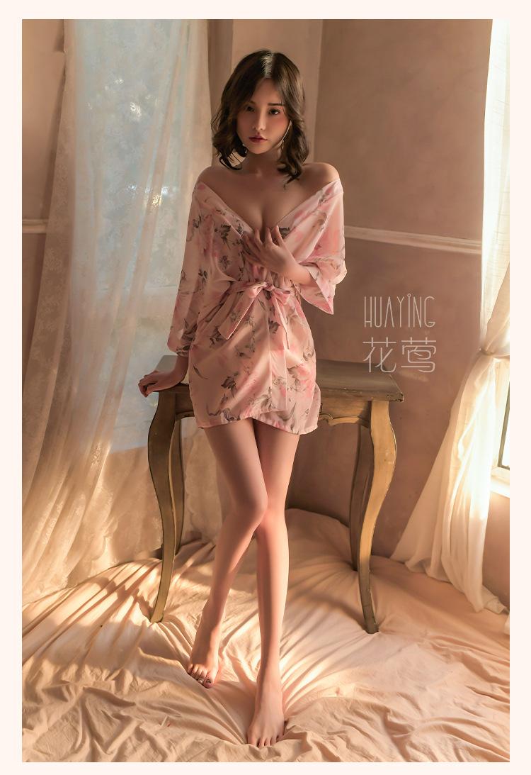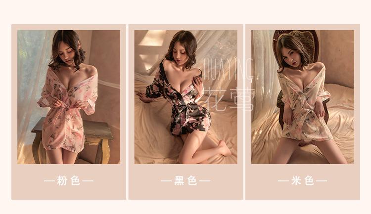 Lencería Sexy Pijama Sexy para Mujer Tentación Kimono Cárdigan Estampado de Chifón Japonés Conjunto de Camisón Transparente 1709