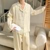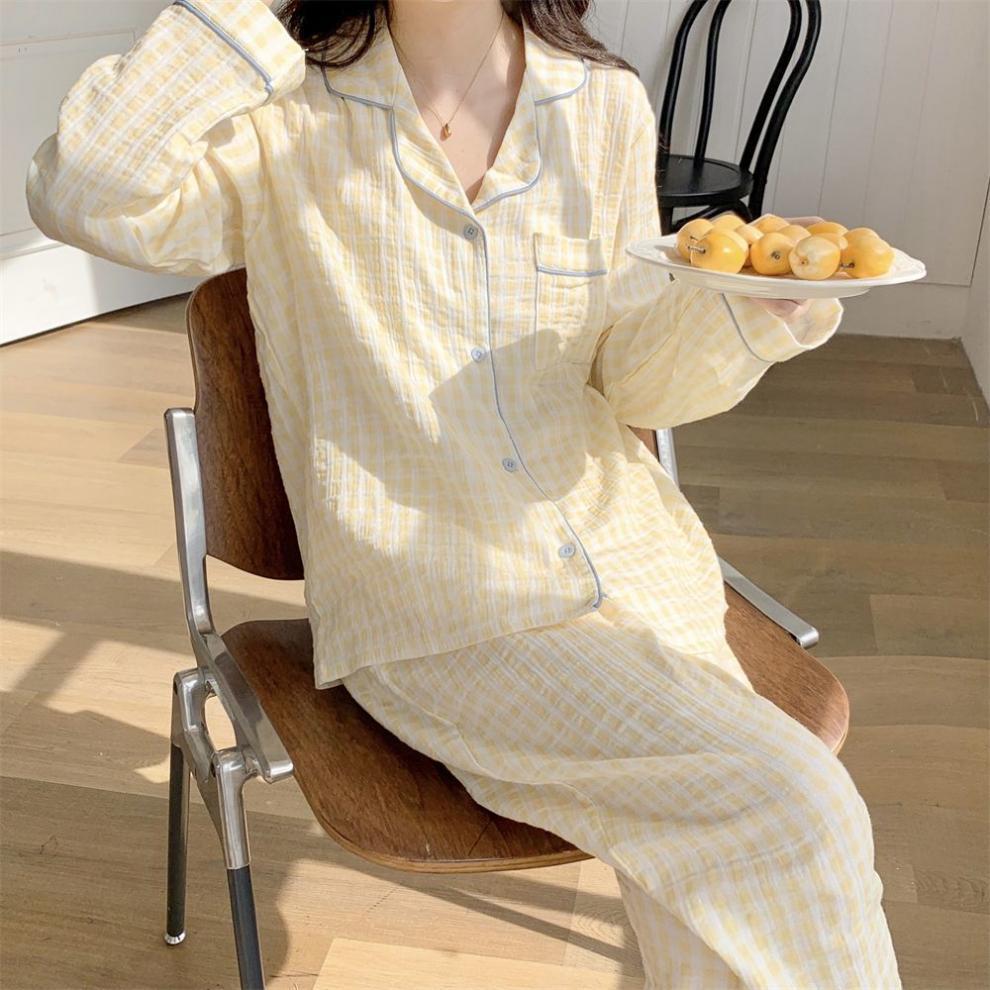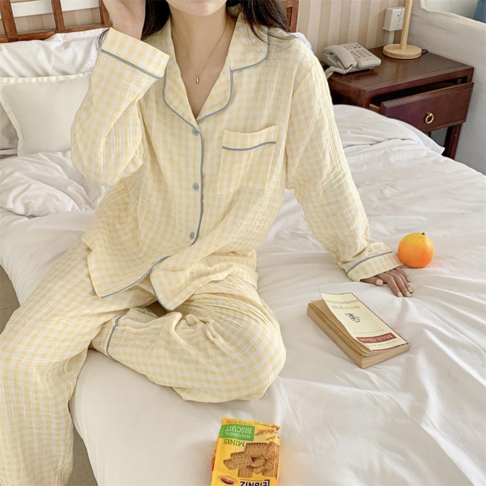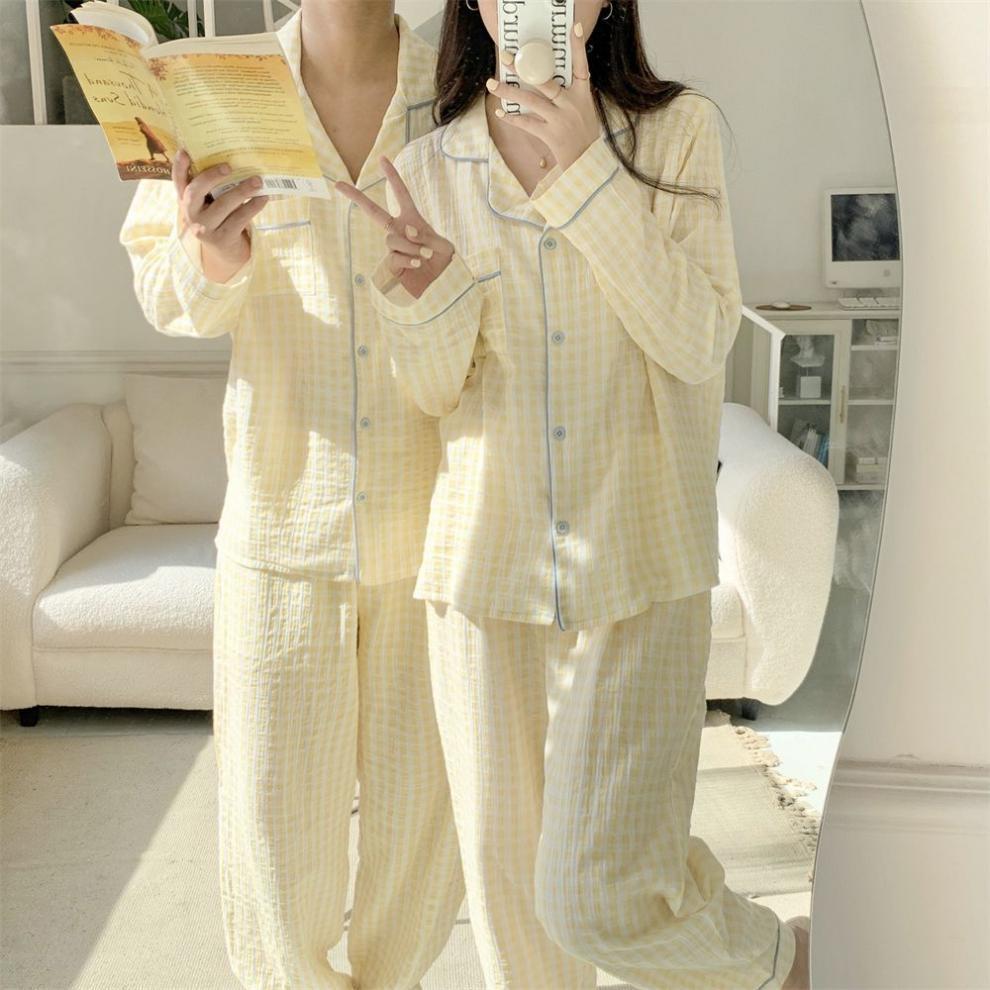 Pijamas de Pareja a Cuadros Contrastantes Estilo Japonés de Primavera y Otoño para Mujer, Ropa Exterior Sencilla, Ropa para Casa Linda de Manga Larga, Trajes para Hombre