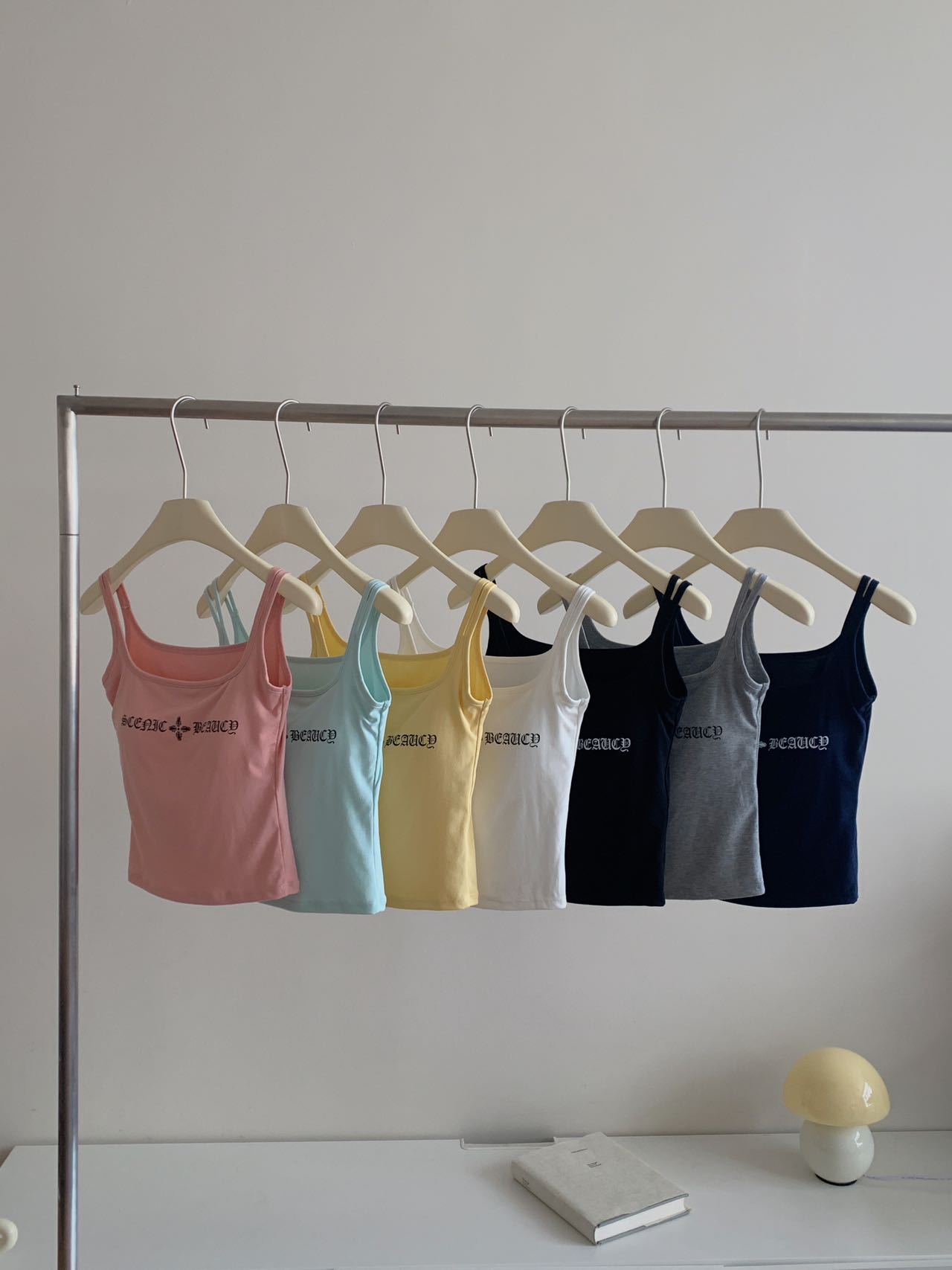 Black, White, Pink, Yellow, Mint green, Dark blue, Grey