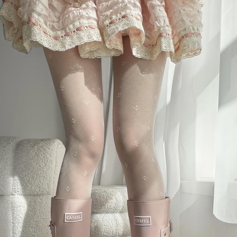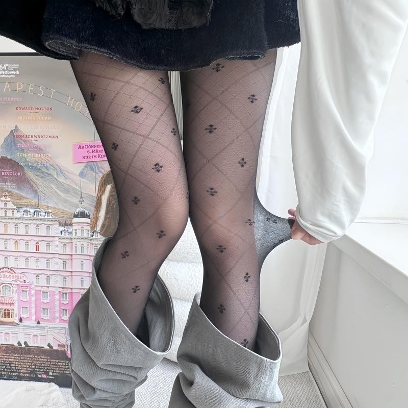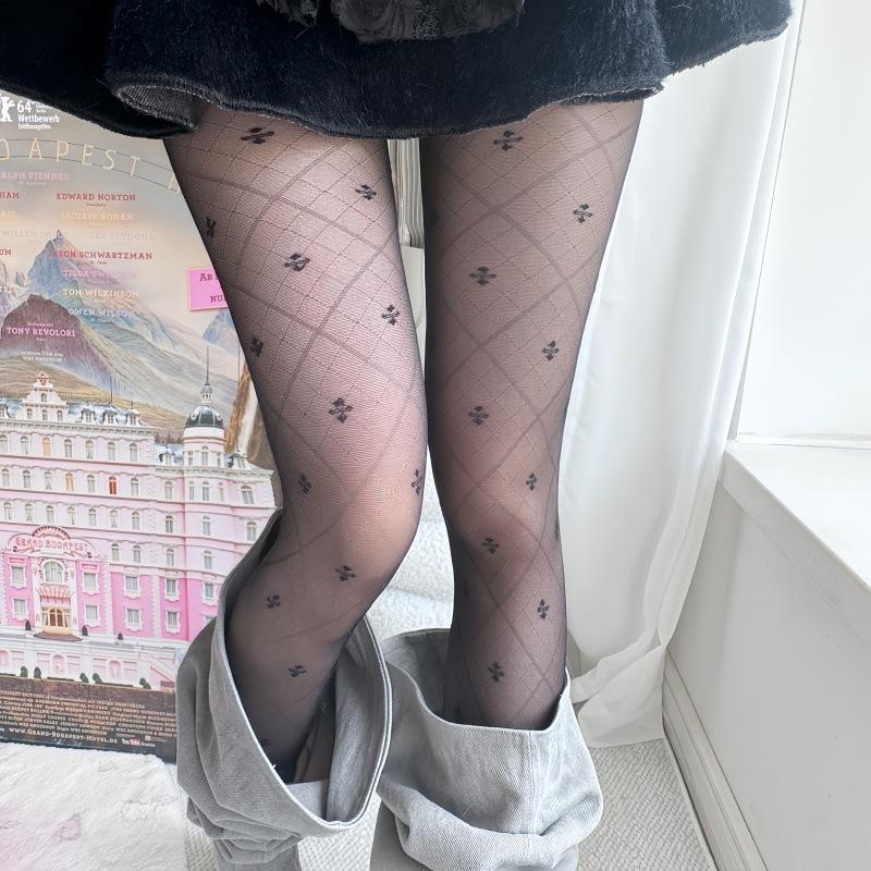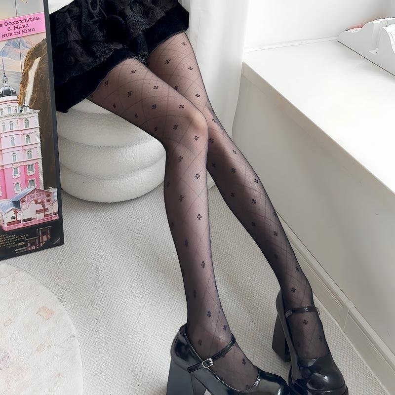 Medias Negras de Seda con Base de Flor de Cuatro Hojas Calcetines Pantimedias Cuadriculadas Delgadas Jk Sexy Primavera y Otoño Jacquard Medias de Seda Negra Artefacto