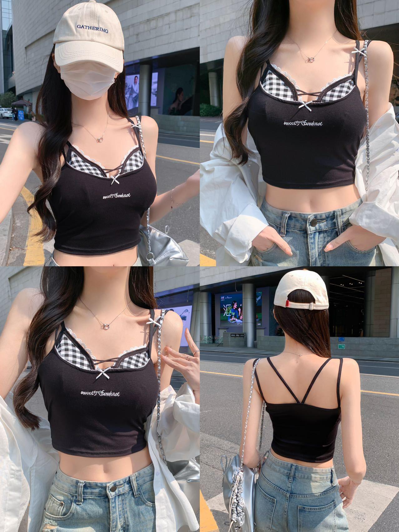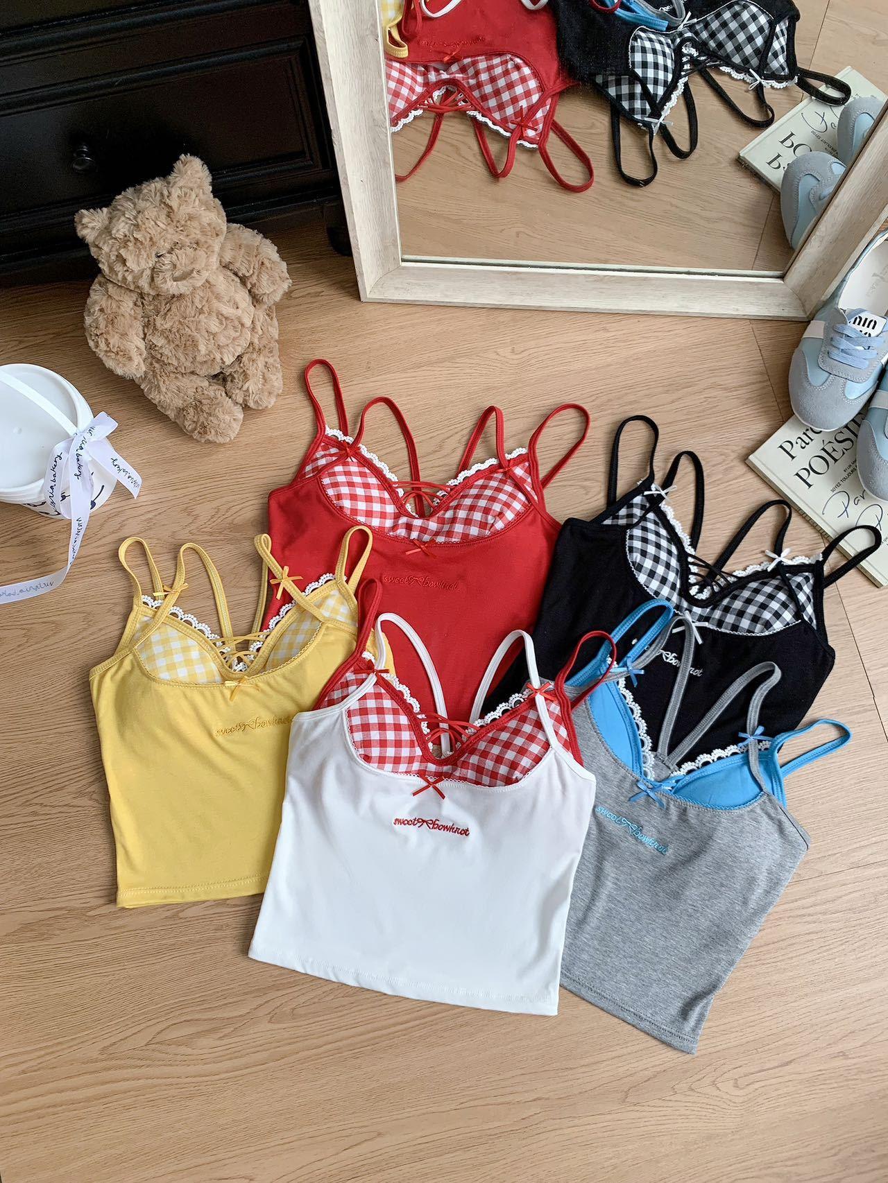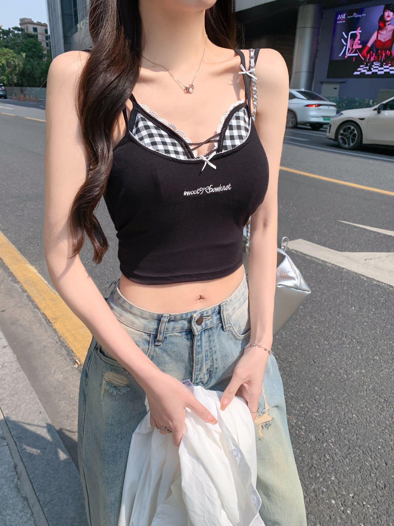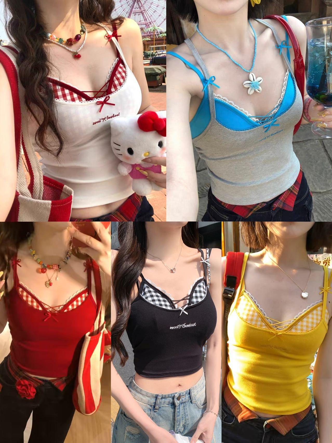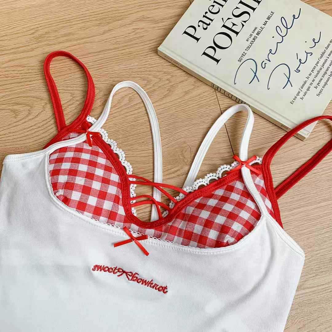 Estilo Deseo Puro Falso Dos Piezas Camisola Colorida a Cuadros con Tirantes Cruzados Verano de Chica Caliente Sexy Versátil Ropa Exterior Top Base
