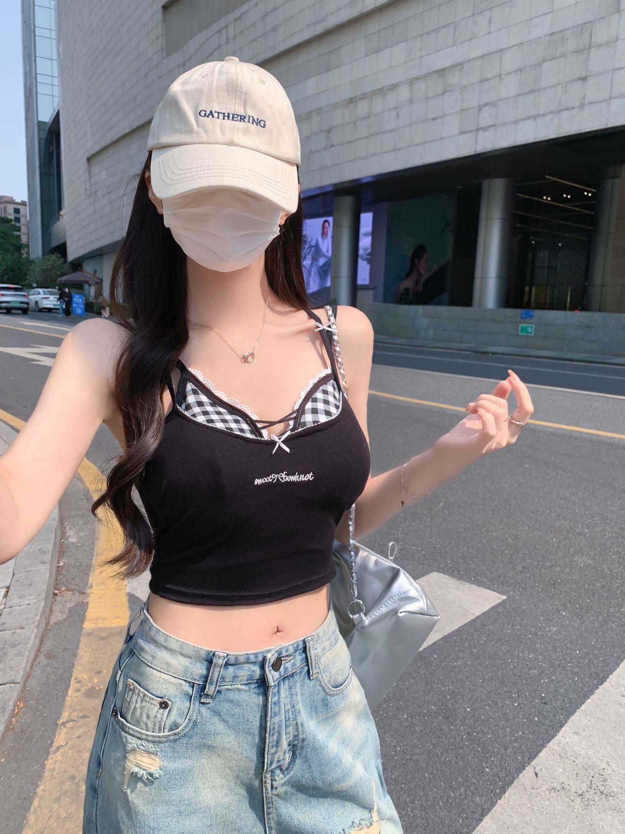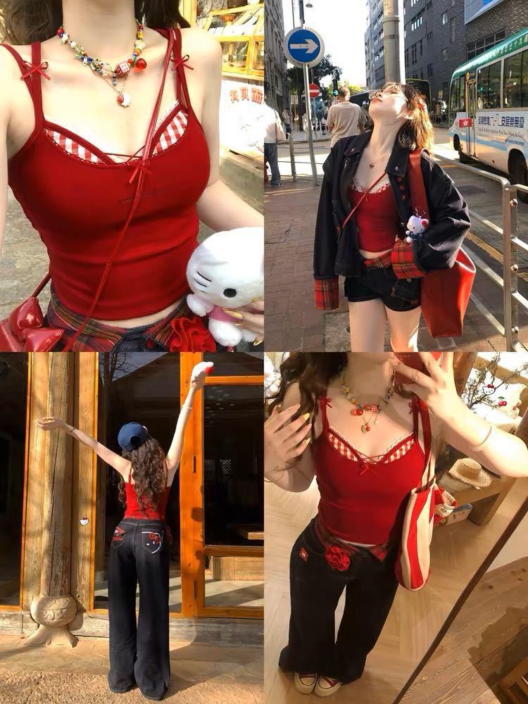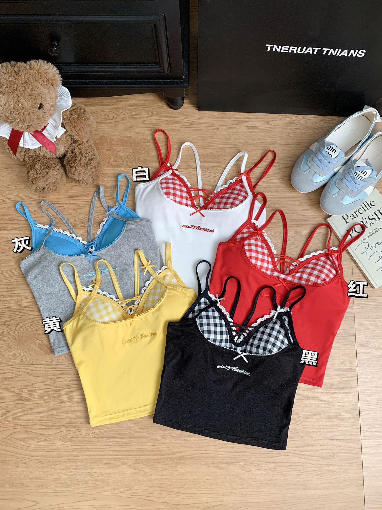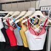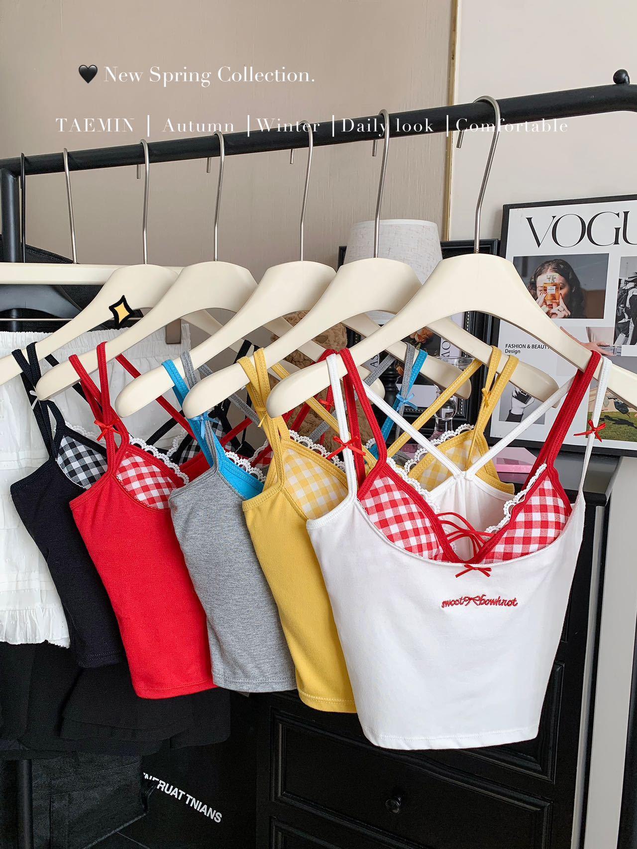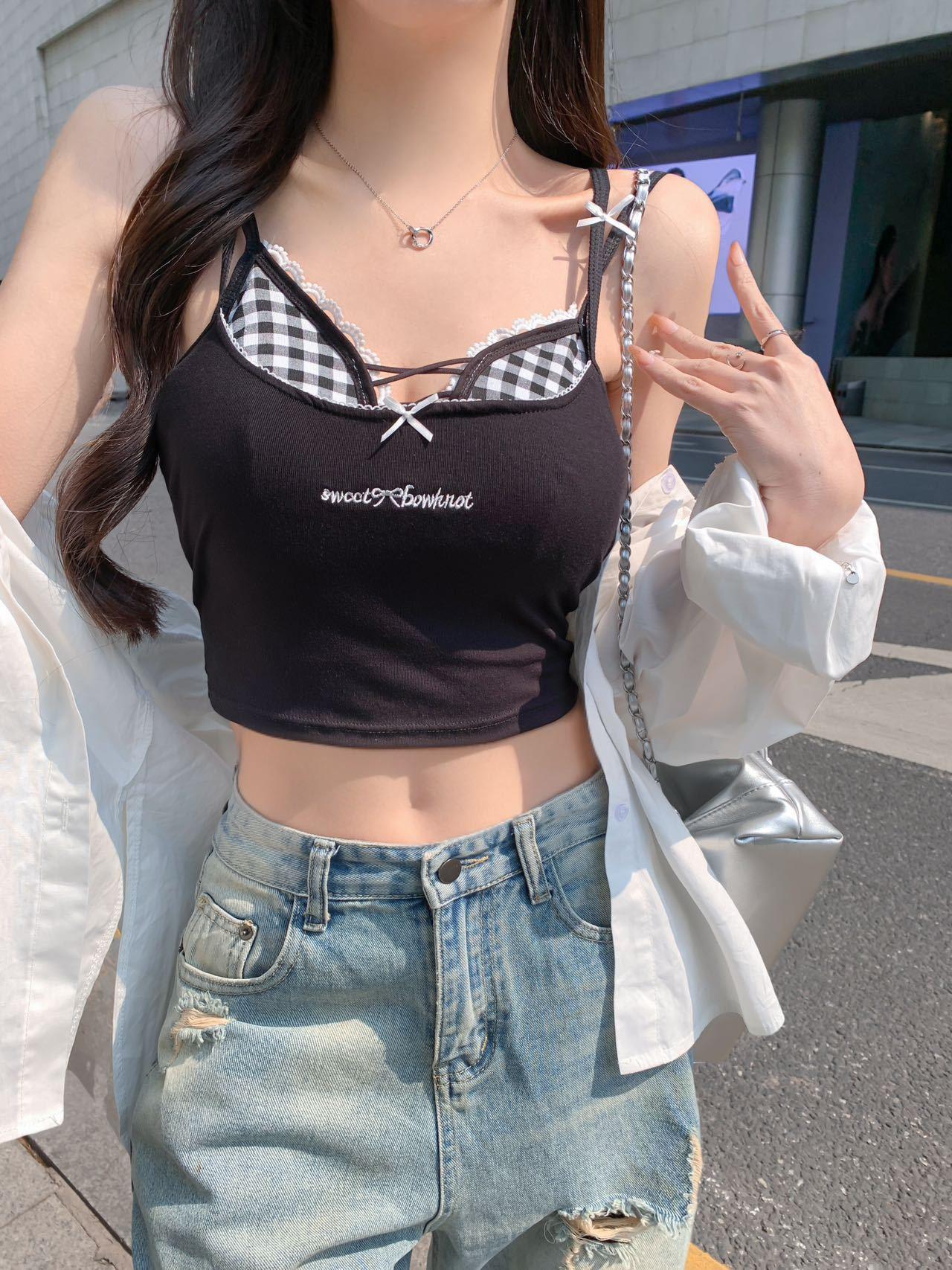 Estilo Deseo Puro Falso Dos Piezas Camisola Colorida a Cuadros con Tirantes Cruzados Verano de Chica Caliente Sexy Versátil Ropa Exterior Top Base