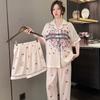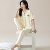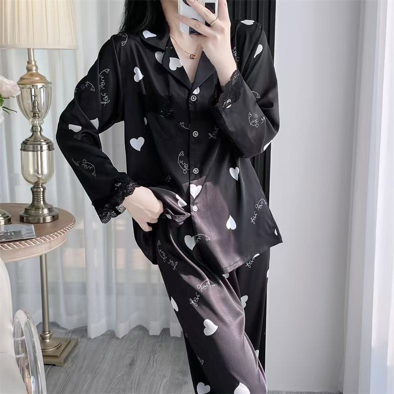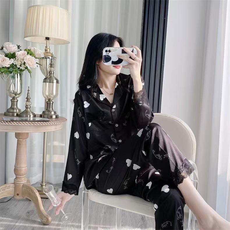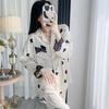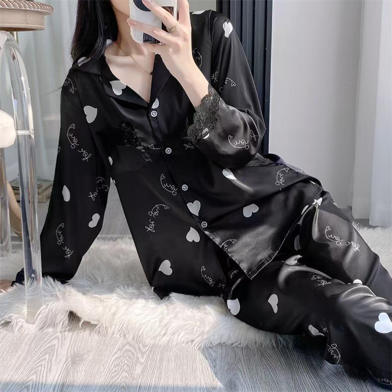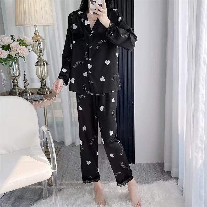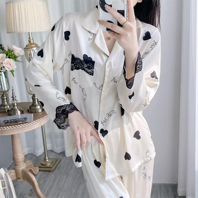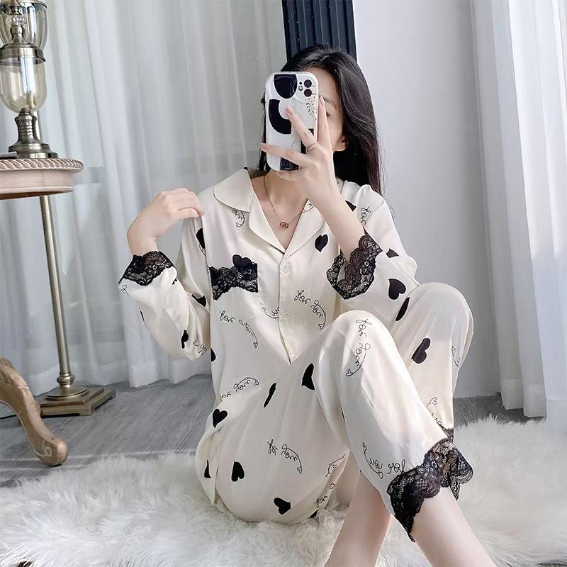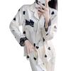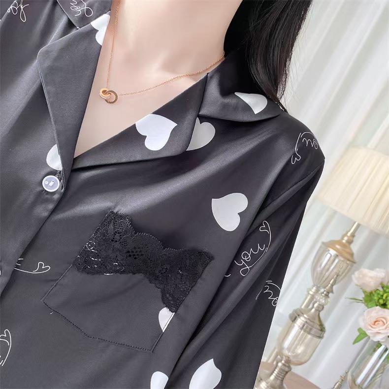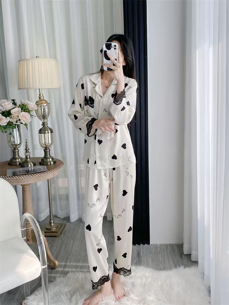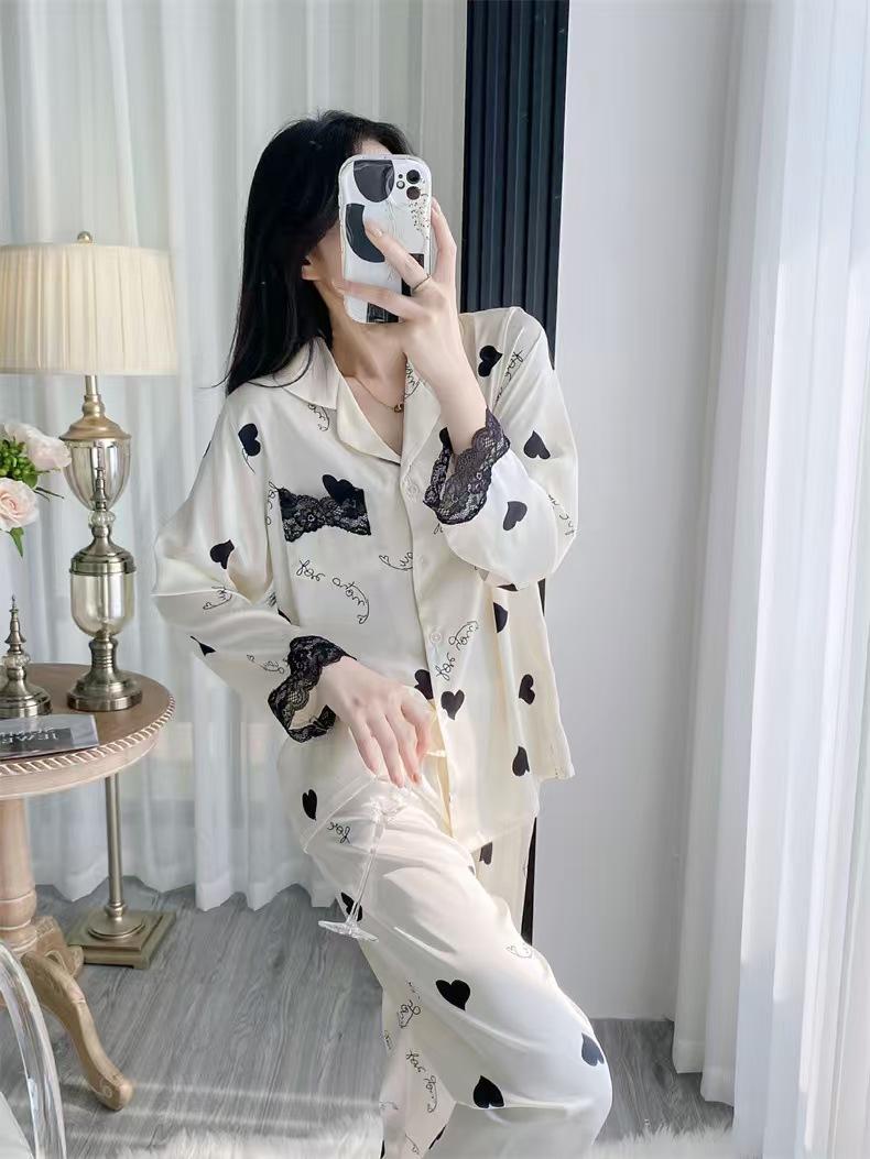 Pijama de Manga Larga para Mujer Nuevo Verano 2024 Estilo Coreano Seda de Hielo Traje Cárdigan Pijama con Estampado de Corazones Ropa para el Hogar