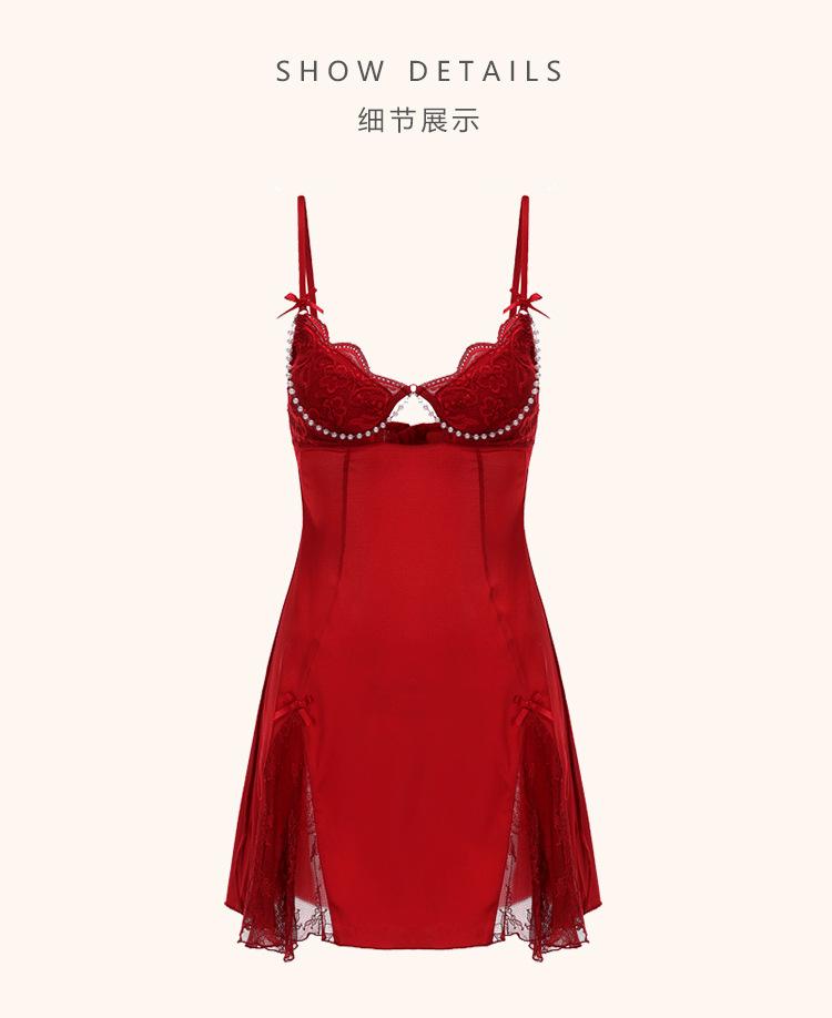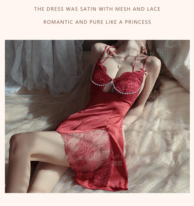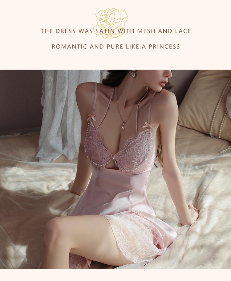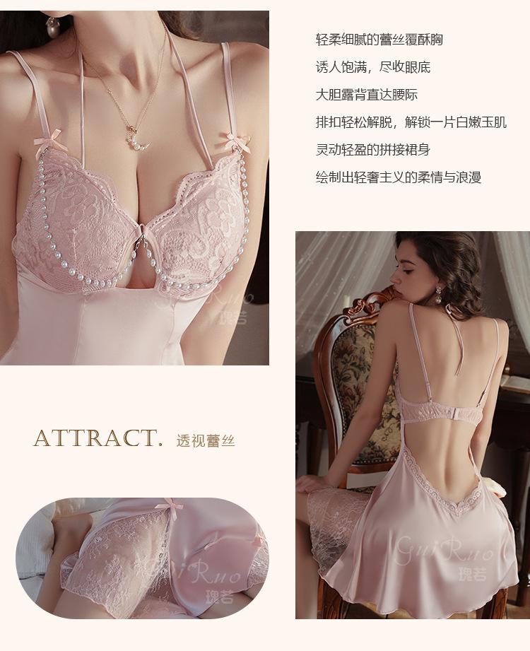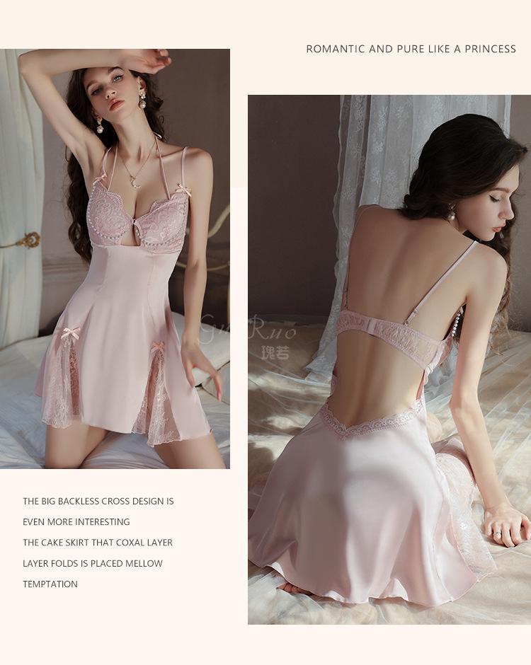Guiruo Talla Grande Lencería de Satén de Lujo Accesible Encaje Dulce Sexy Escote Profundo V con Almohadillas para el Busto Camisón para el Hogar Traje para Mujer 4681