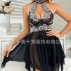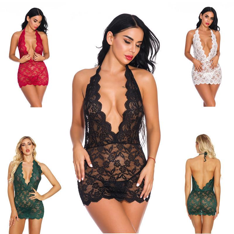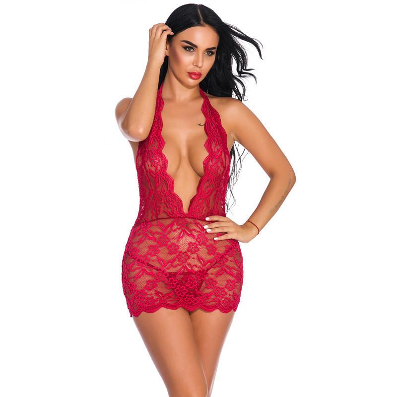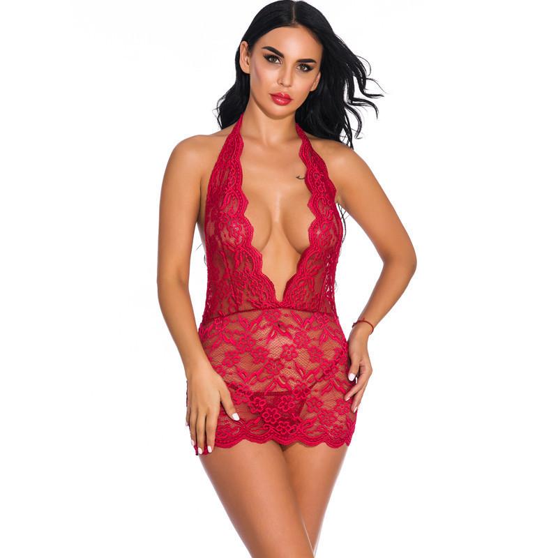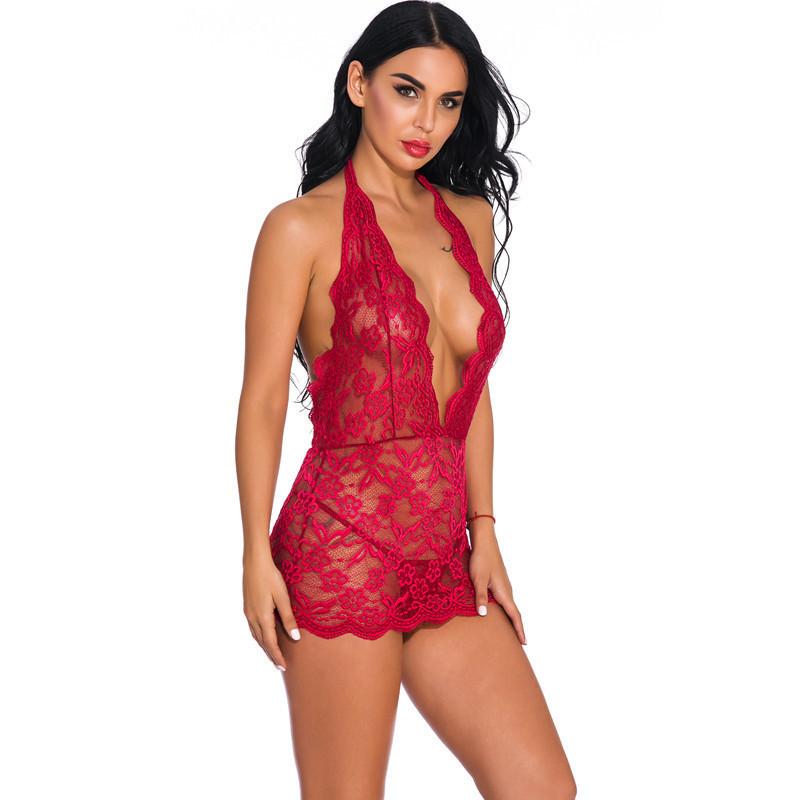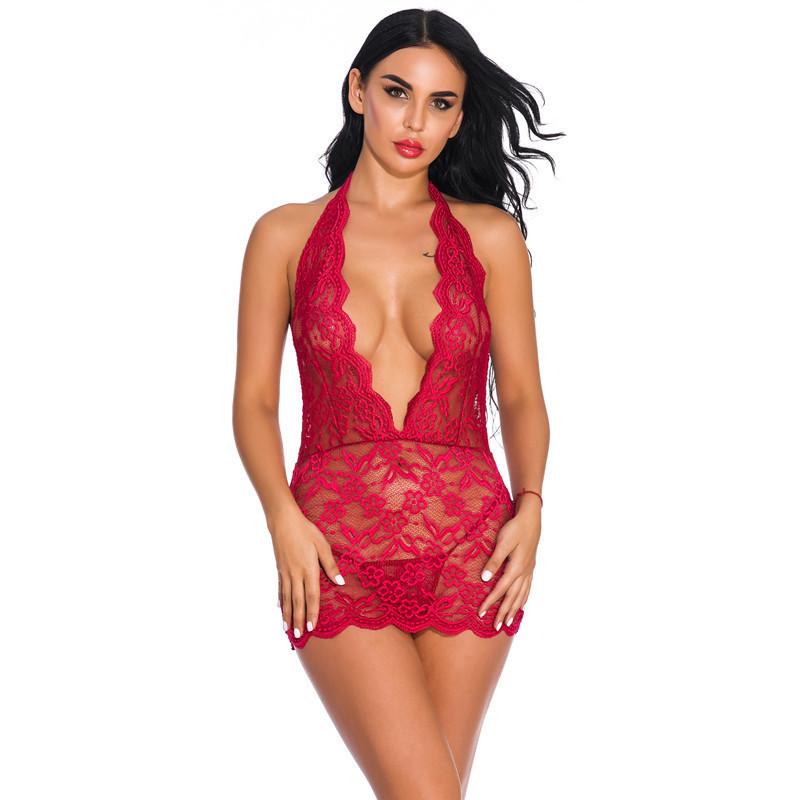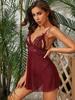 La lencería sexy para dormir presenta un diseño de cuello en V escotado, ribete de encaje en forma de abanico, lazo halter y un top con encaje floral en la espalda descubierta.