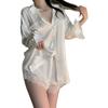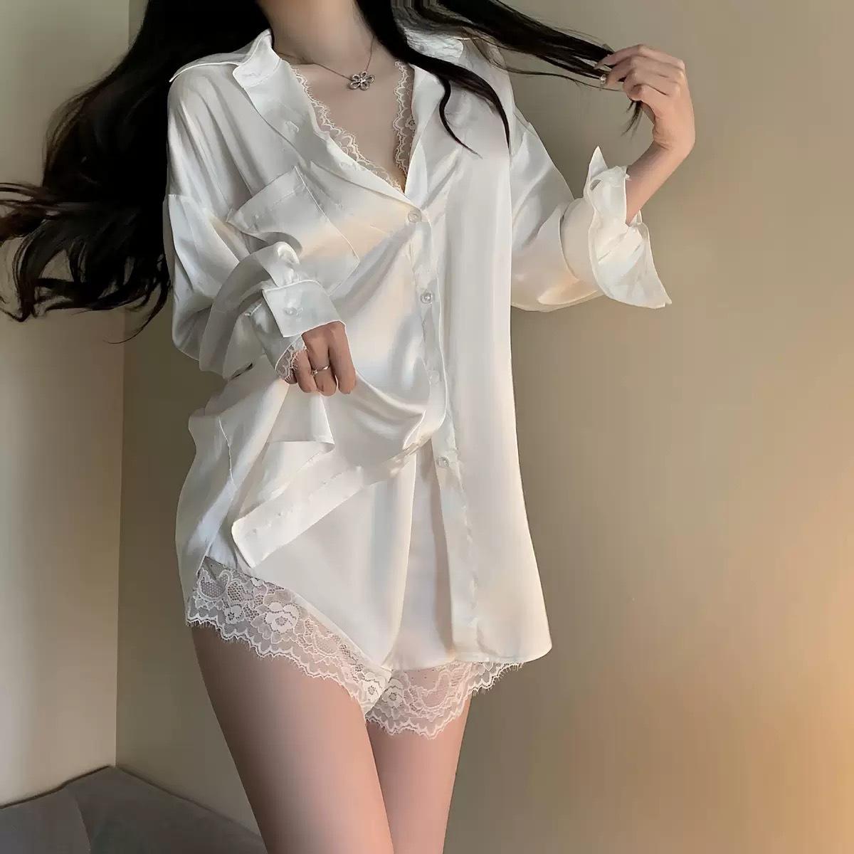 Camisa Estilo Novio Pijama Sexy para Mujer Primavera y Verano Seda de Hielo Deseo Puro Bata Delgada Holgada Talla Grande Conjunto para Estar en Casa