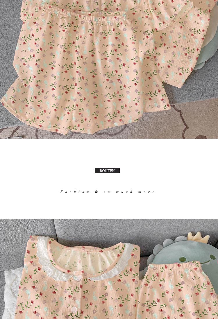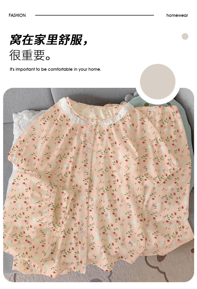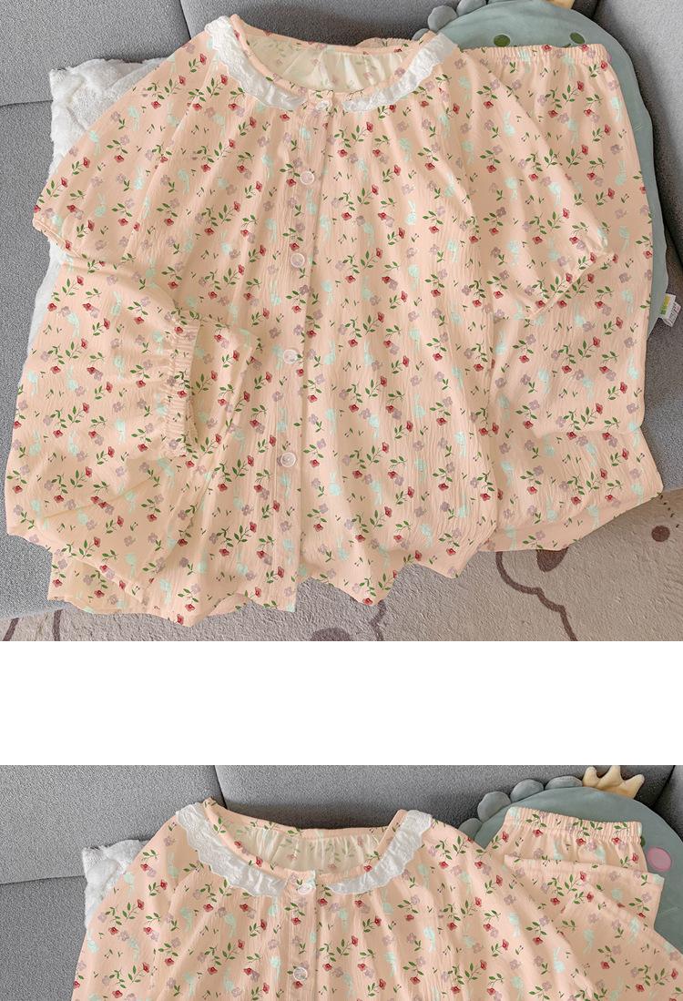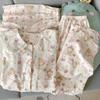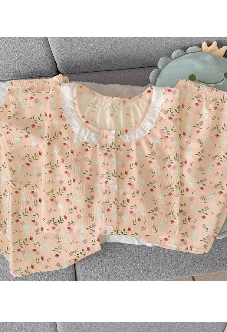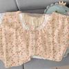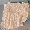 Estilo Japonés Pequeño Floral Fresco Ins Cuello Redondo Encaje Nubes Algodón Pijama de Verano para Mujer Manga Corta Ropa para el Hogar Conjunto de Tres Piezas Venta al por Mayor