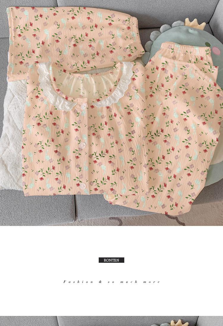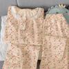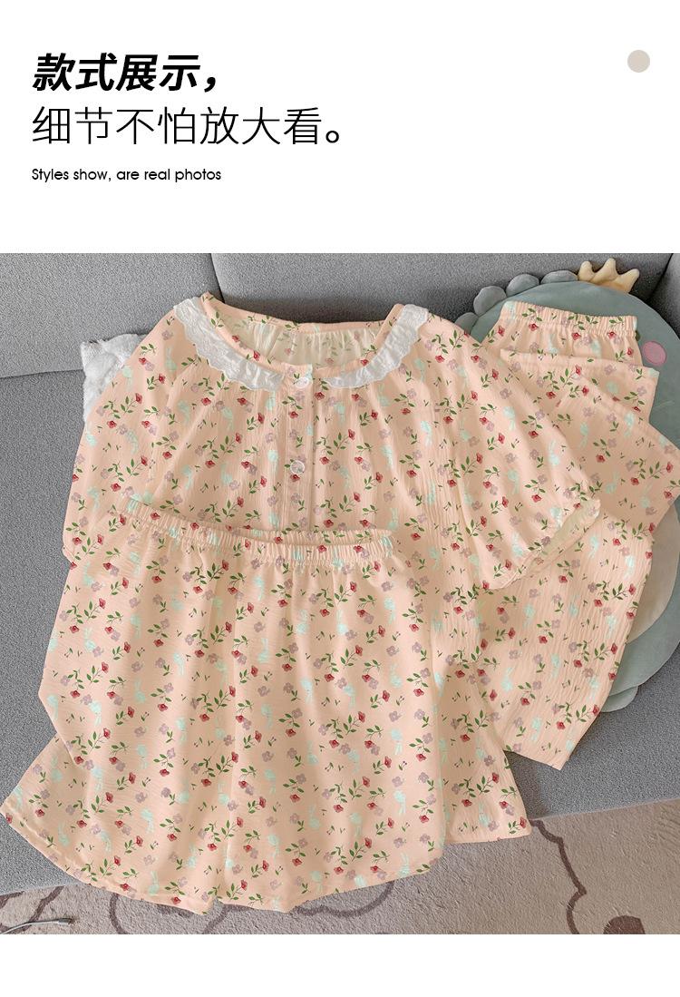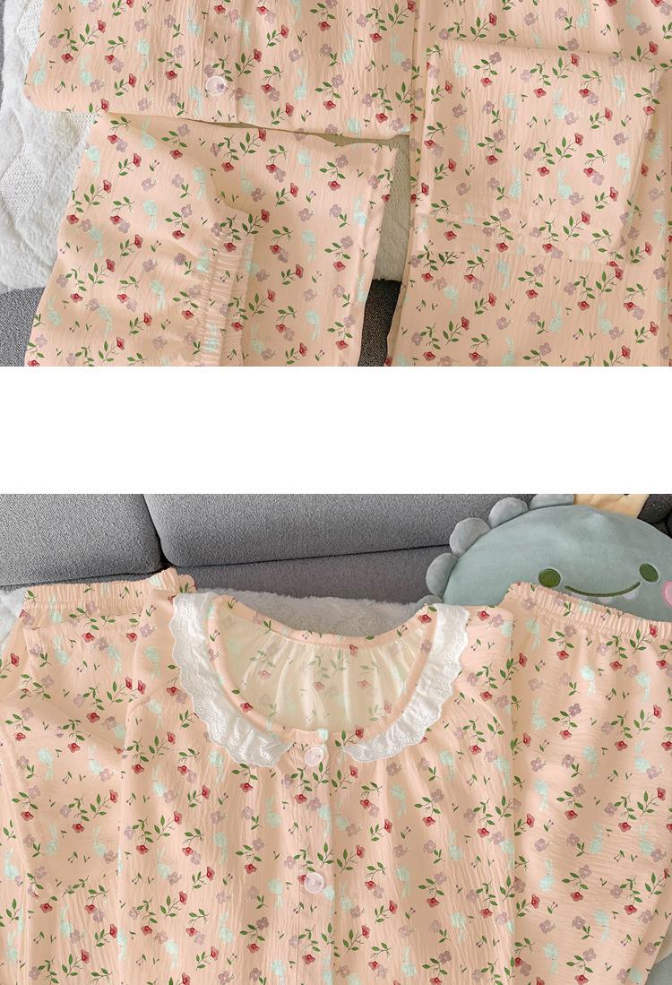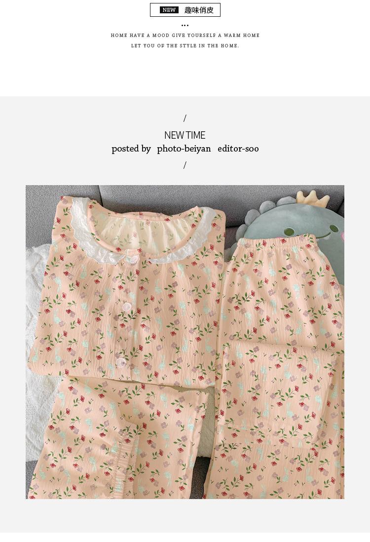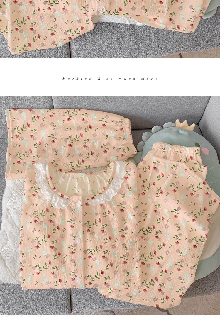 Estilo Japonés Pequeño Floral Fresco Ins Cuello Redondo Encaje Nubes Algodón Pijama de Verano para Mujer Manga Corta Ropa para el Hogar Conjunto de Tres Piezas Venta al por Mayor