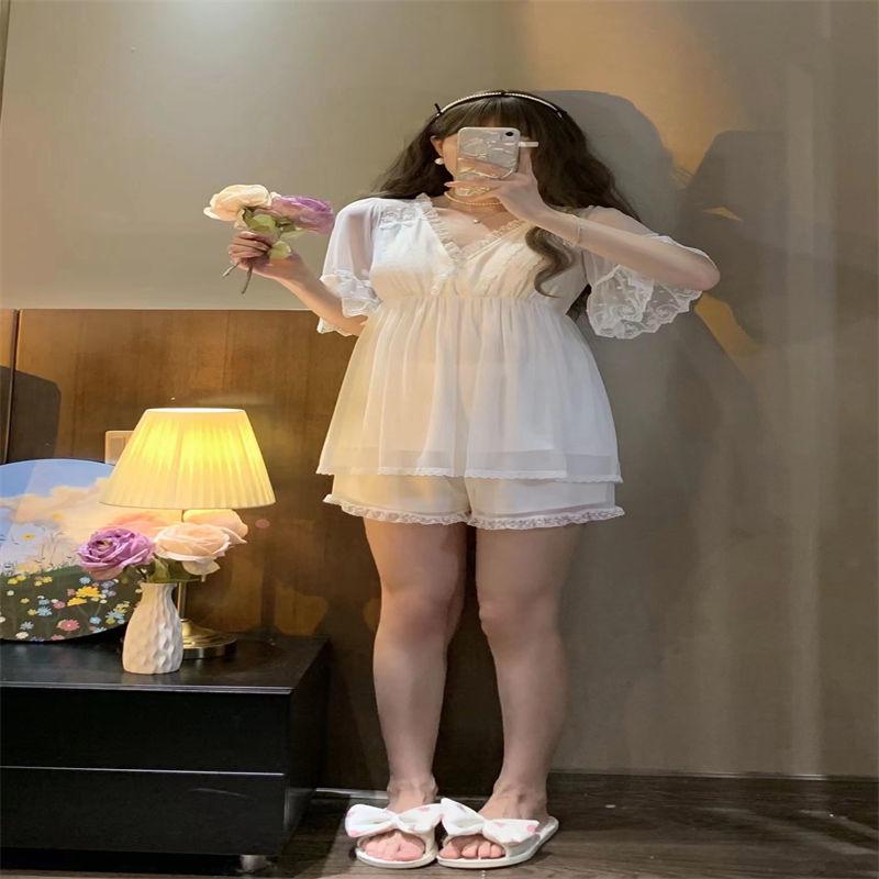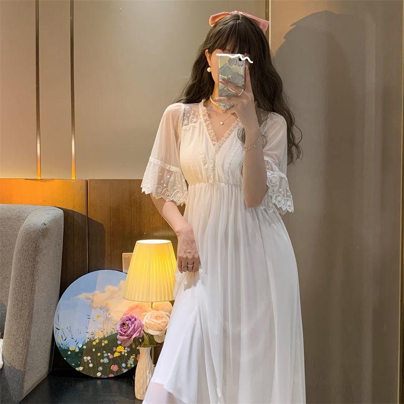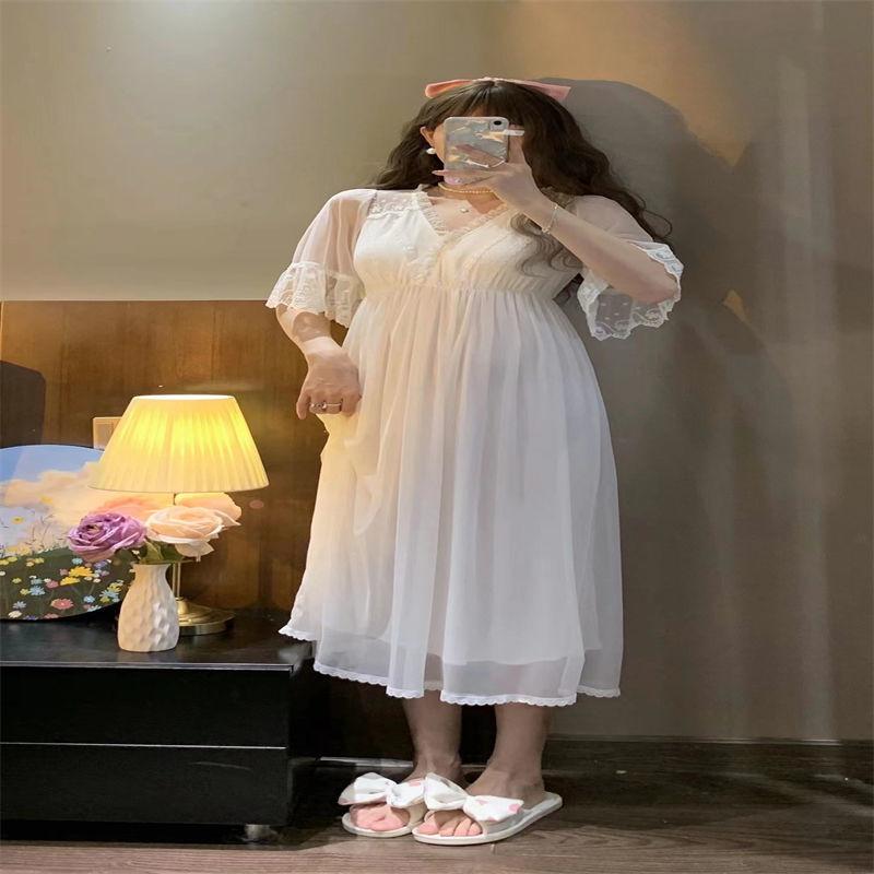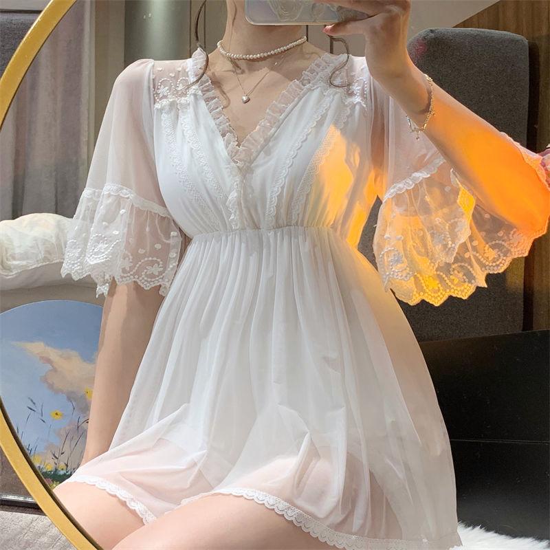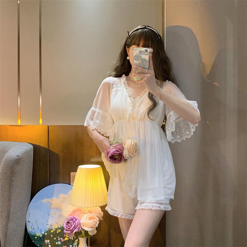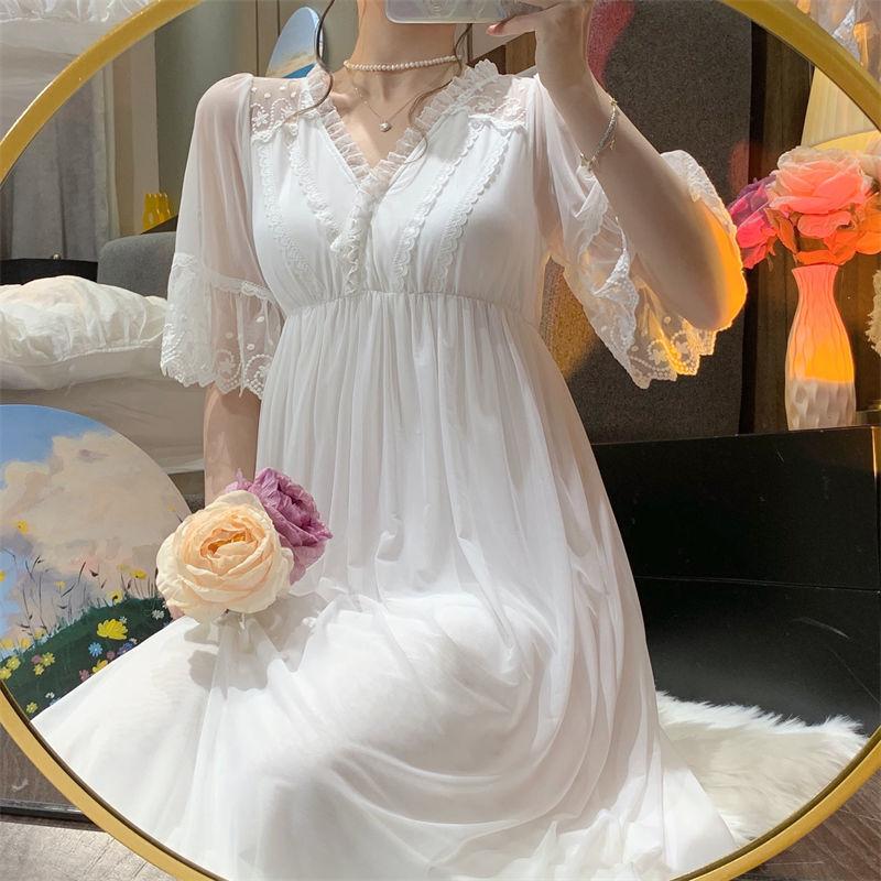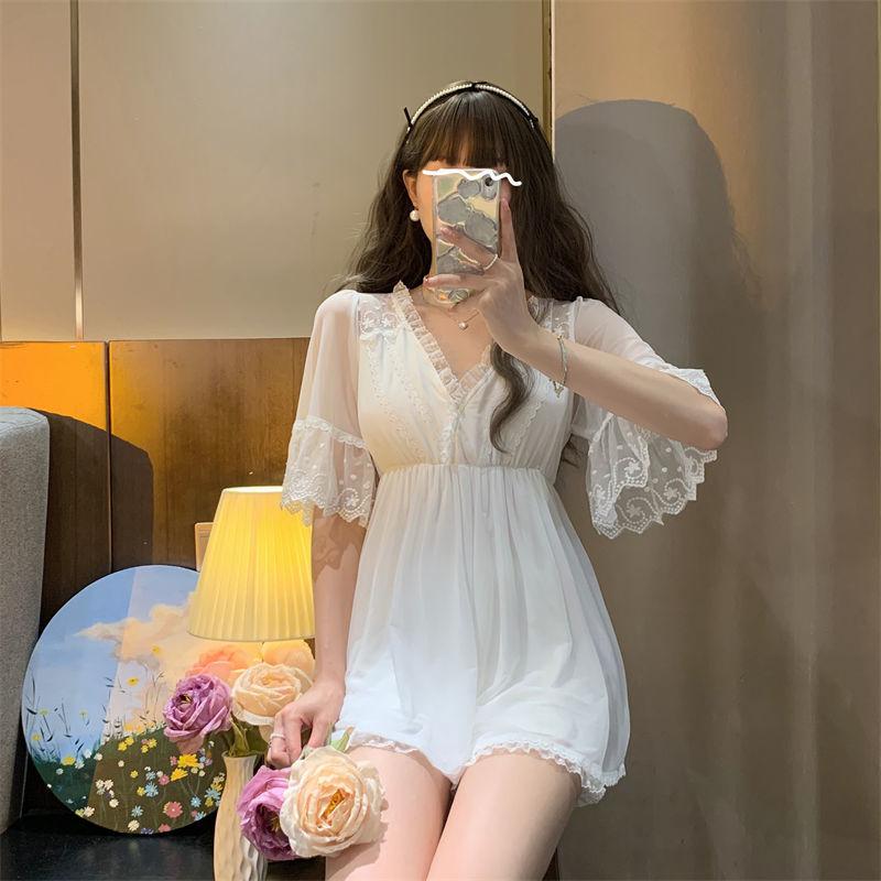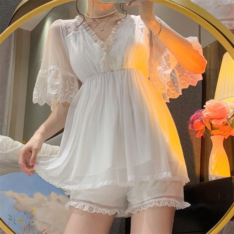 Pijama estilo palaciego con copas para el busto para mujer Verano Delgado Dulce Encaje de Malla Camisón Ropa de Exterior Ropa para el Hogar Traje de Manga Corta