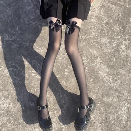 Calcetines altos hasta el muslo de seda blanca personalizados con lazo para mujer Ins Sexy Encaje Estilo Lujuria Pura Calcetines hasta el muslo Finos
