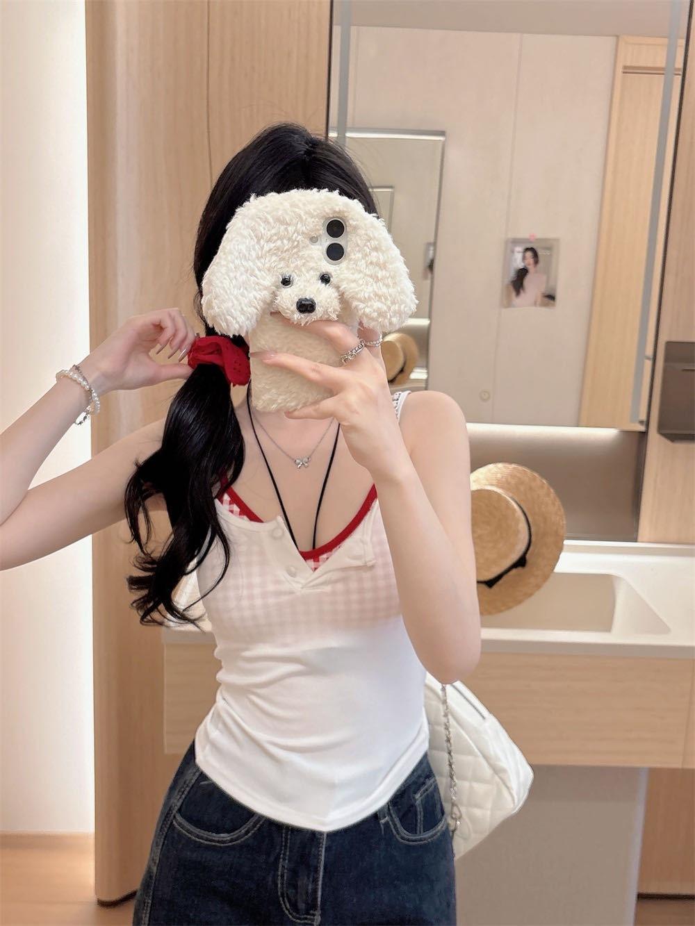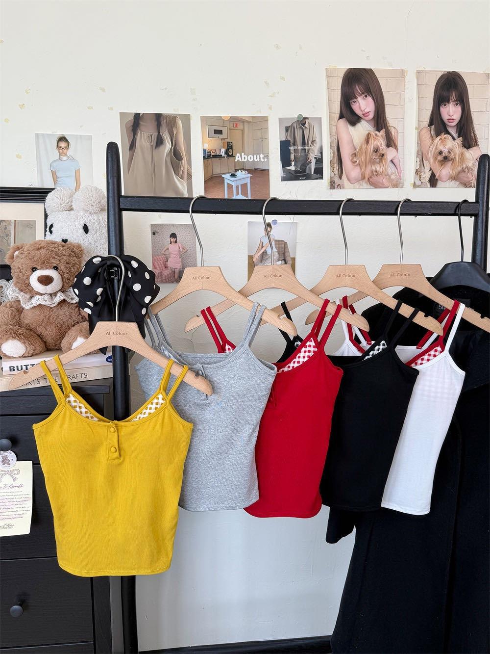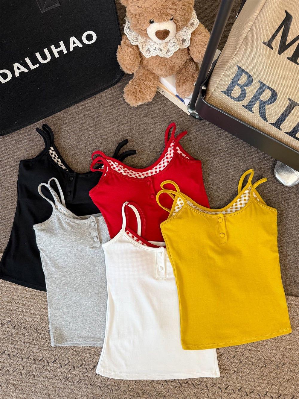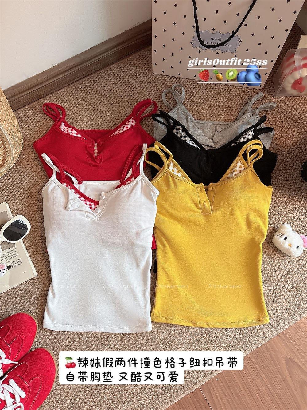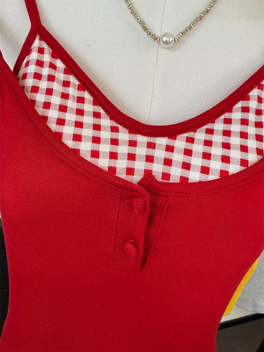 Nuevo Rayón Dos Piezas Chaleco con Botones Versátil Patchwork a Cuadros Integrado con Almohadilla en el Pecho Cómoda Camisola Hermosa Espalda