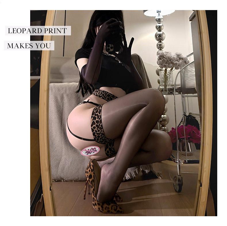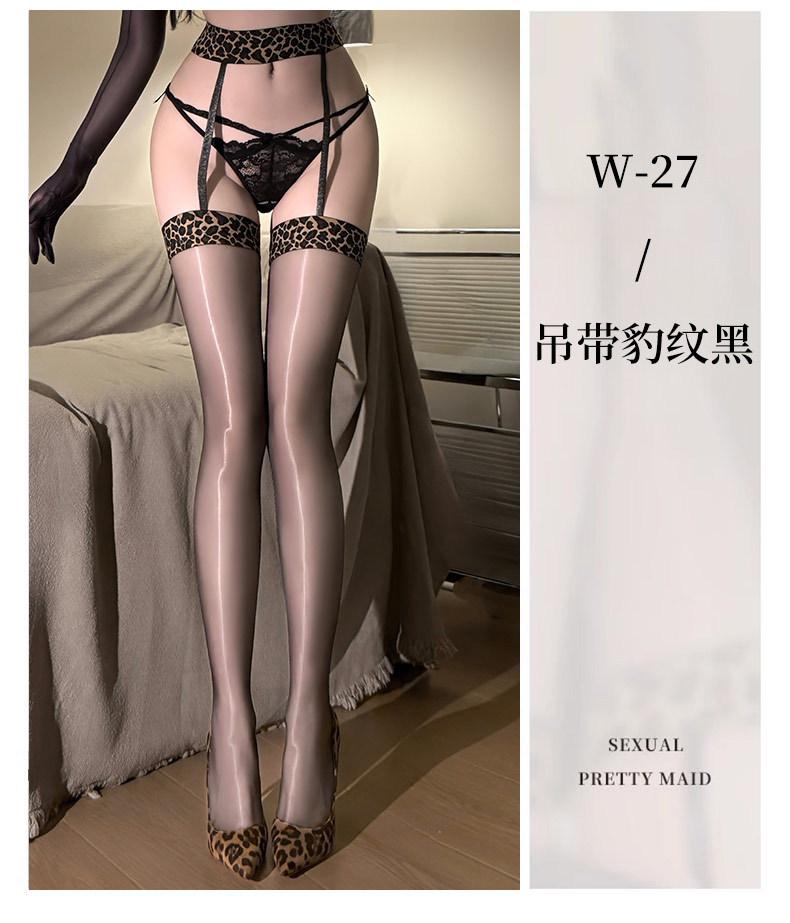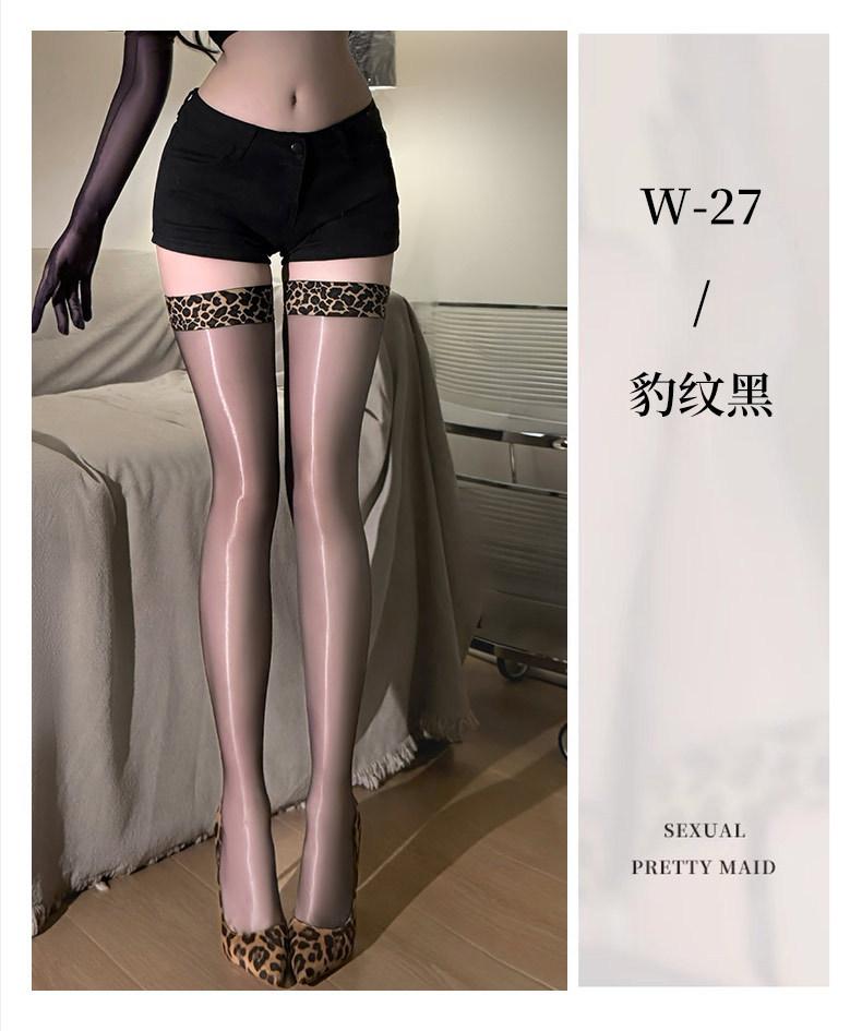 Medias Sexys Estampado de Leopardo Aurora Brillante Hasta el Muslo con Tira Integrada para Mujer Ultradelgadas W-27