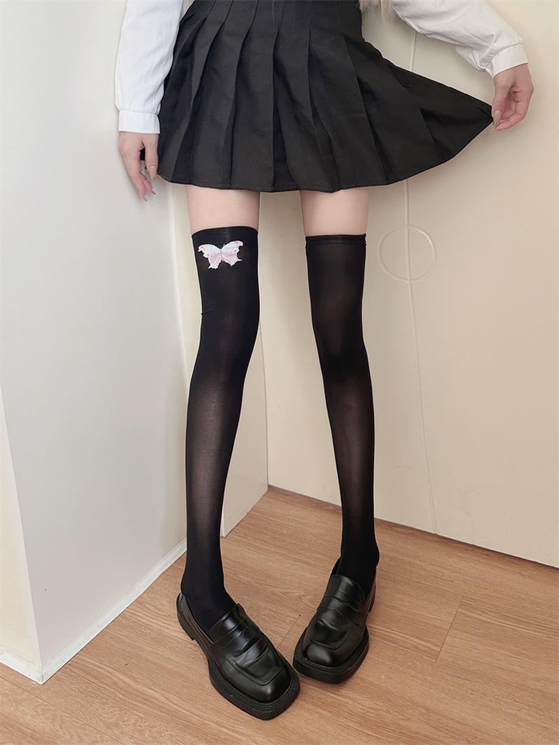 Calcetines hasta el muslo JK Calcetines finos para mujer Negros Verano Lolita Arriba de la rodilla Calcetines estampados Mariposa Medias altas