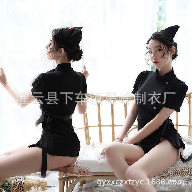 Lencería sexy para mujer, tentación sexy, uniforme de disfraz de enfermera apasionada, traje negro ceñido a las caderas para juego de roles coqueto¥18Compre ya