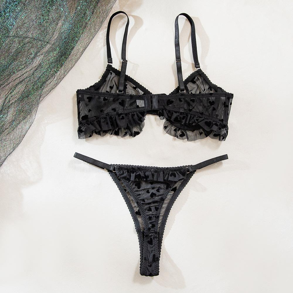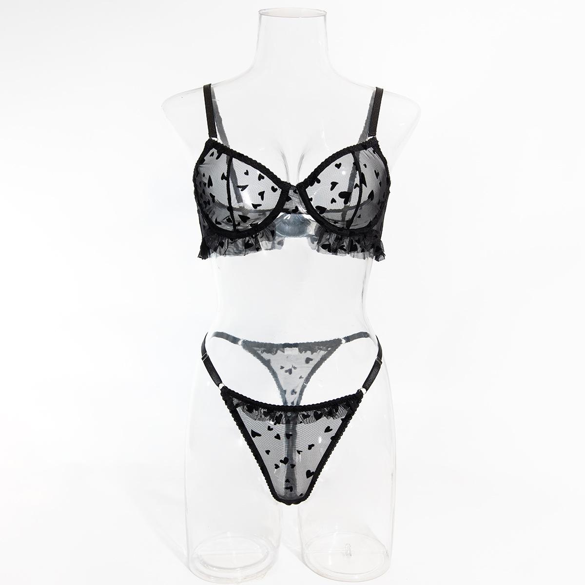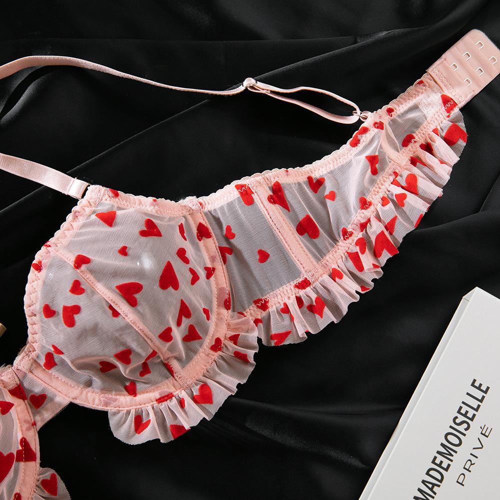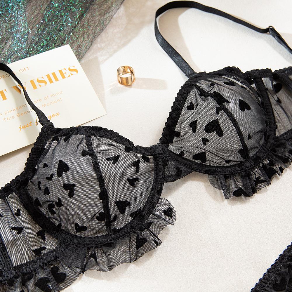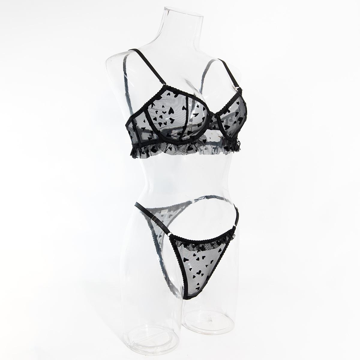 Ropa interior sexy de encaje transfronteriza Ultrafina Perspectiva Corazón Flocado Traje de ropa interior para mujer Pecho grande Sujetador pequeño Verano