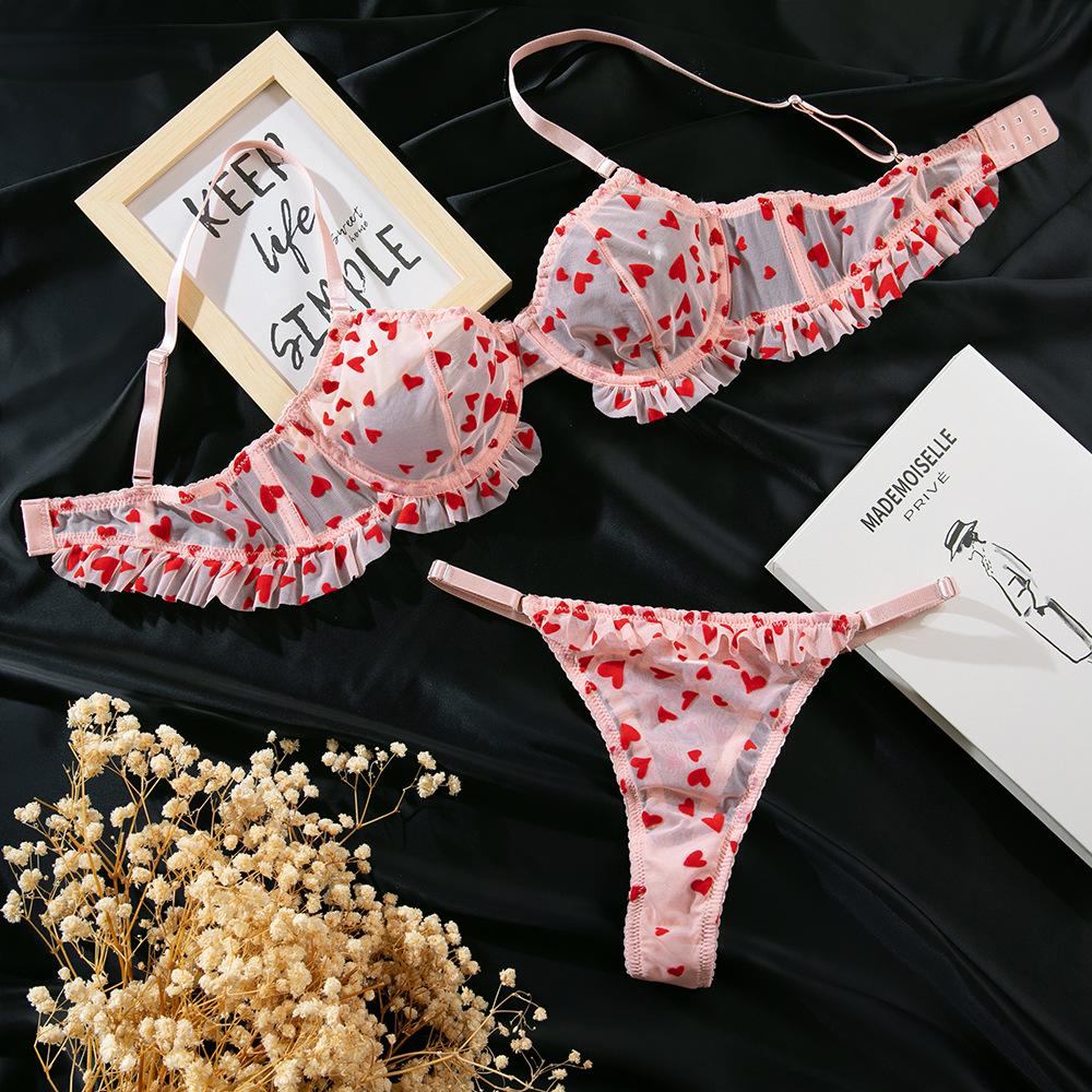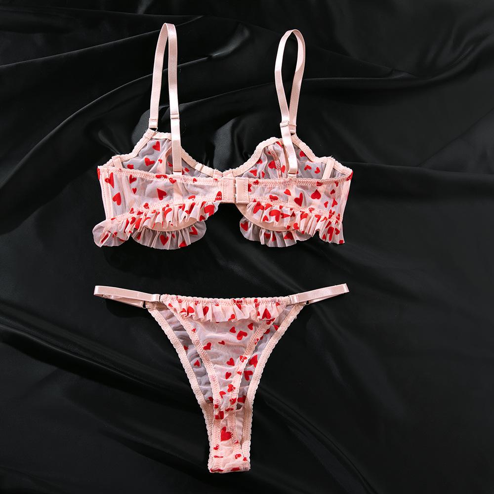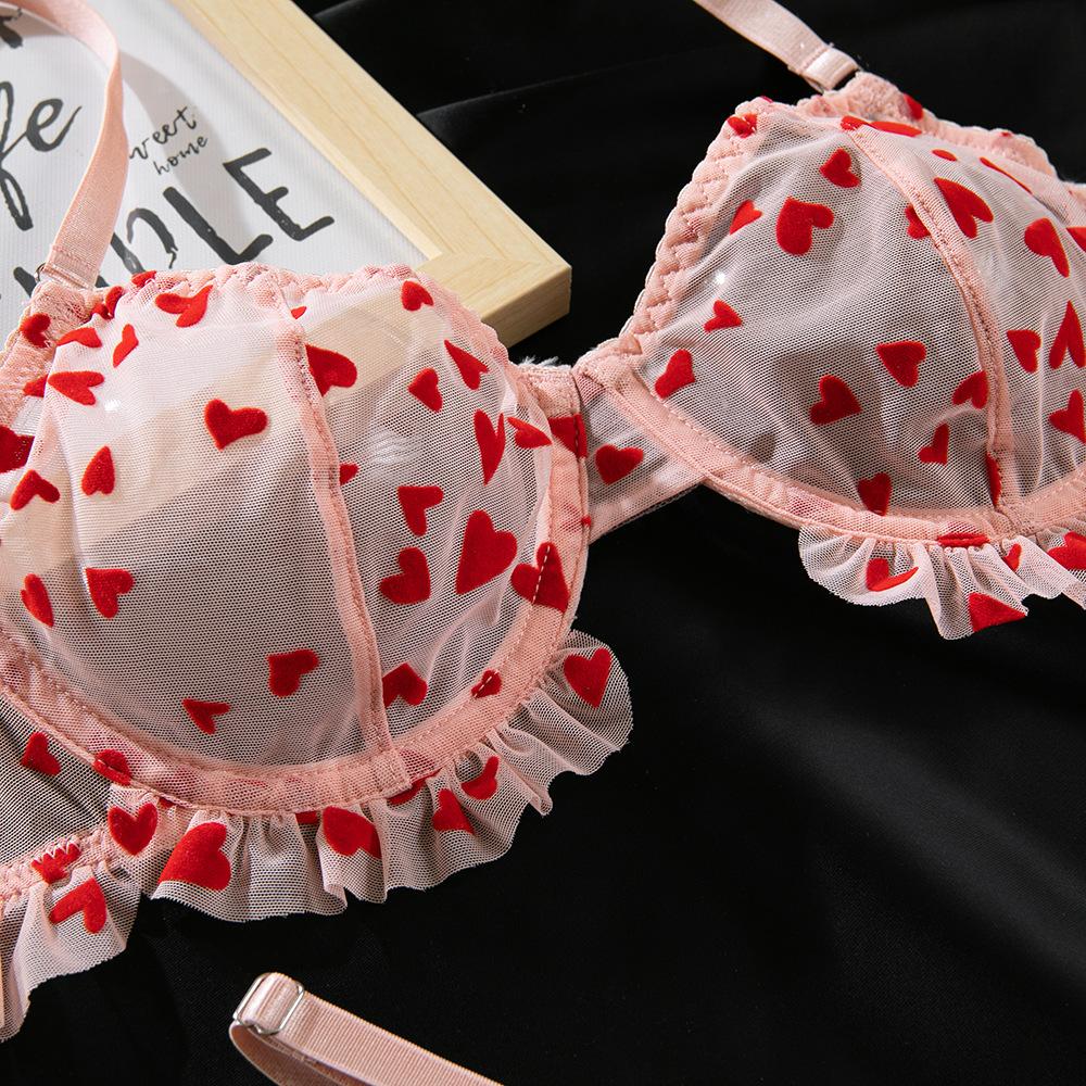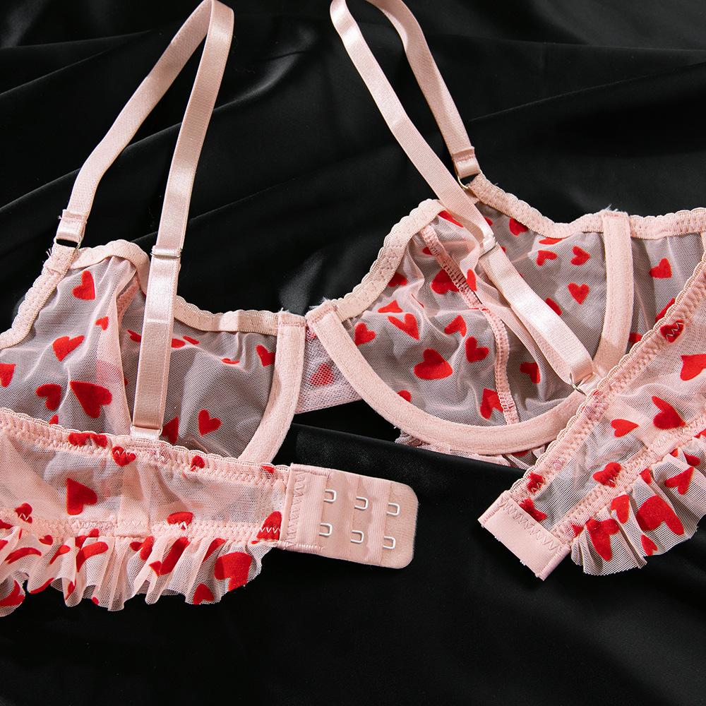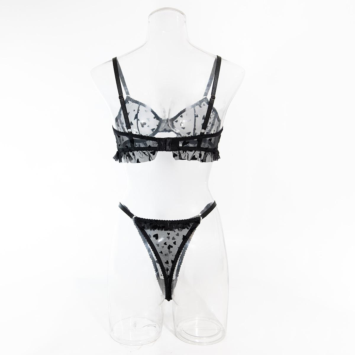 Ropa interior sexy de encaje transfronteriza Ultrafina Perspectiva Corazón Flocado Traje de ropa interior para mujer Pecho grande Sujetador pequeño Verano