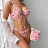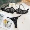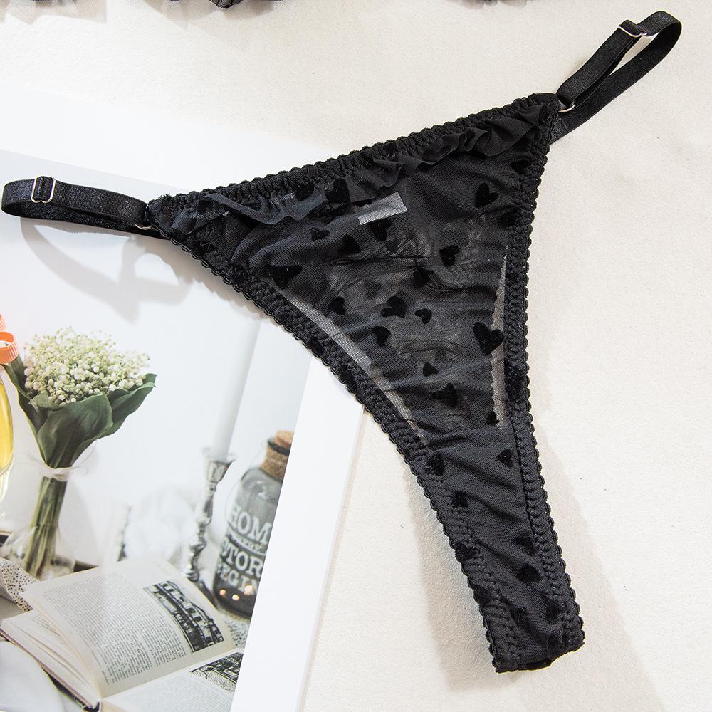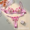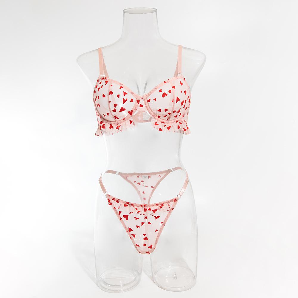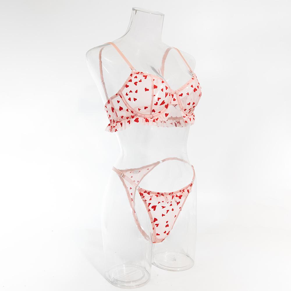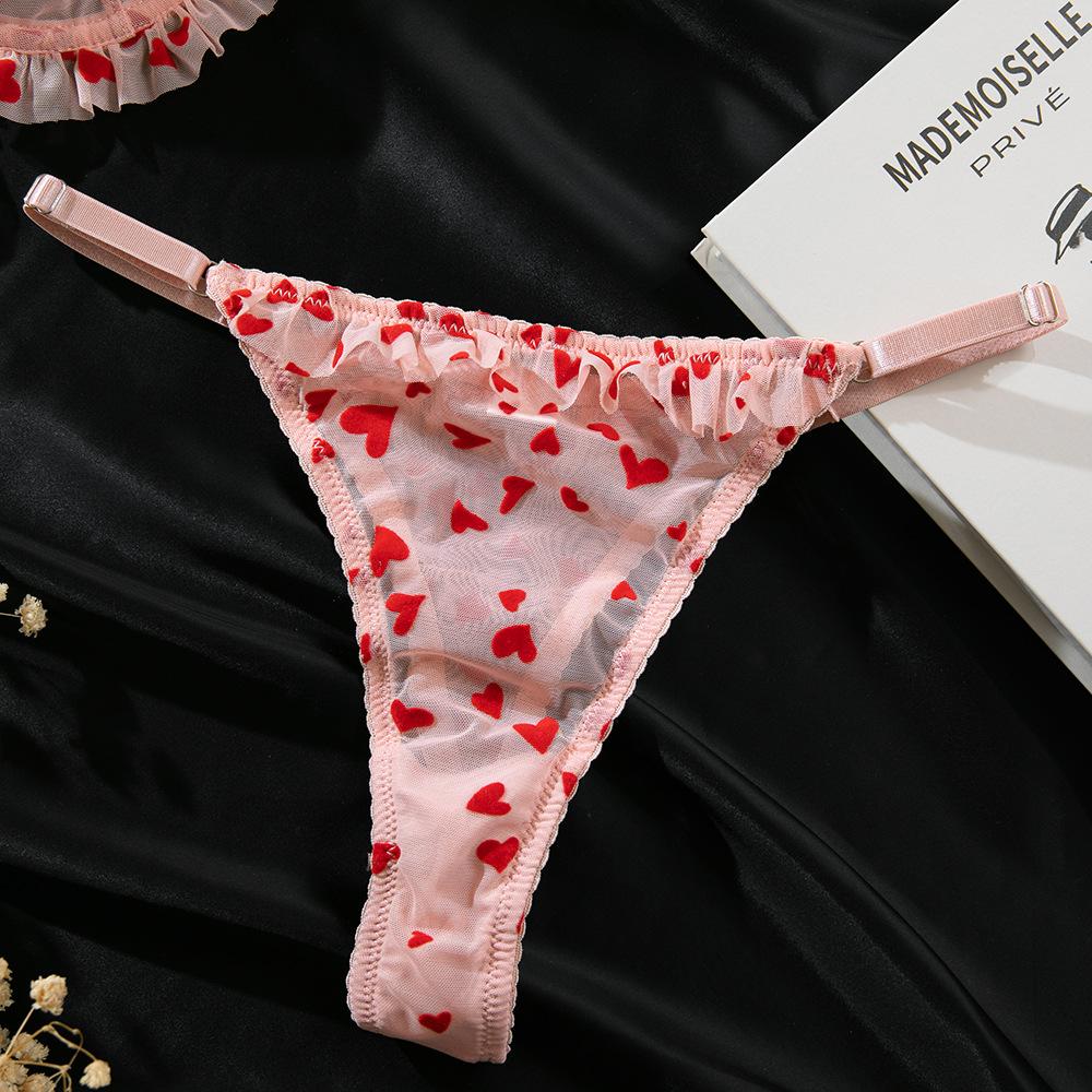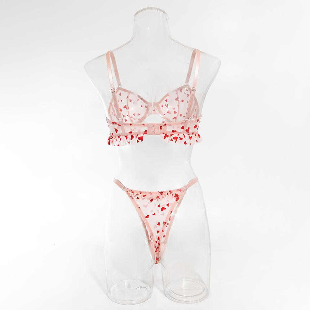 Ropa interior sexy de encaje transfronteriza Ultrafina Perspectiva Corazón Flocado Traje de ropa interior para mujer Pecho grande Sujetador pequeño Verano