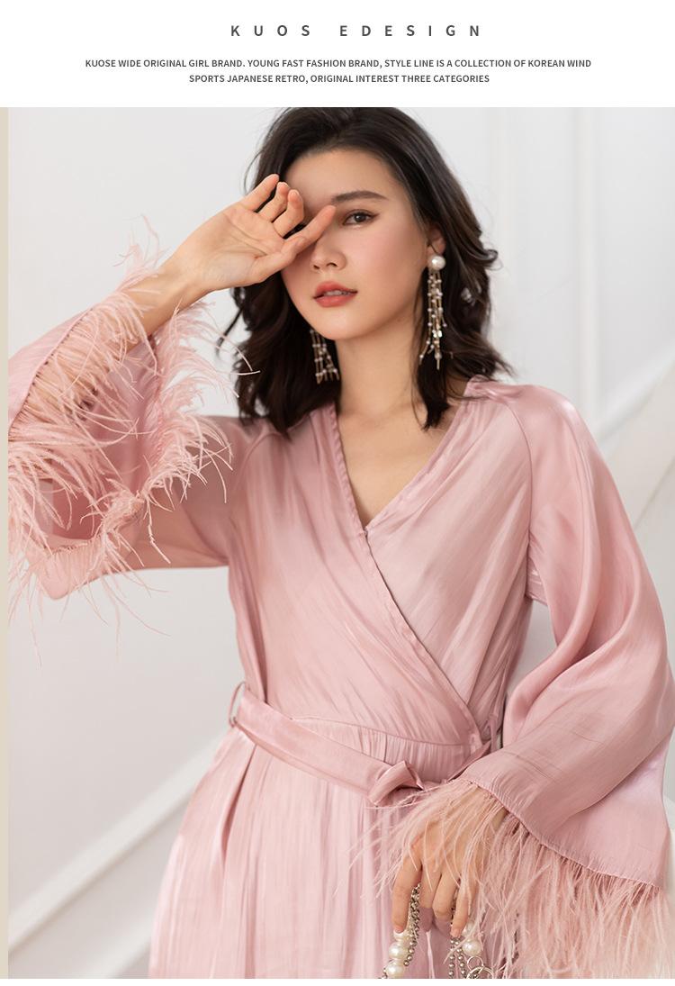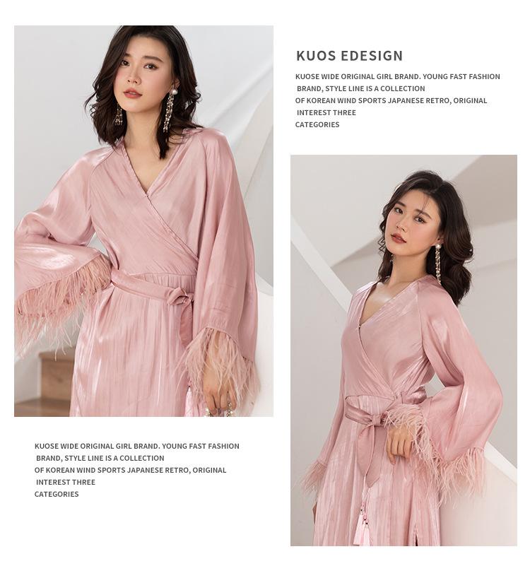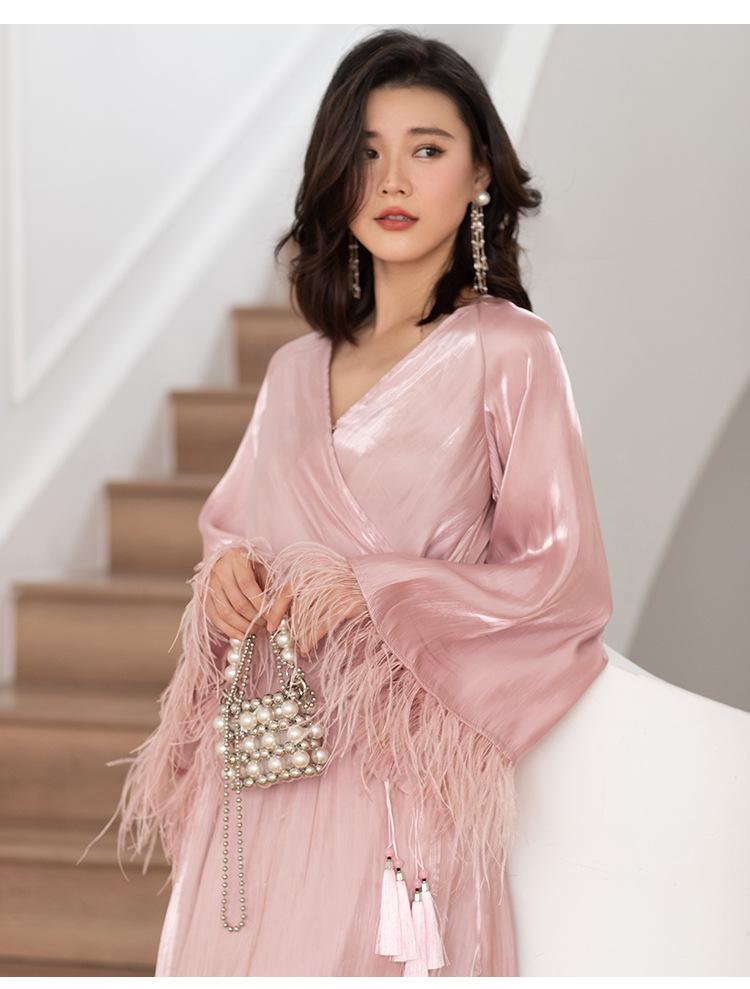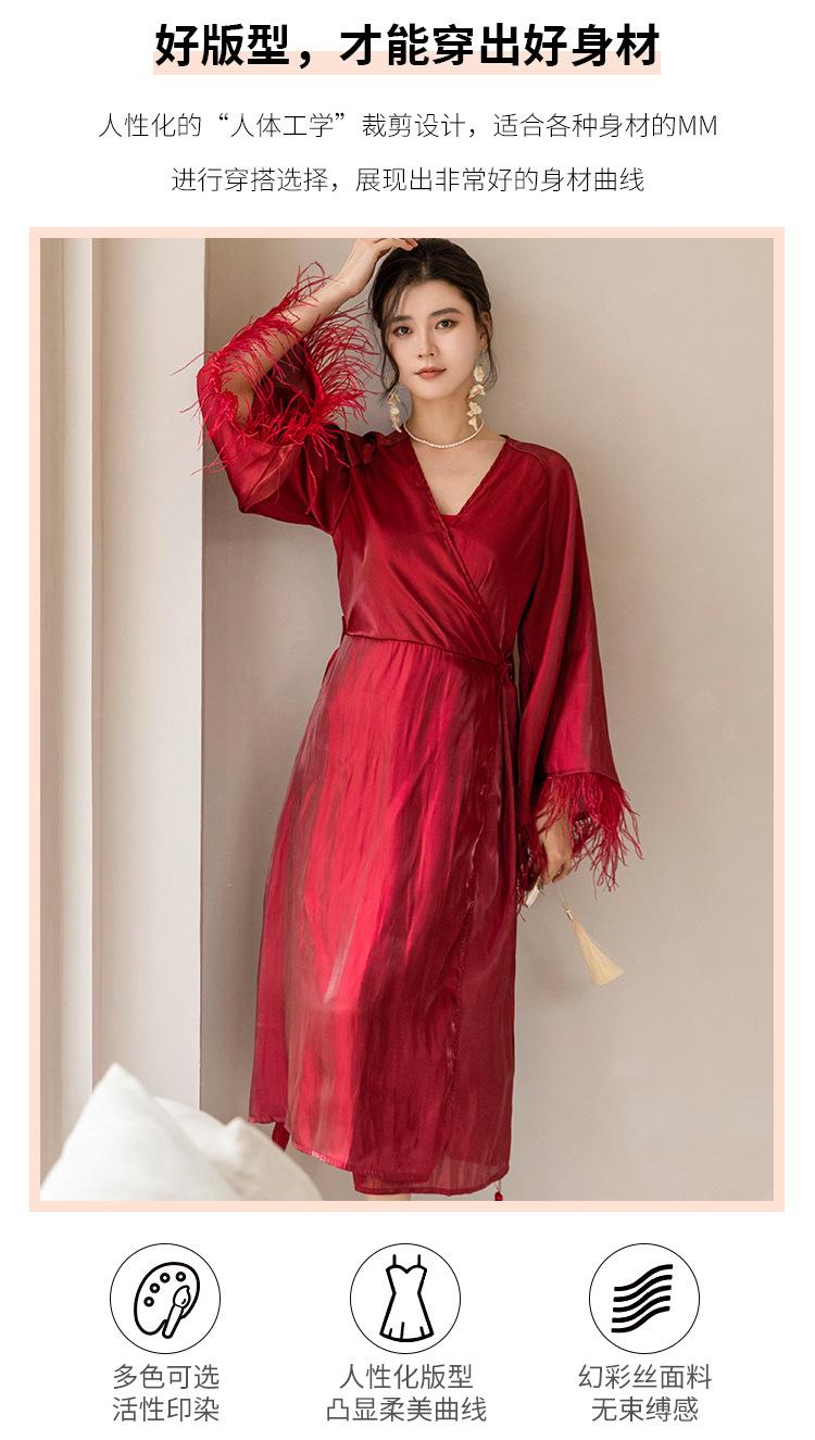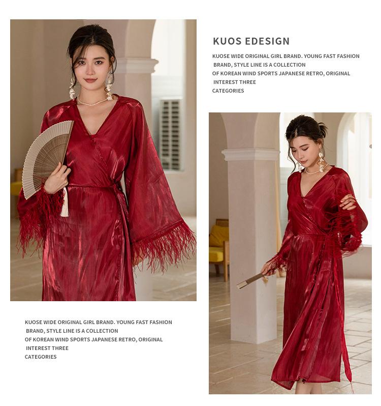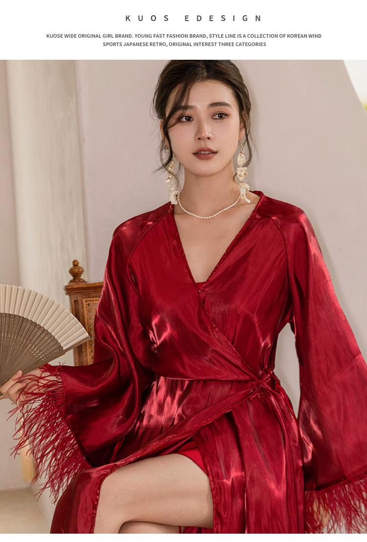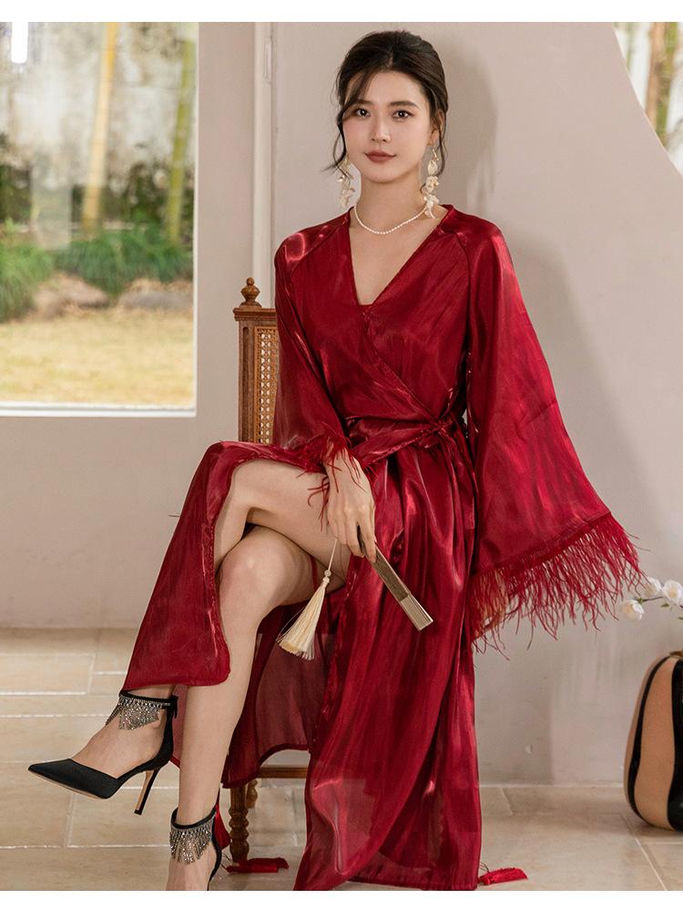 Bata Sexy de Plumas Rosa para Mujer Novia Boda Primavera Otoño Verano Boda Francesa Camisón de Dama de Honor de Alta Gama Conjunto de Dos Piezas