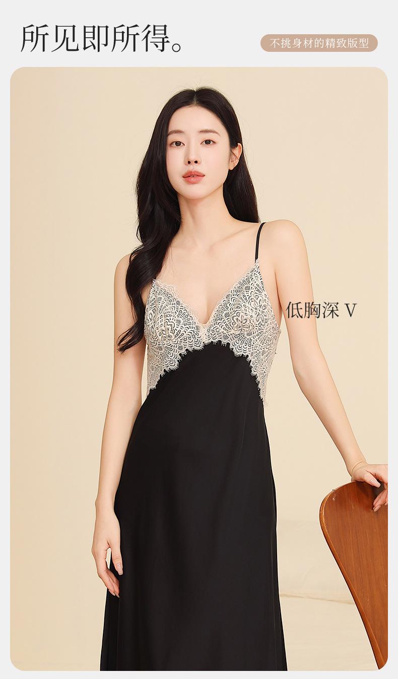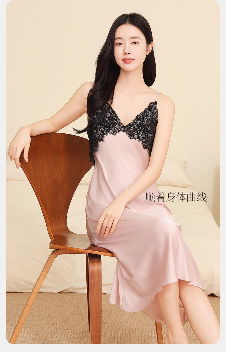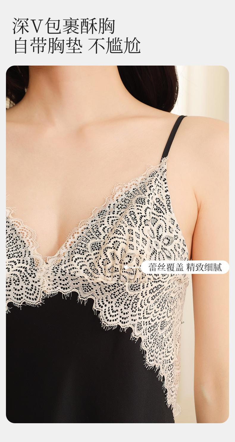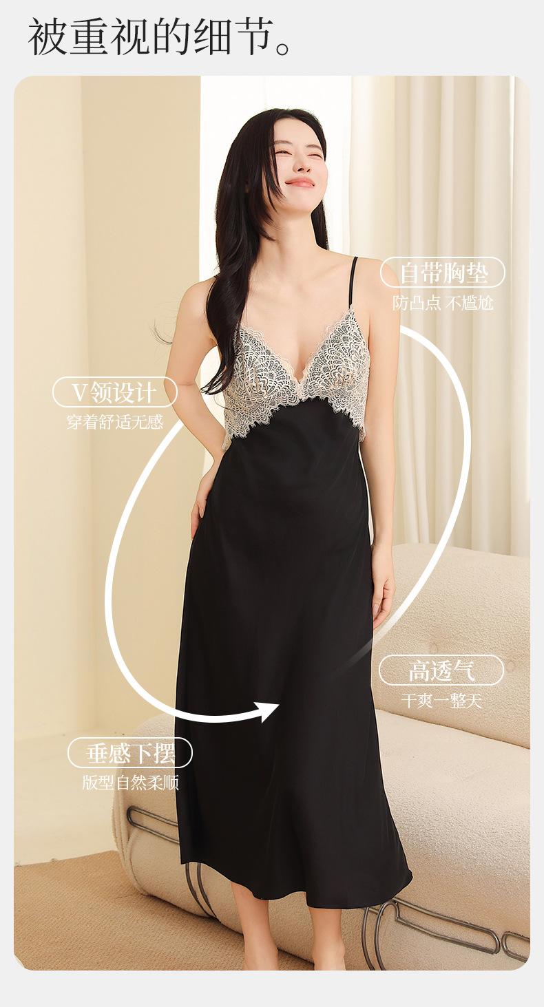Yu Zhaolin Pijama Sexy de Encaje para Mujer Verano Seda de Hielo Francés Falda con Tirantes Camisón Ropa para el Hogar Falda Larga con Almohadillas en el Busto